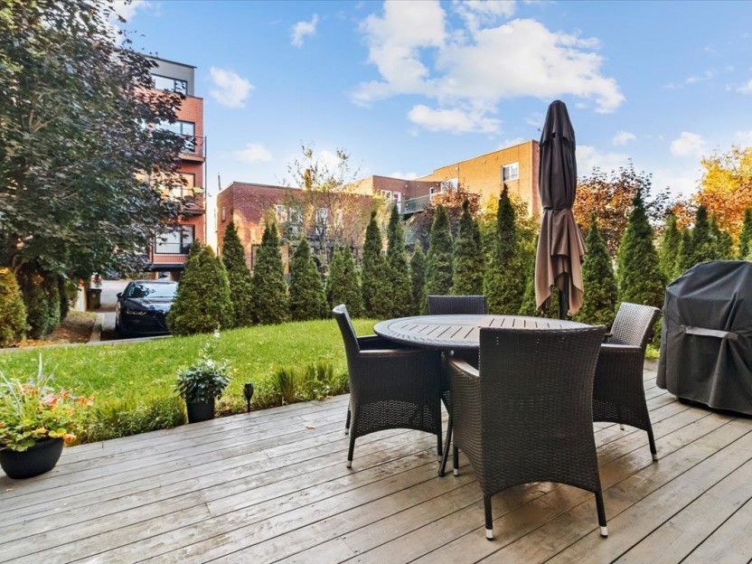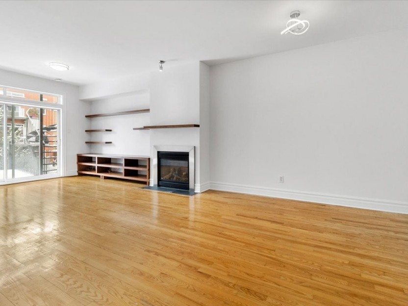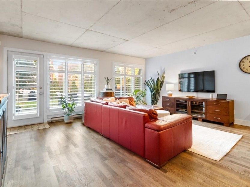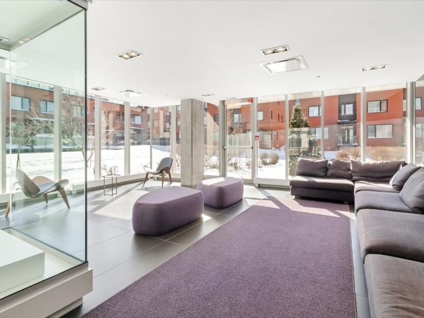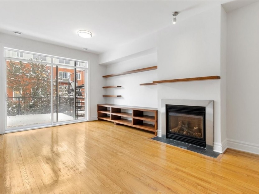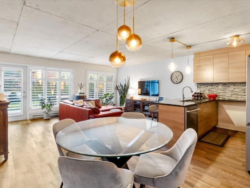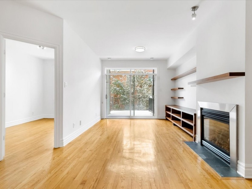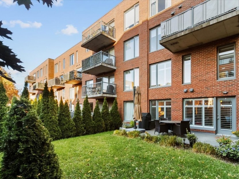 Superbe condo à aire ouverte avec foyer au gaz, 2 chambres et grande terrasse arrière donnant sur un magnifique jardin intérieur paysagé ave...