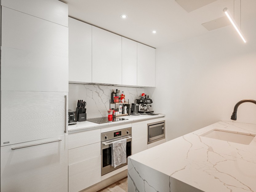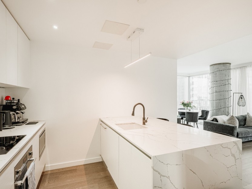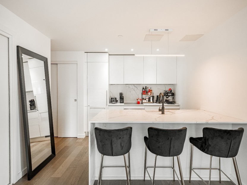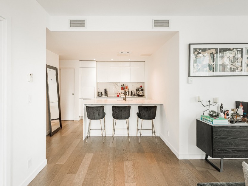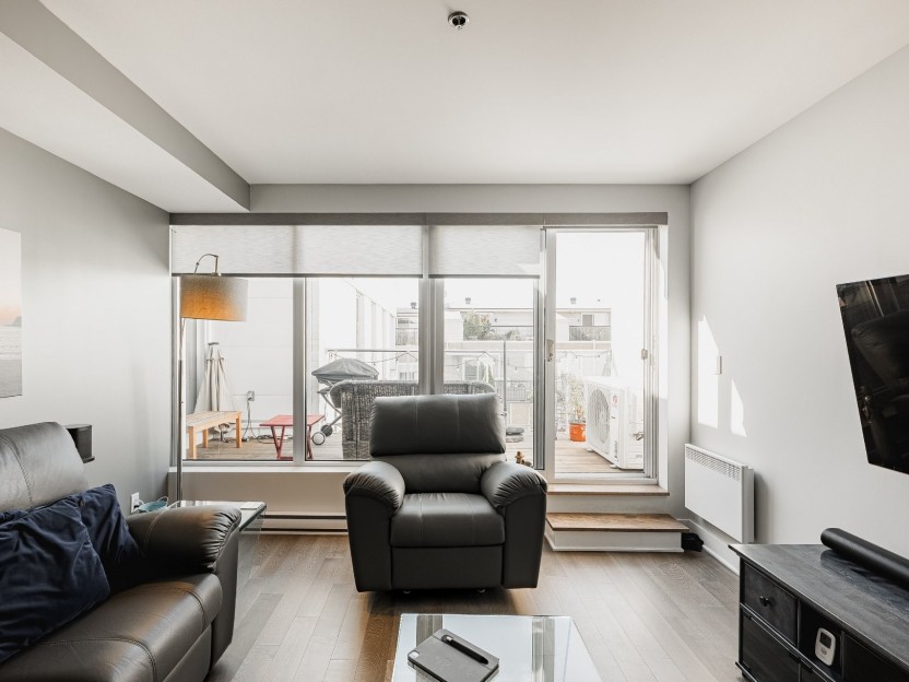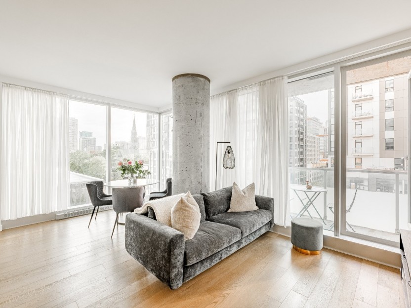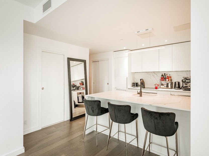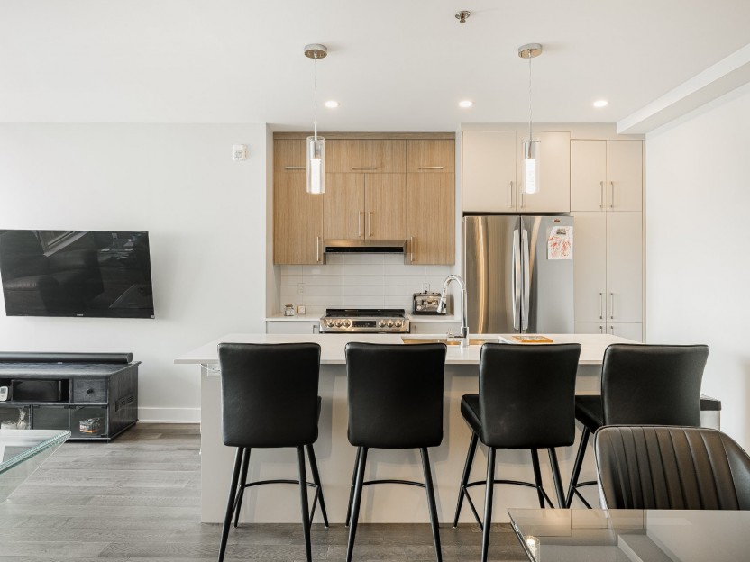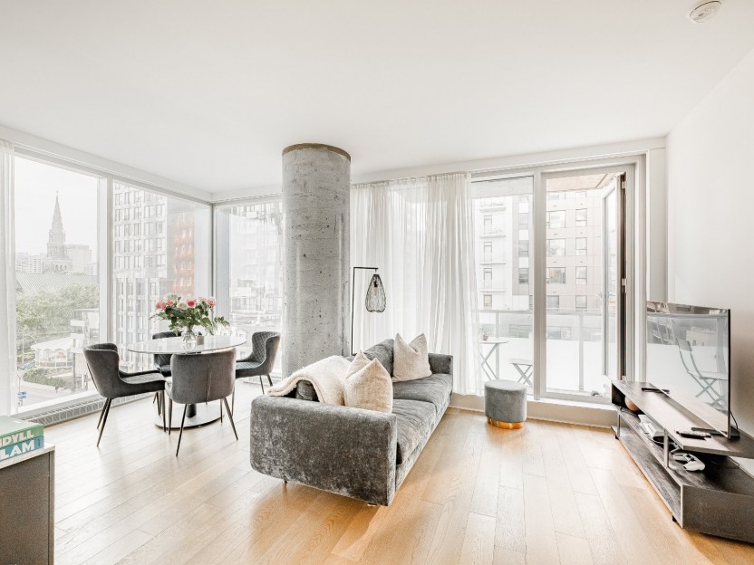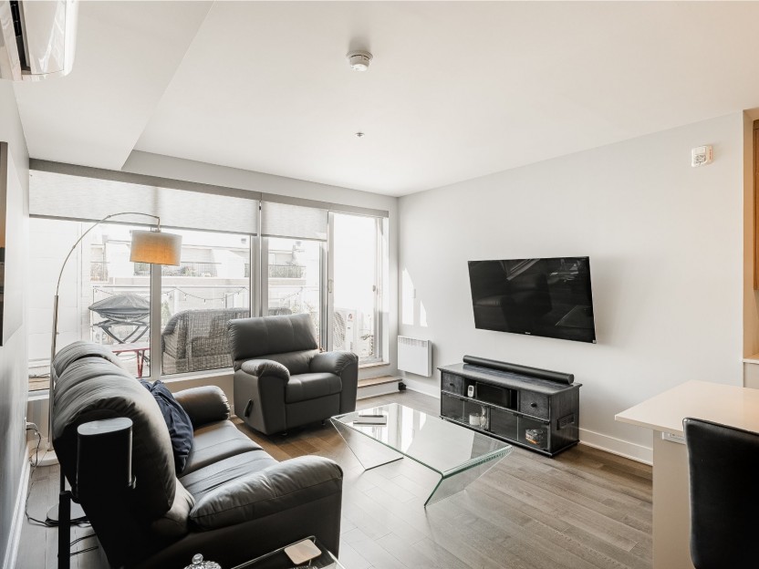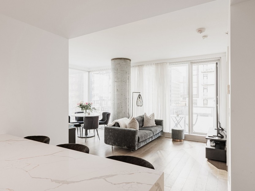Unité de coin partiellement meublé moderne au YUL avec 2 chambres, 1 salle de bain et espace lumineux à aire ouverte. Fenêtres pleine hauteu...