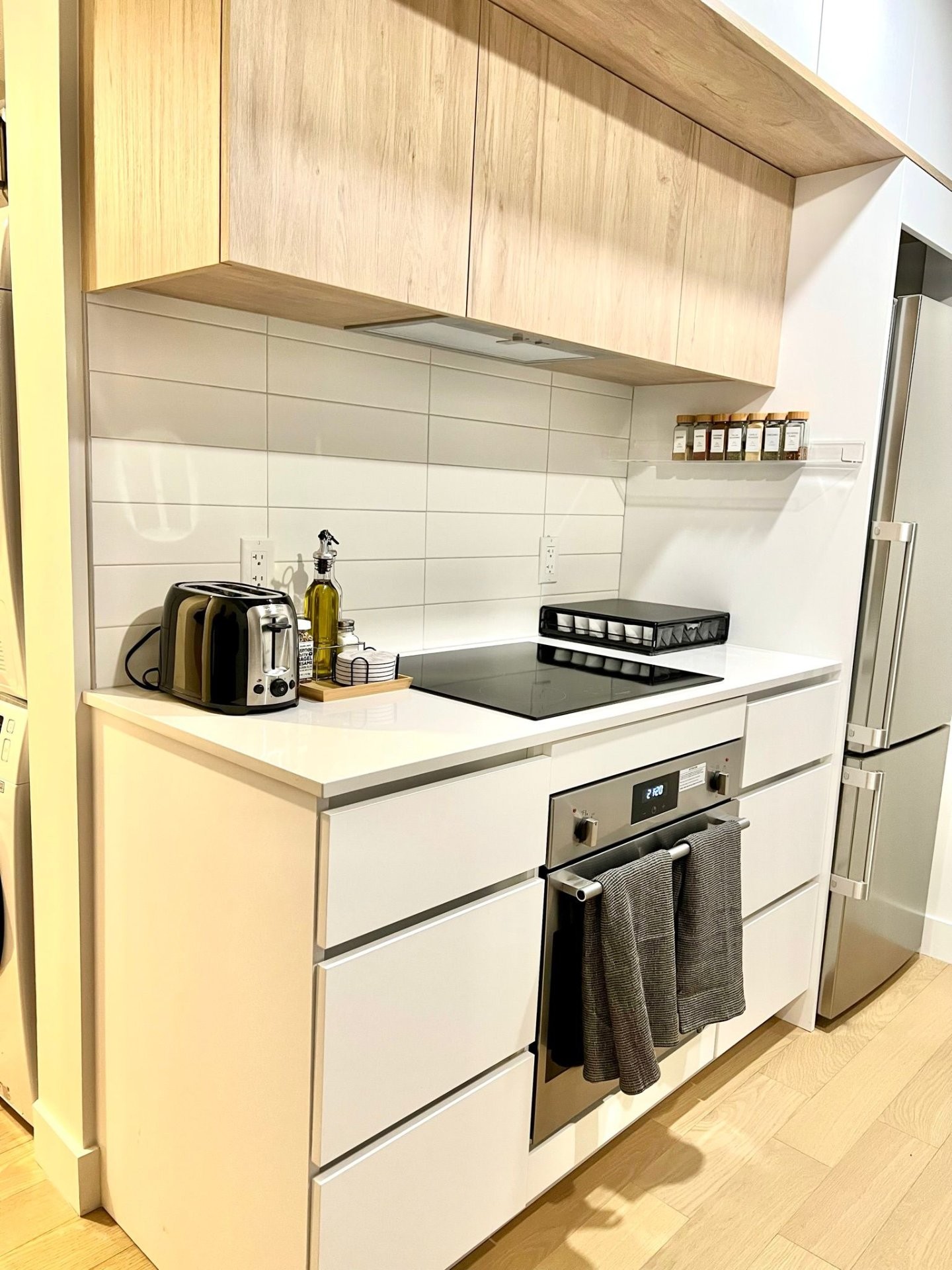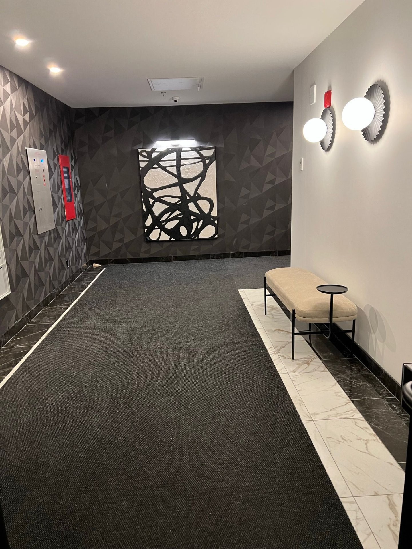 Unité de coin partiellement meublé moderne au YUL avec 2 chambres, 1 salle de bain et espace lumineux à aire ouverte. Fenêtres pleine hauteu...