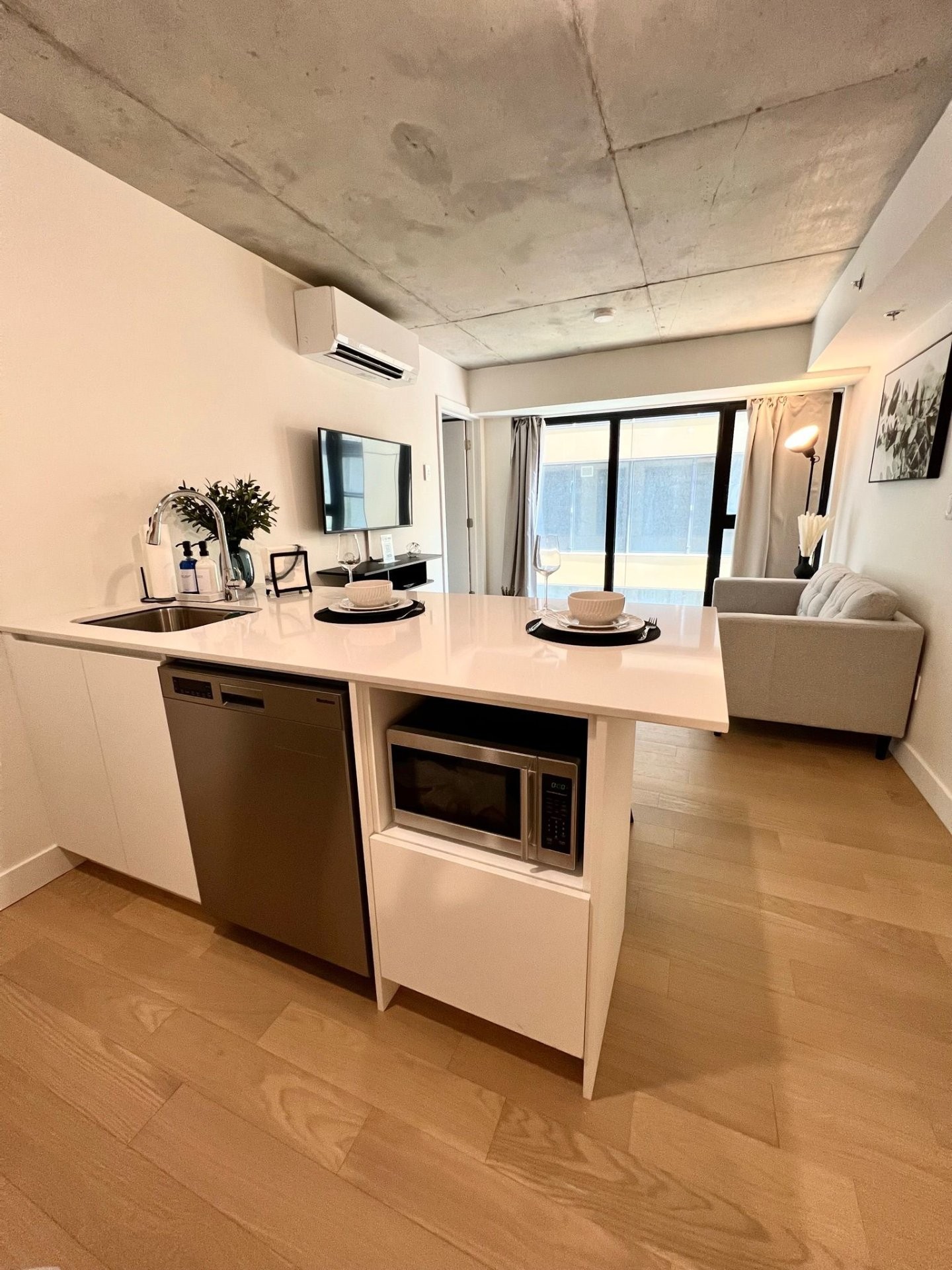 Vivez au coeur de Montréal ! Condo neuf d'une chambre à coucher disponible immédiatement. Peut aussi être loué à court terme. Le chauffage et les électroménagers sont inclus. À distance de marche de China Town, du Palais des congrès, de la station de métro, de l'hôpital et du Vieux-Montréal. Ne manquez pas cette opportunité !