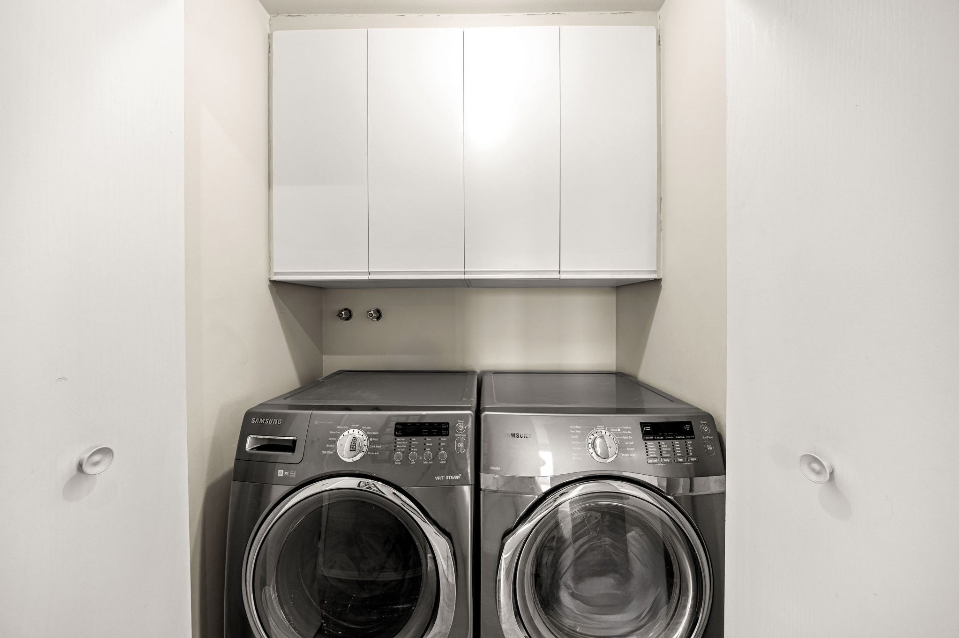 Électroménagers (Cuisinière, réfrigérateur, micro-onde, laveuse, sécheuse), tempo, aspirateur central et accessoires.
