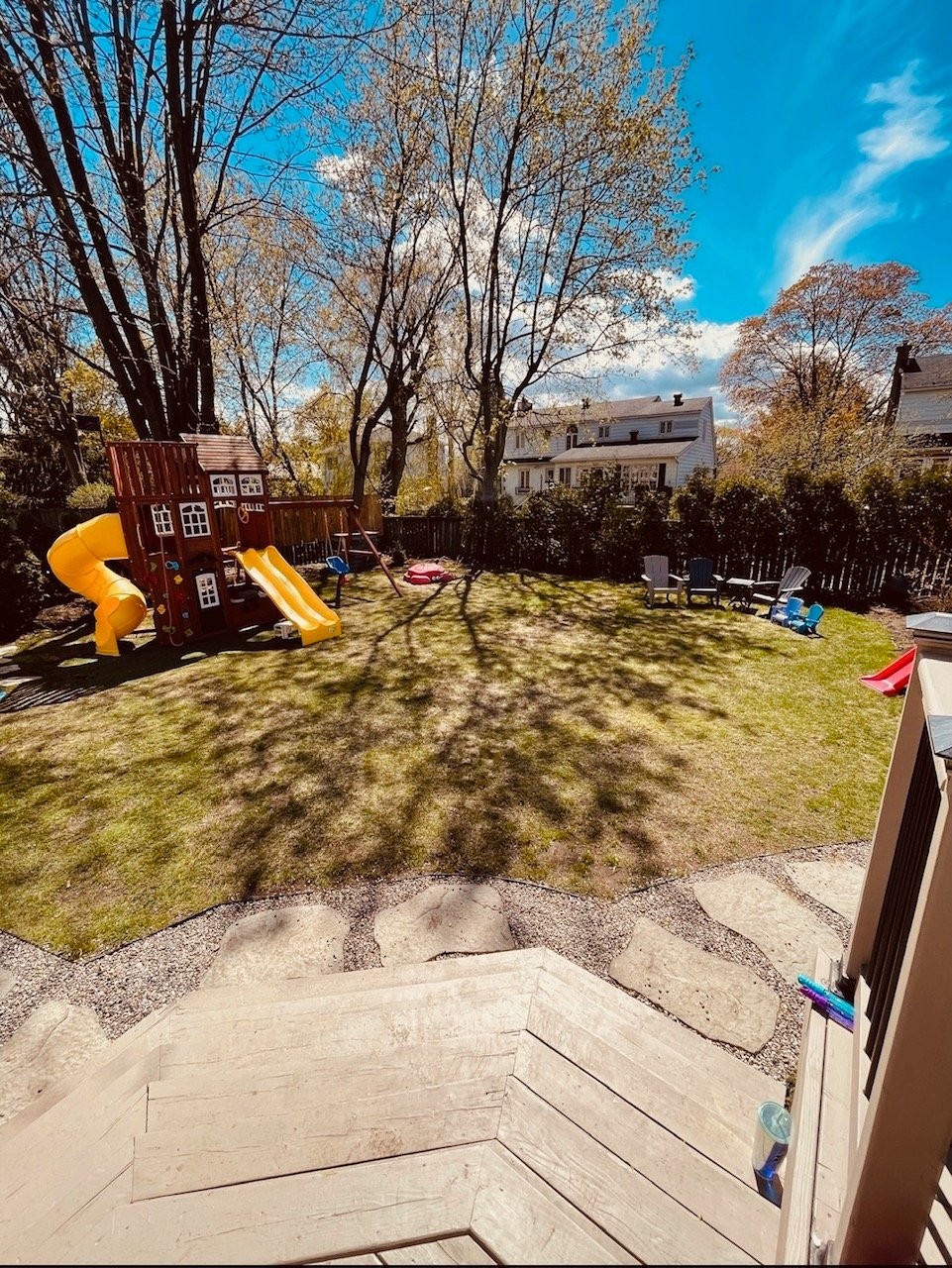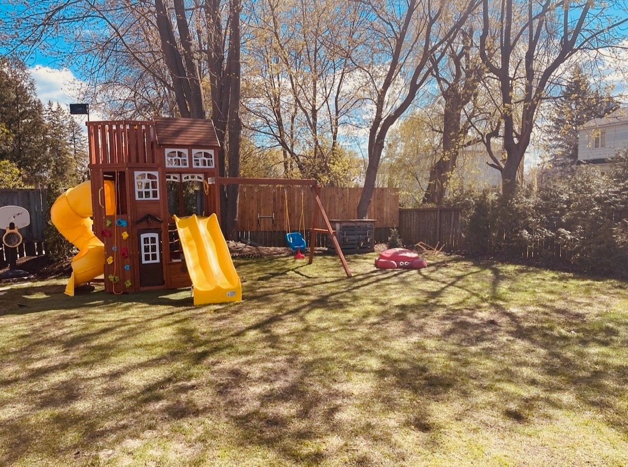 Électroménagers de cuisine (réfrigérateur, cuisinière, lave-vaisselle), laveuse/sécheuse, réfrigérateur dans la buanderie, stores (Hunter Douglas et Levolor), luminaires, téléviseur dans la salle familiale, structure de jeux extérieure, armoires encastrées : salle de jeux, salle familiale, chambre de la fille, chambre principale, salle de jeux du sous-sol et vestibule