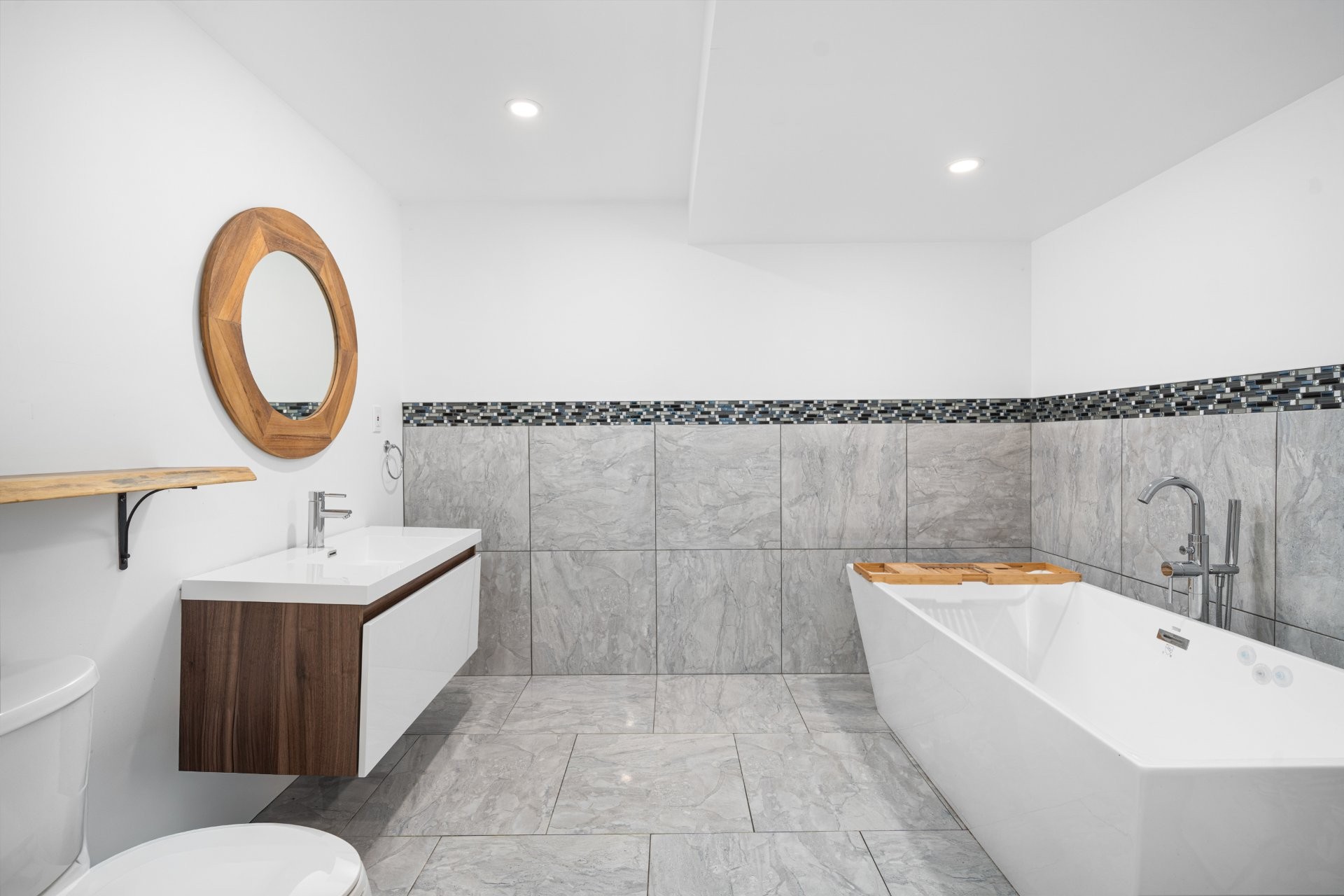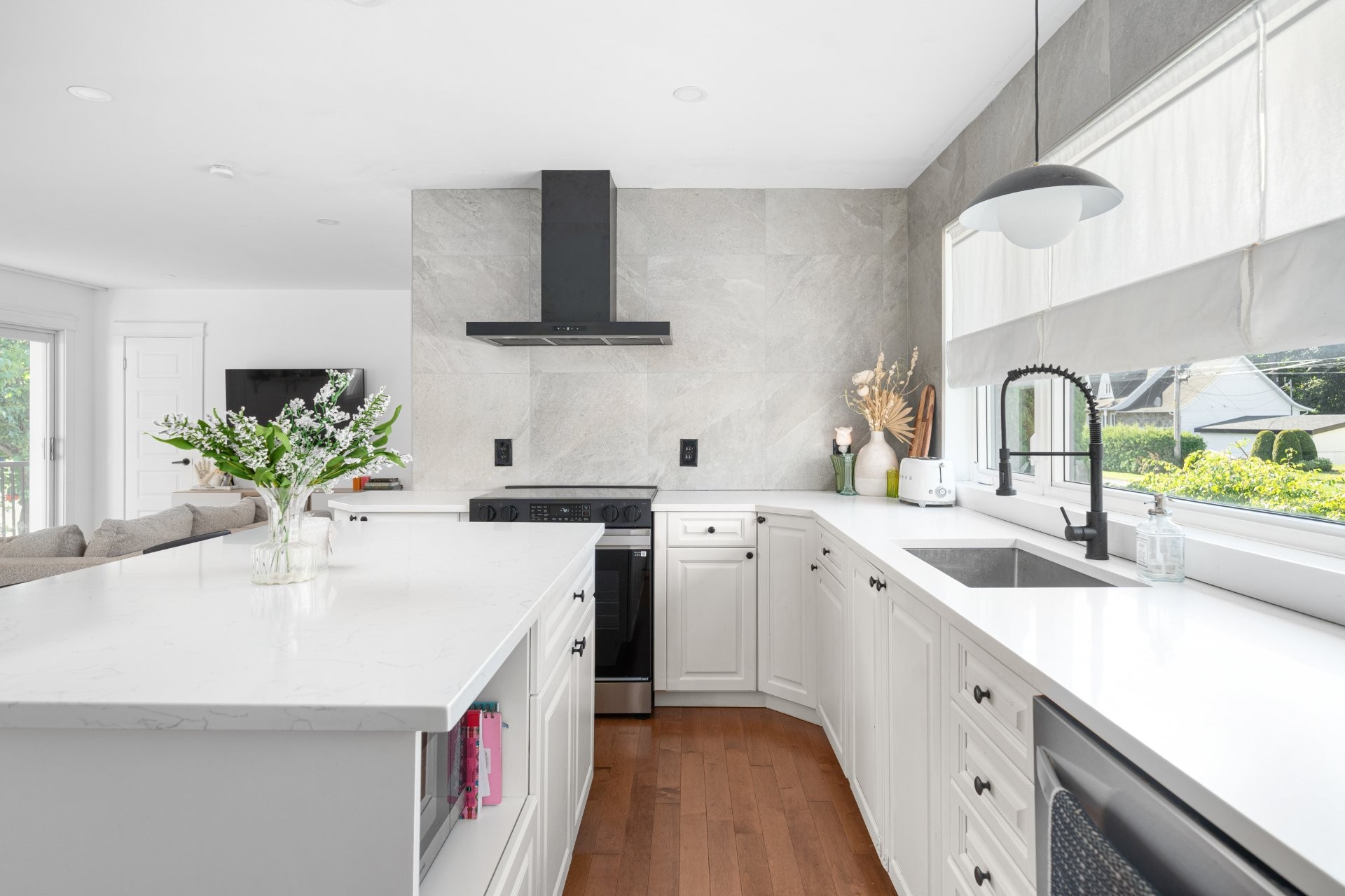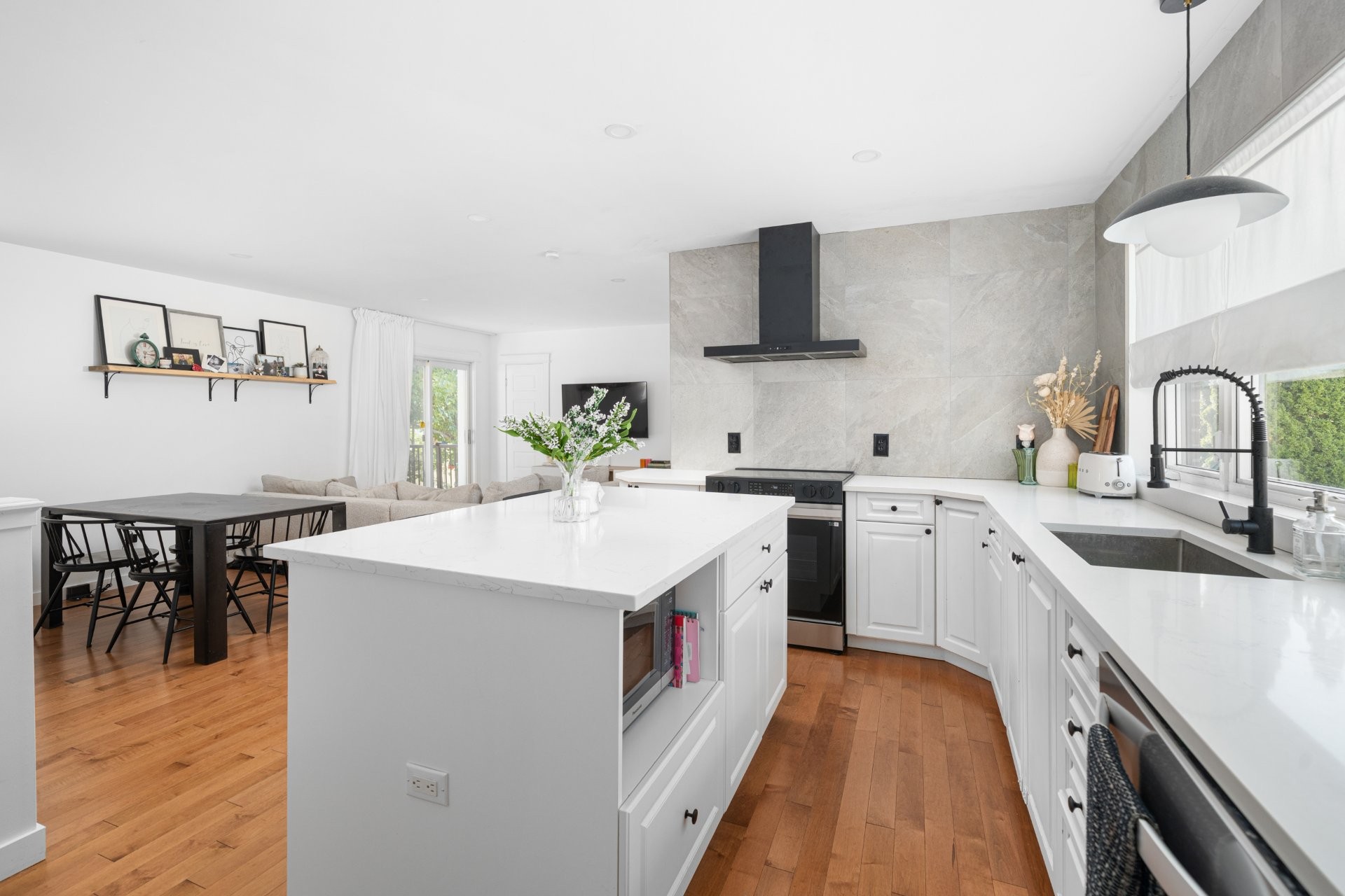 - Rénovations à la cuisine comprenant l'ajout d'un îlot, l'installation d'un dosseret, le retrait de certaines armoires, le remplacement de la hotte et du robinet, ainsi que la construction d'un mur décoratif pour encastrer le réfrigérateur.