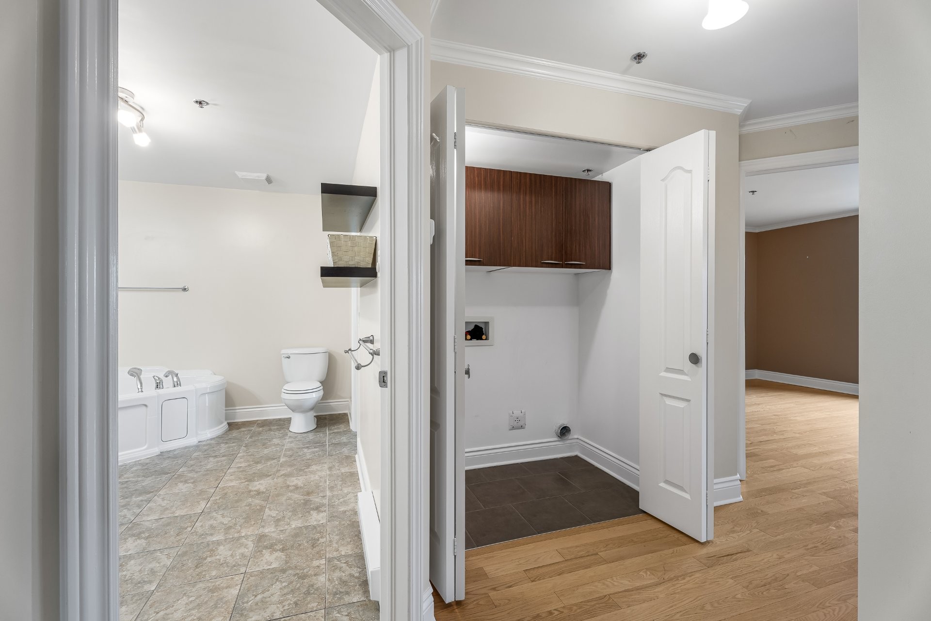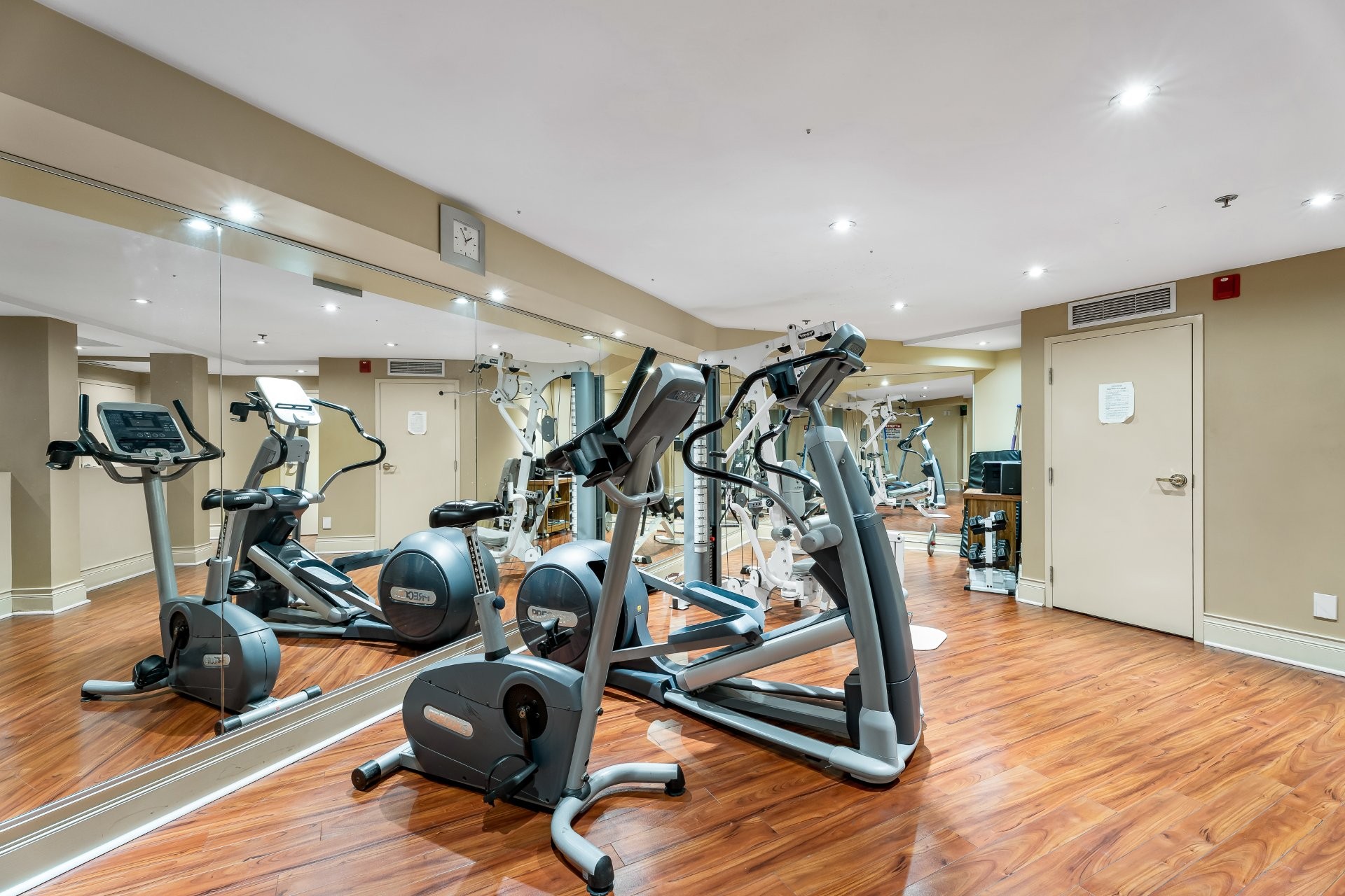 Les caractéristiques supplémentaires incluent un système central (chauffage/climatisation), un aspirateur central, ainsi qu'une place de stationnement au garage, assurant confort et tranquillité d'esprit en toute saison. Les résidents ont aussi accès à un gym bien équipé, un atout considérable dans l'immeuble.