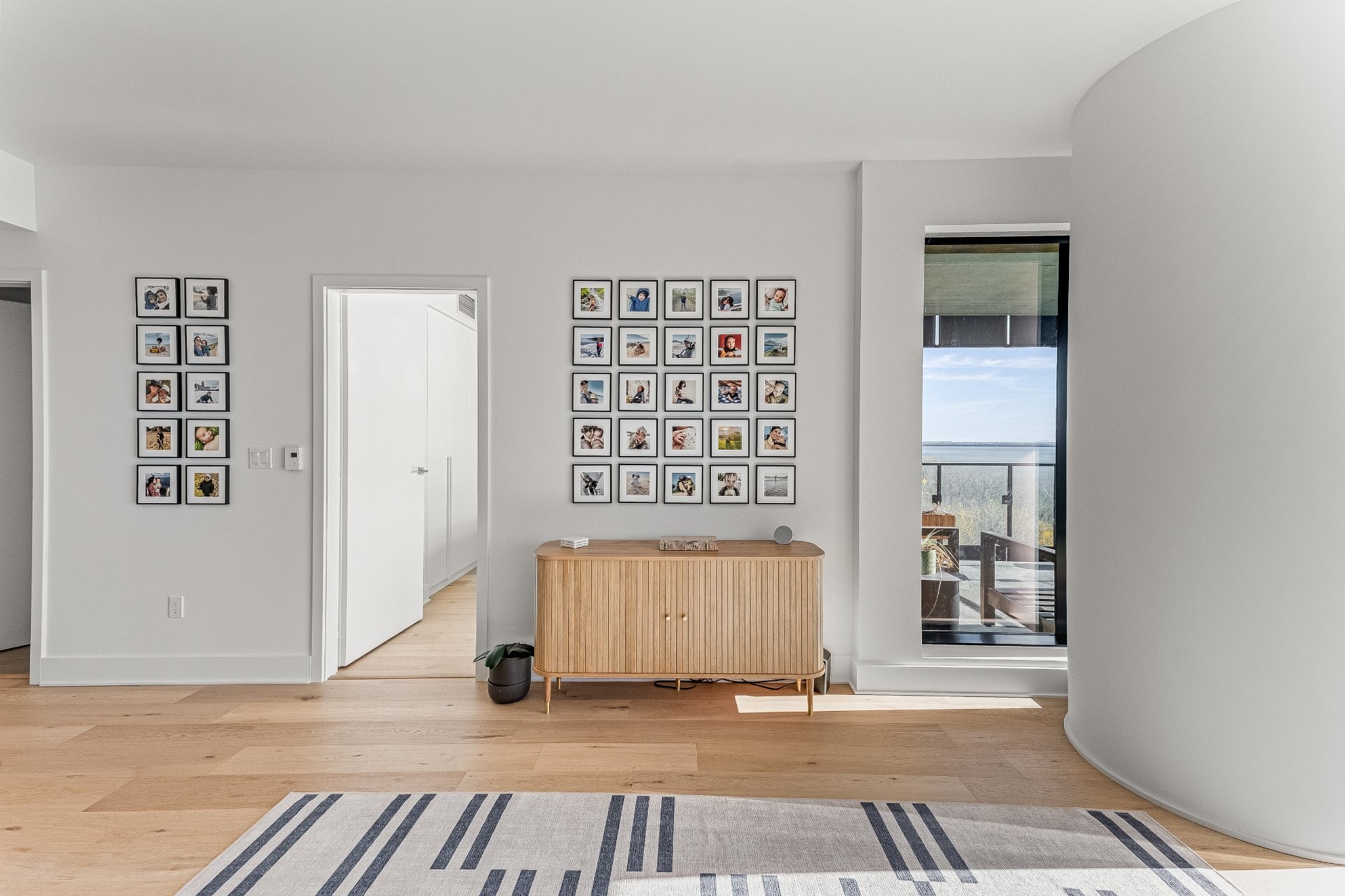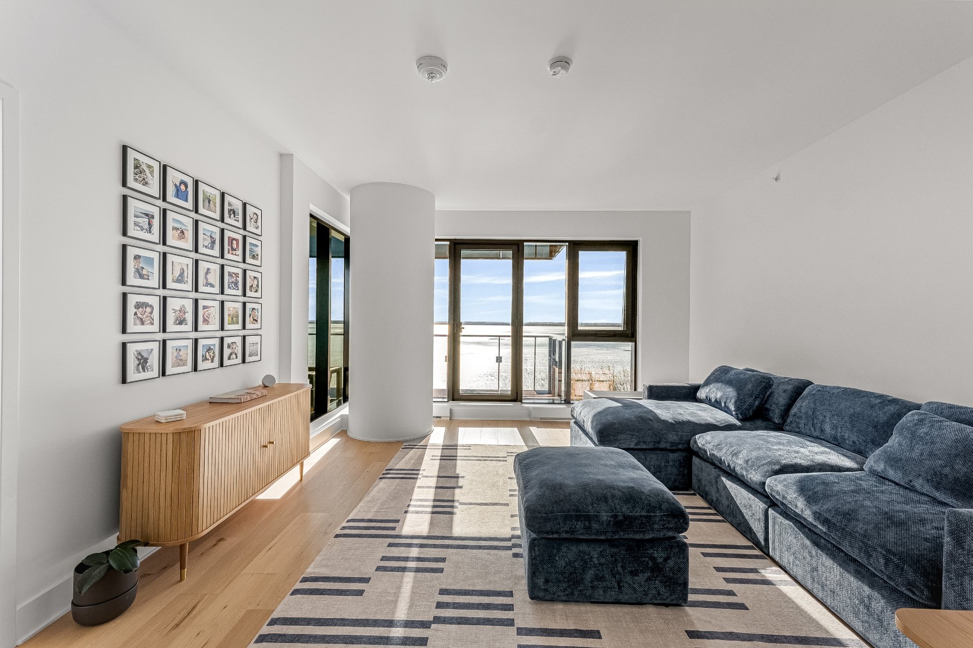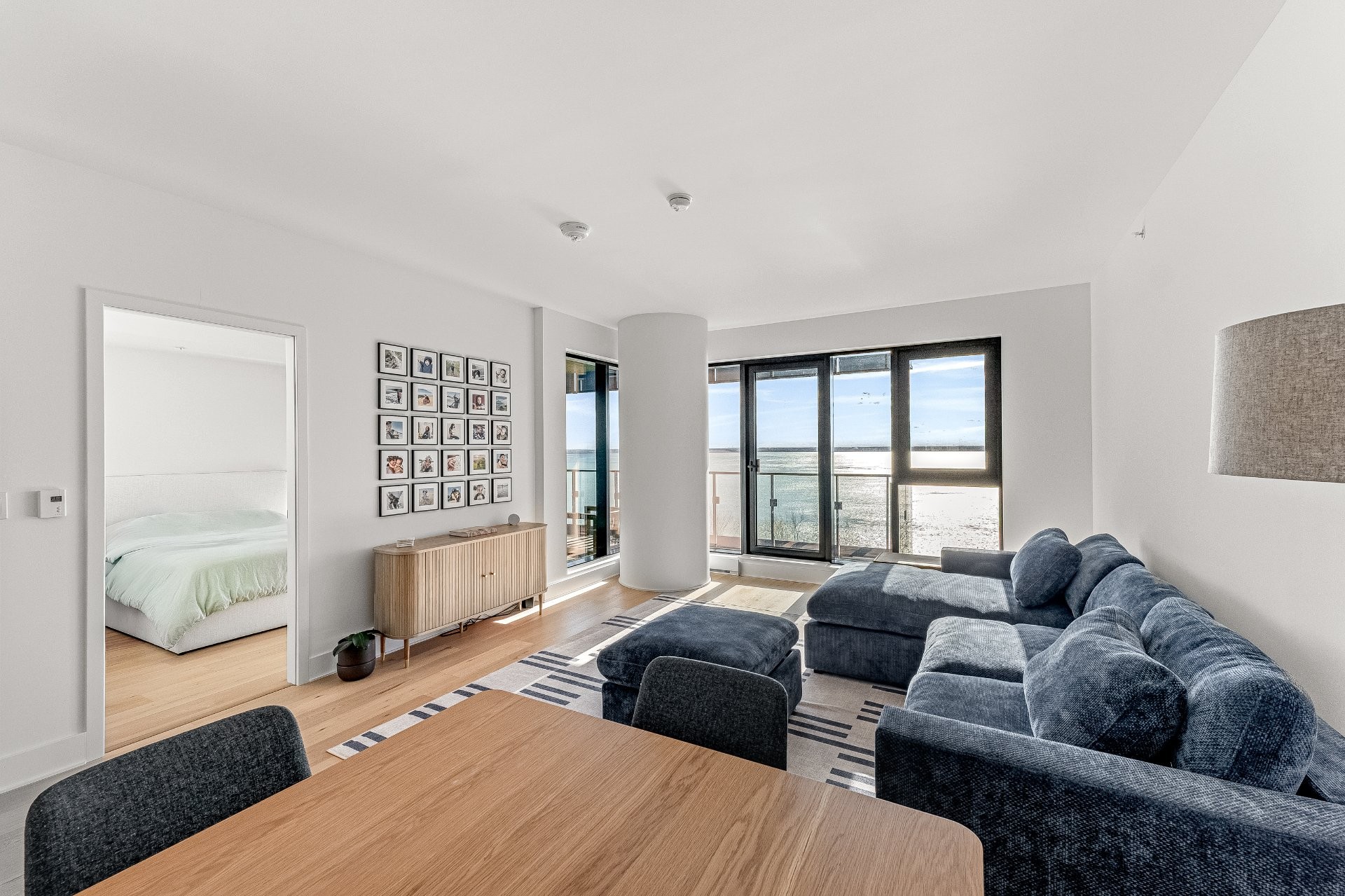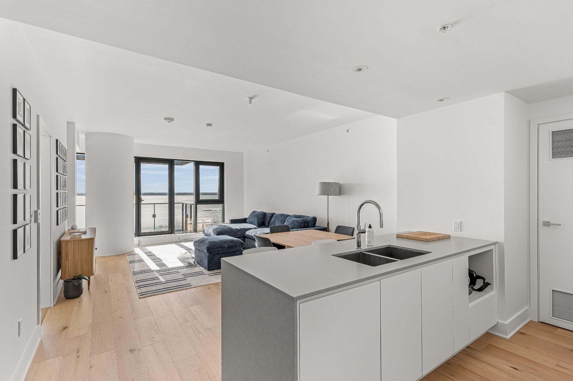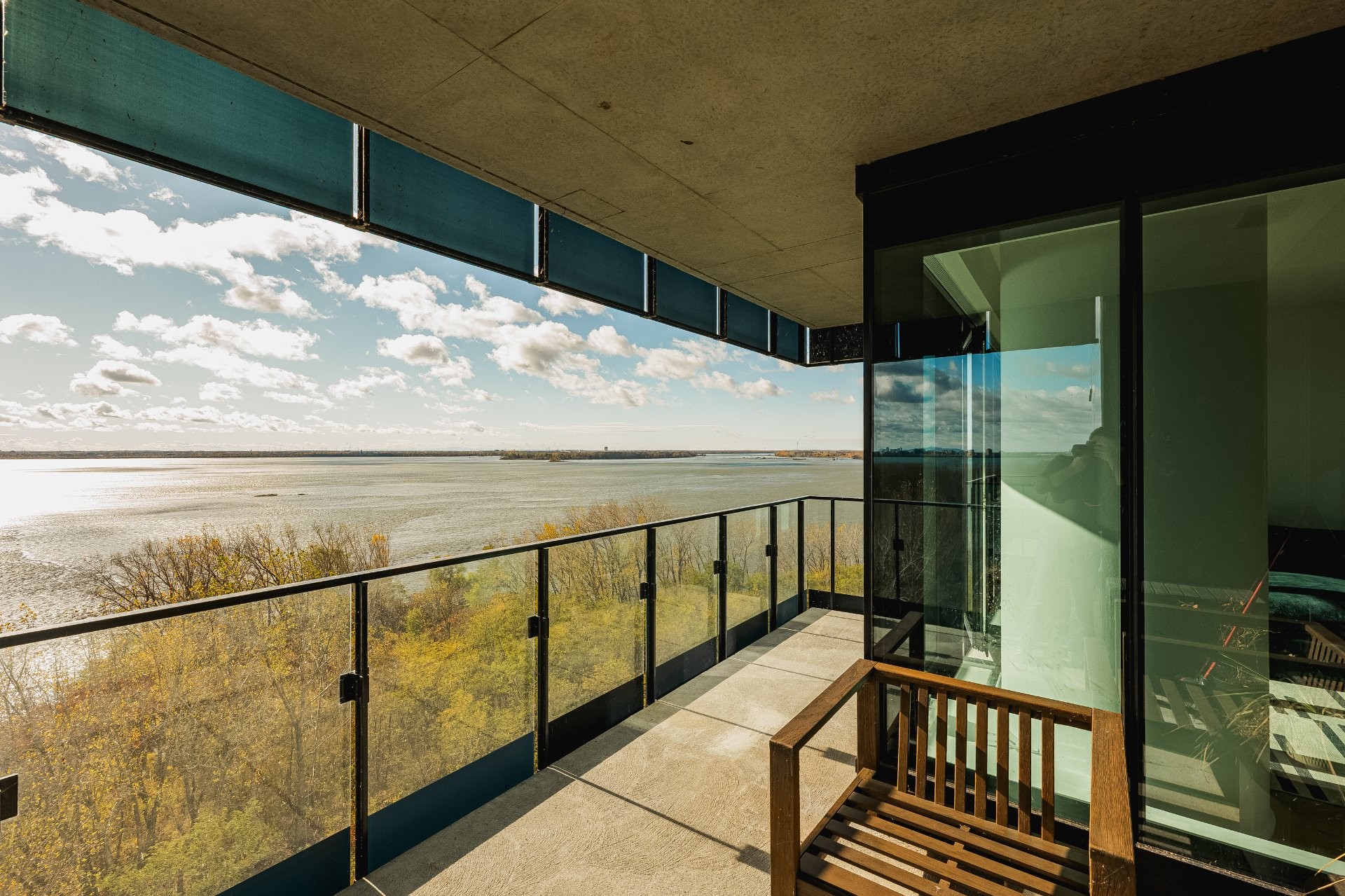- Espace à aire ouverte reliant le salon, la salle à manger et la cuisine -- baigné de lumière naturelleSalon donnant sur une grande terrasse offrant une vue panoramique dégagée sur le fleuve Saint-Laurent