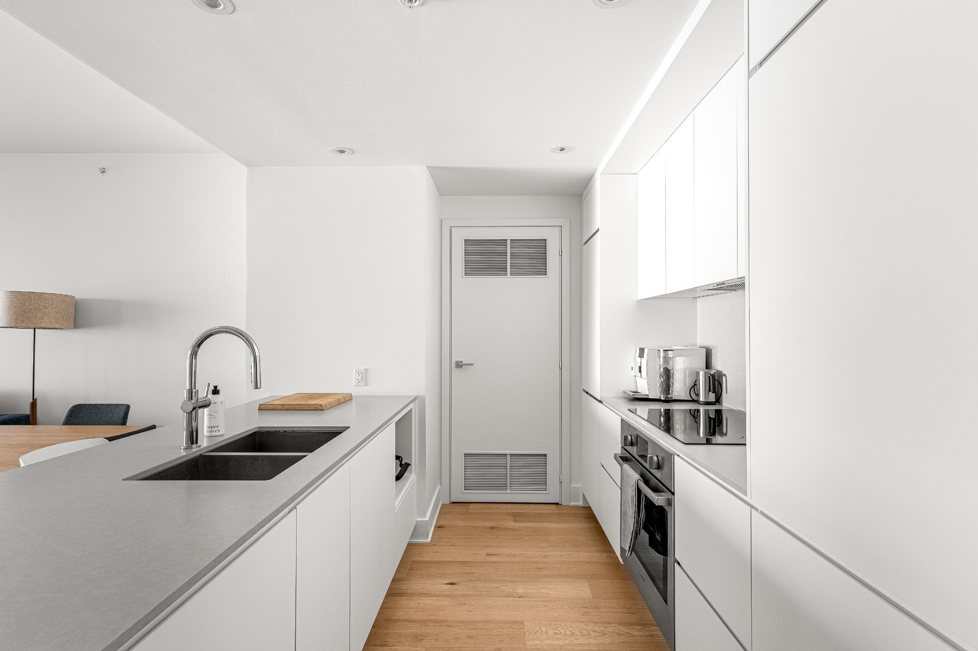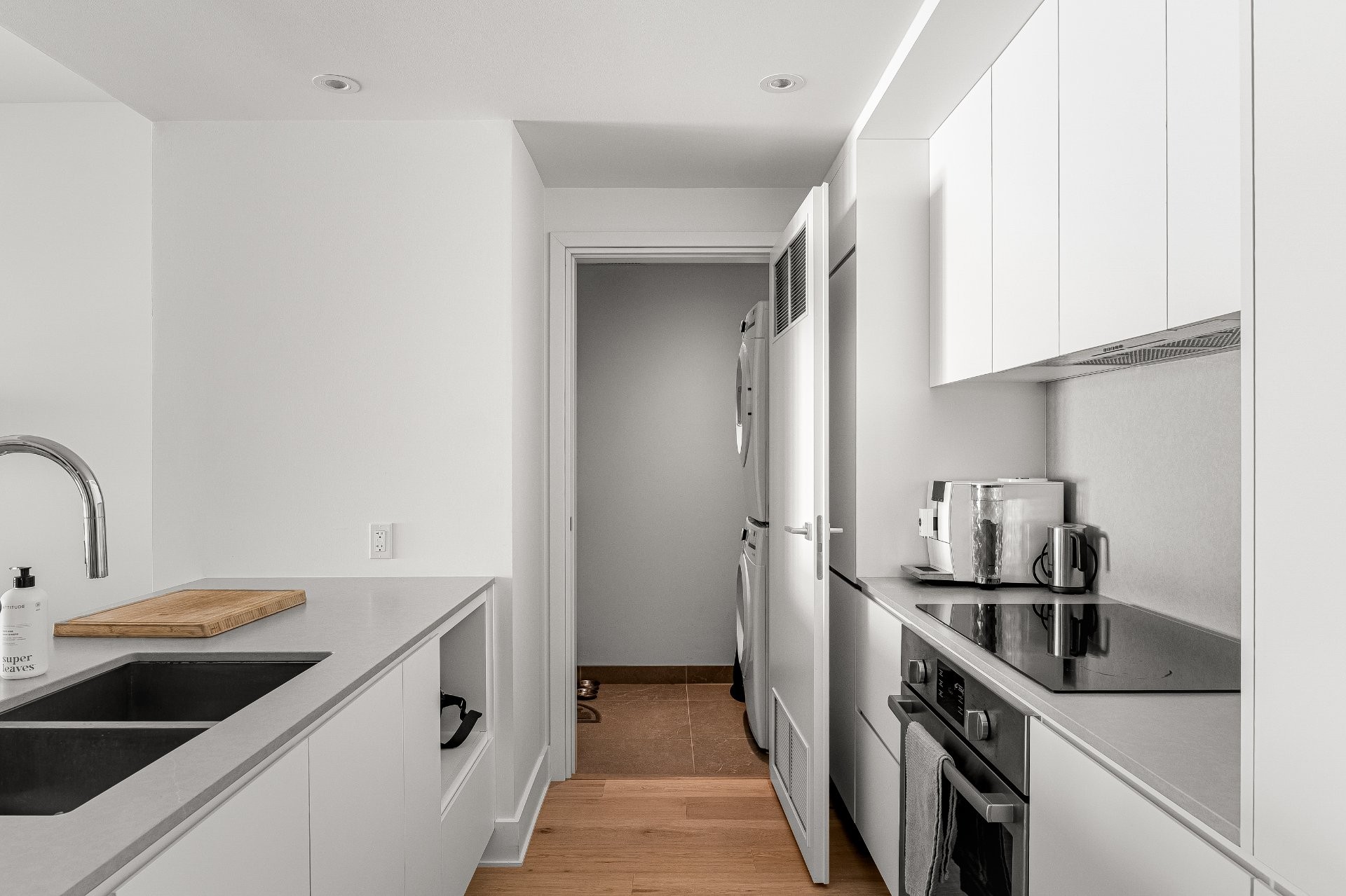 - Cuisine moderne avec : évier double sous plan, plaque de cuisson et four encastrés, lave-vaisselle Bosch, réfrigérateur Liebherr, accès à une salle de lavage