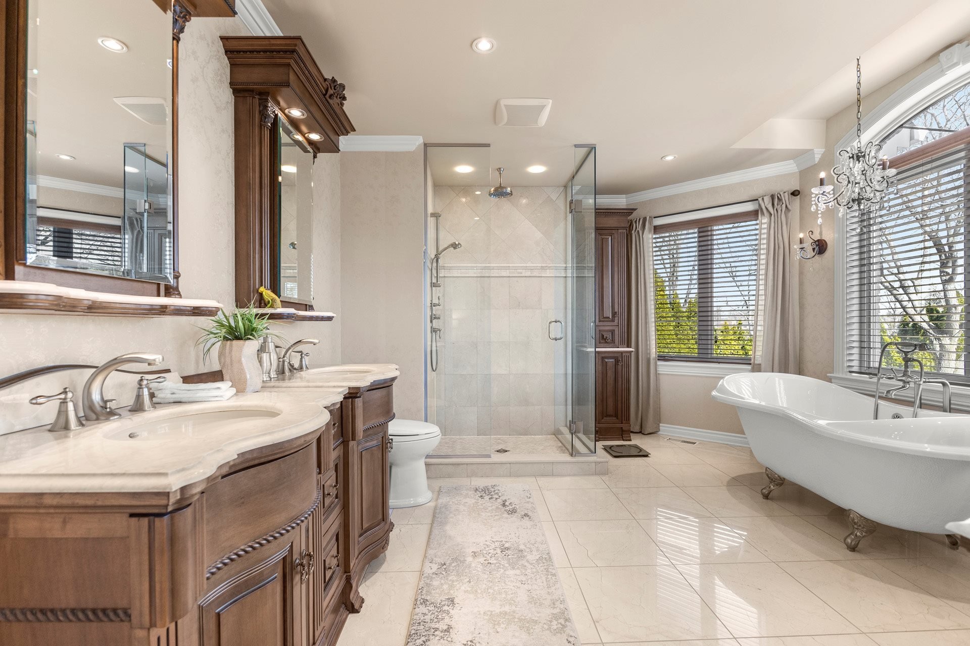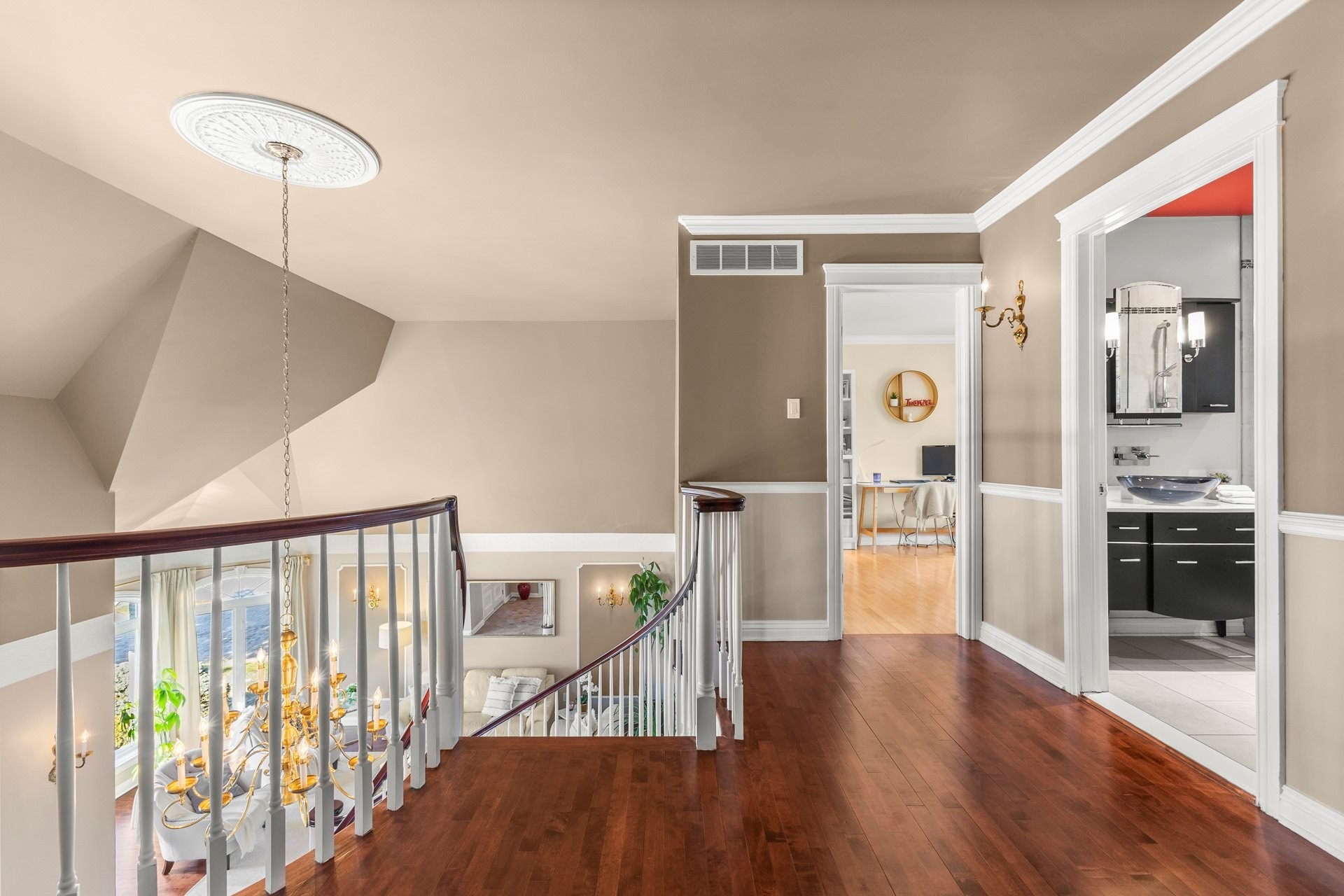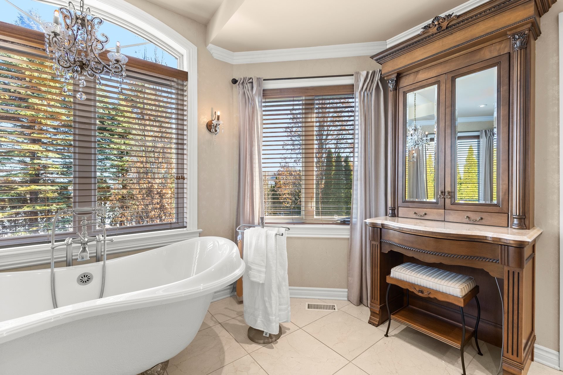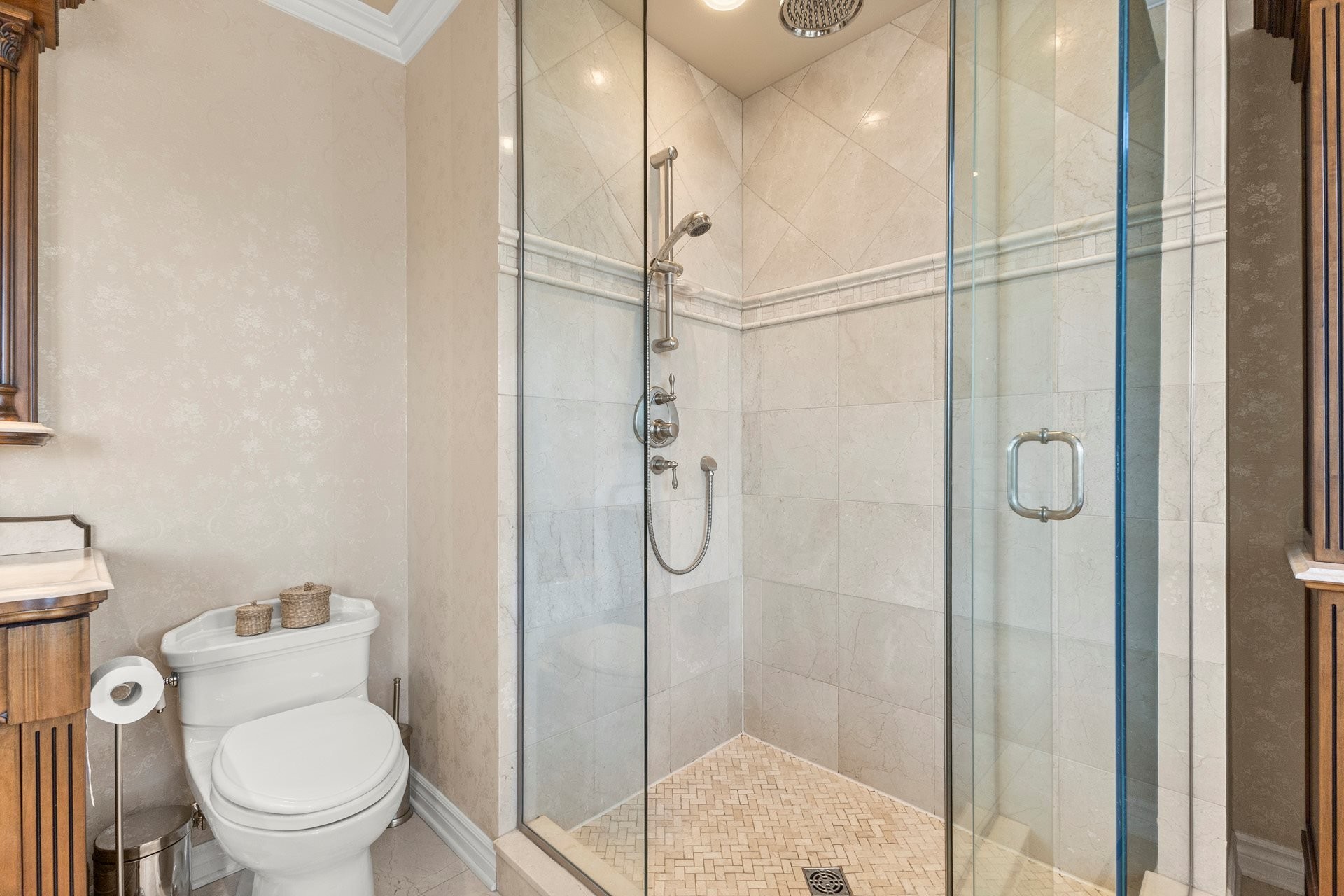 À l'étage, la suite principale luxueuse propose un walk-in aménagé sur mesure ainsi qu'une somptueuse salle de bain en marbre avec planchers chauffants.