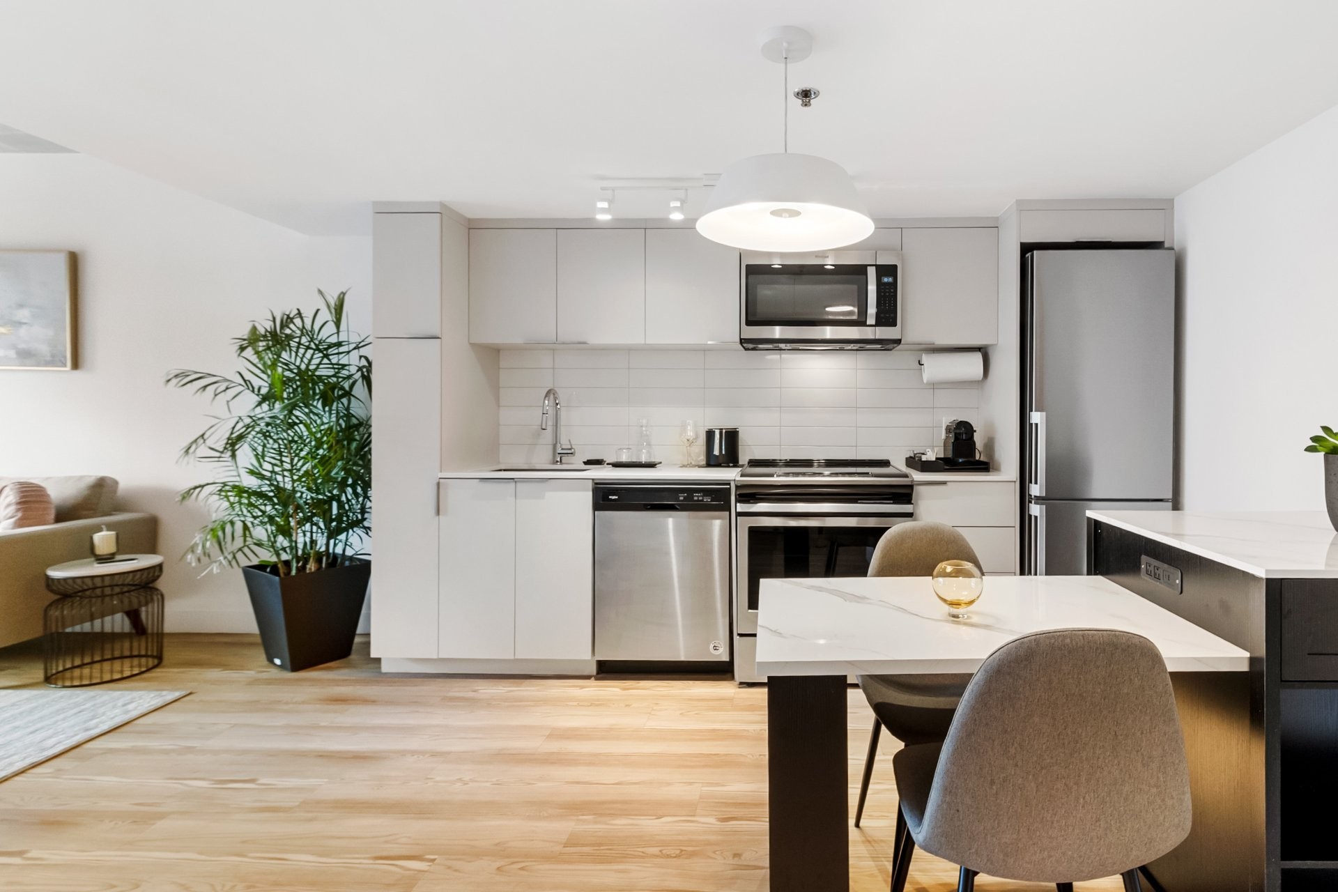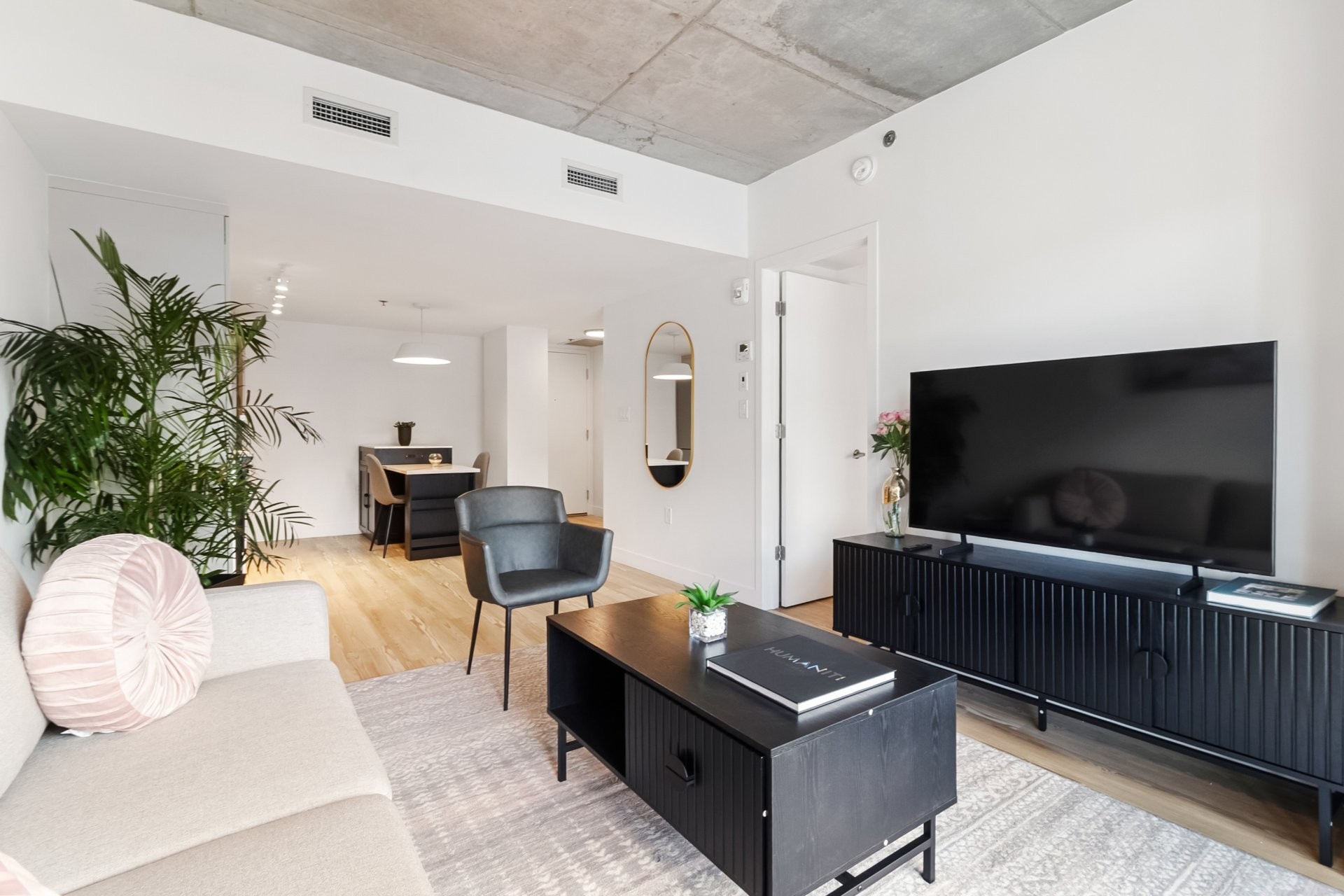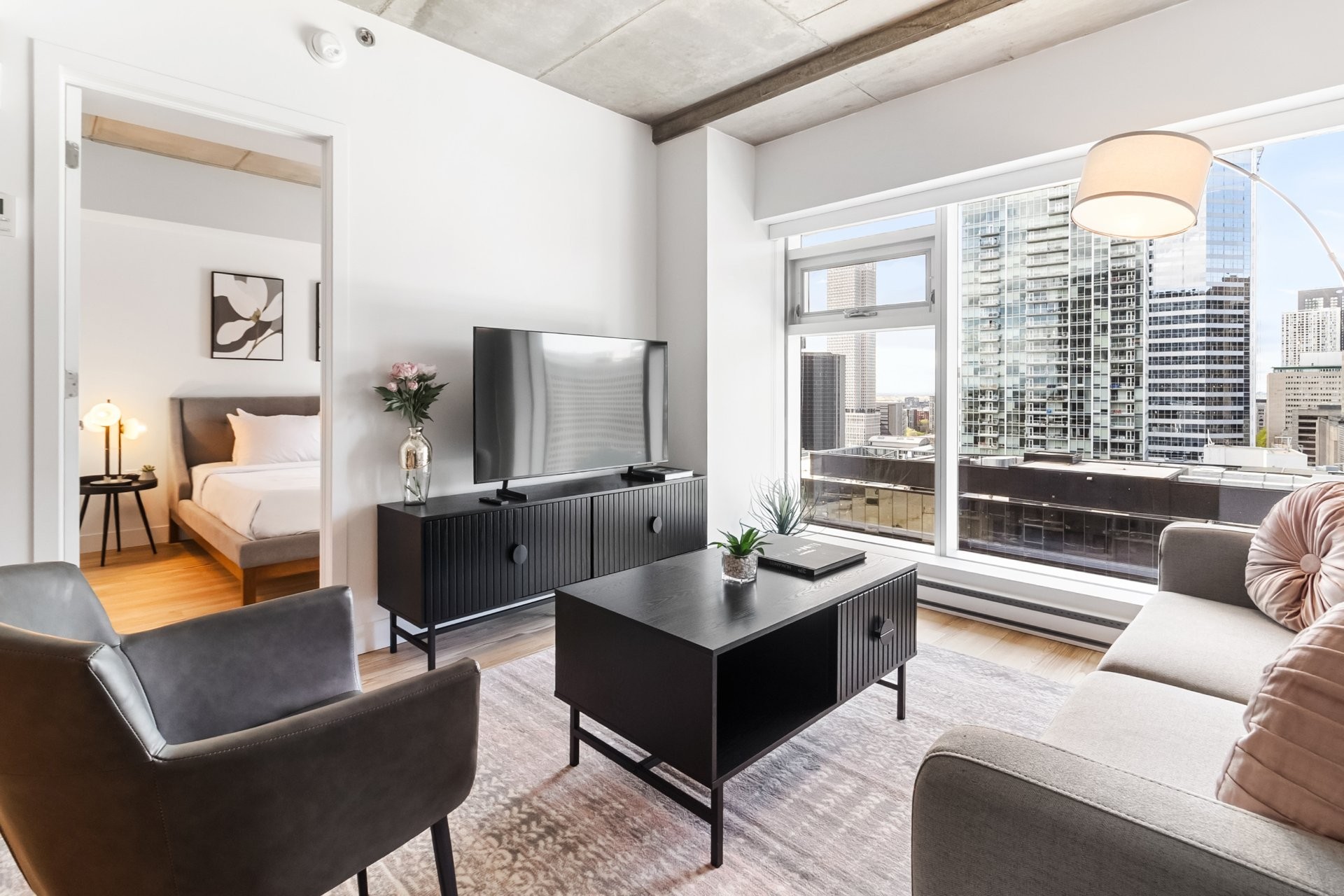 Unité de coin partiellement meublé moderne au YUL avec 2 chambres, 1 salle de bain et espace lumineux à aire ouverte. Fenêtres pleine hauteu...