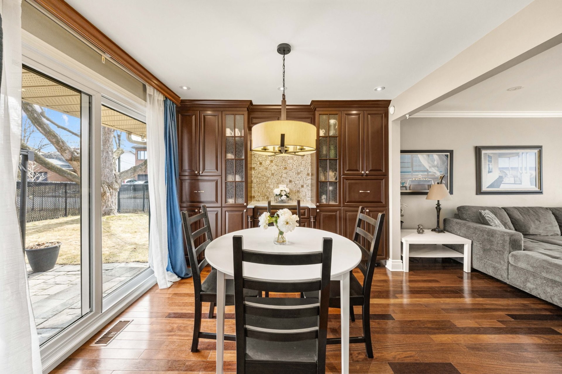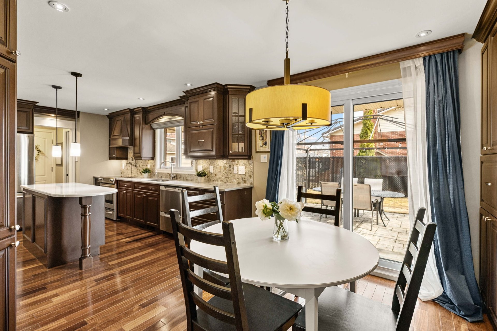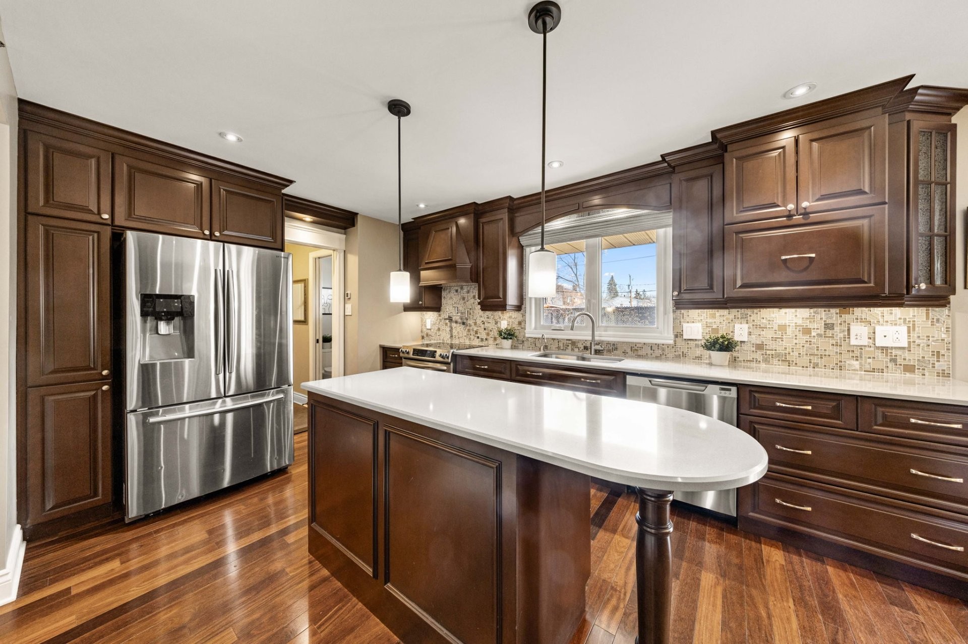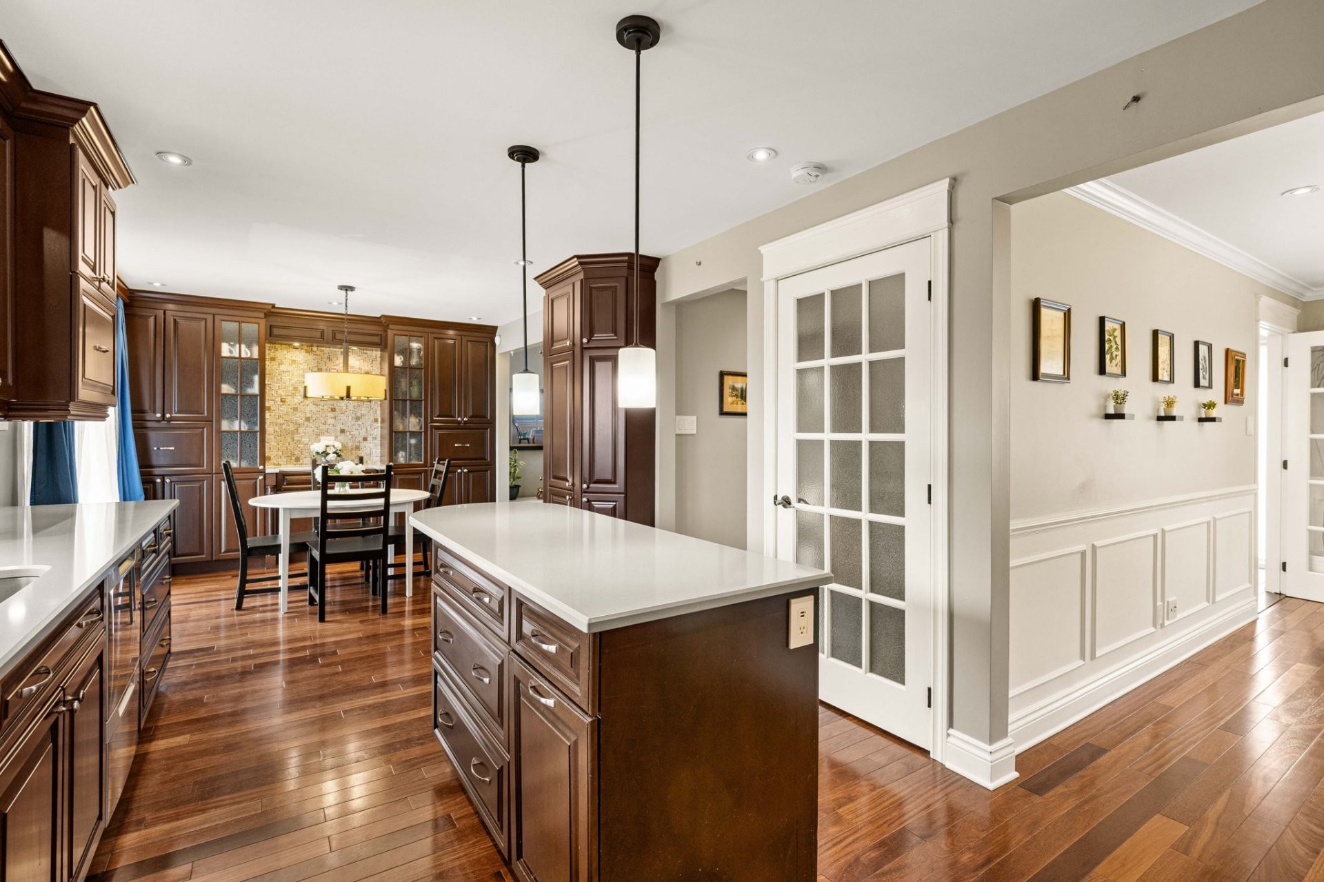 Entrez dans un hall d'entrée accueillant et bien proportionné, agrémenté d'élégantes portes françaises. Le rez-de-chaussée comprend un spacieux salon, une salle à manger formelle distincte et une cuisine avec coin-repas, le tout rehaussé par un riche plancher en bois franc brésilien. La cuisine est conçue aussi bien pour le quotidien que pour recevoir, avec des armoires en érable sur mesure et un îlot central. Une salle de bain powder room et une entrée de service avec planchers chauffants complètent les fonctionnalités de cet étage. Le garage double chauffé est doté d'un plancher en époxy et offre un espace de rangement dans le grenier au-dessus.