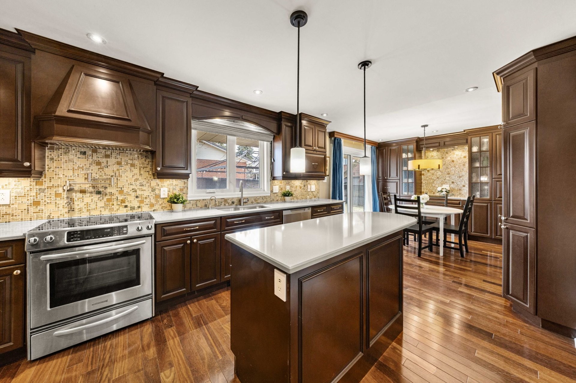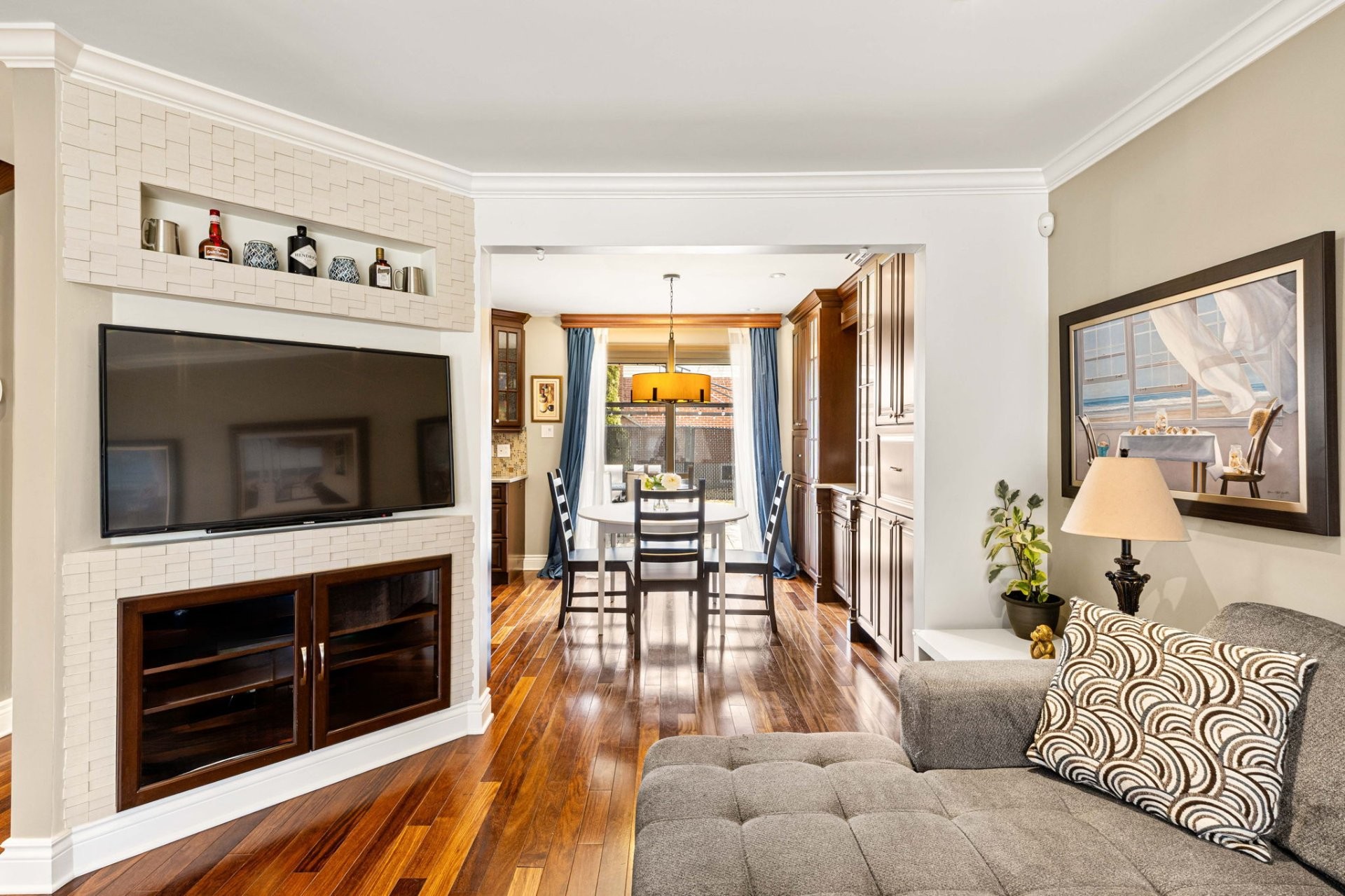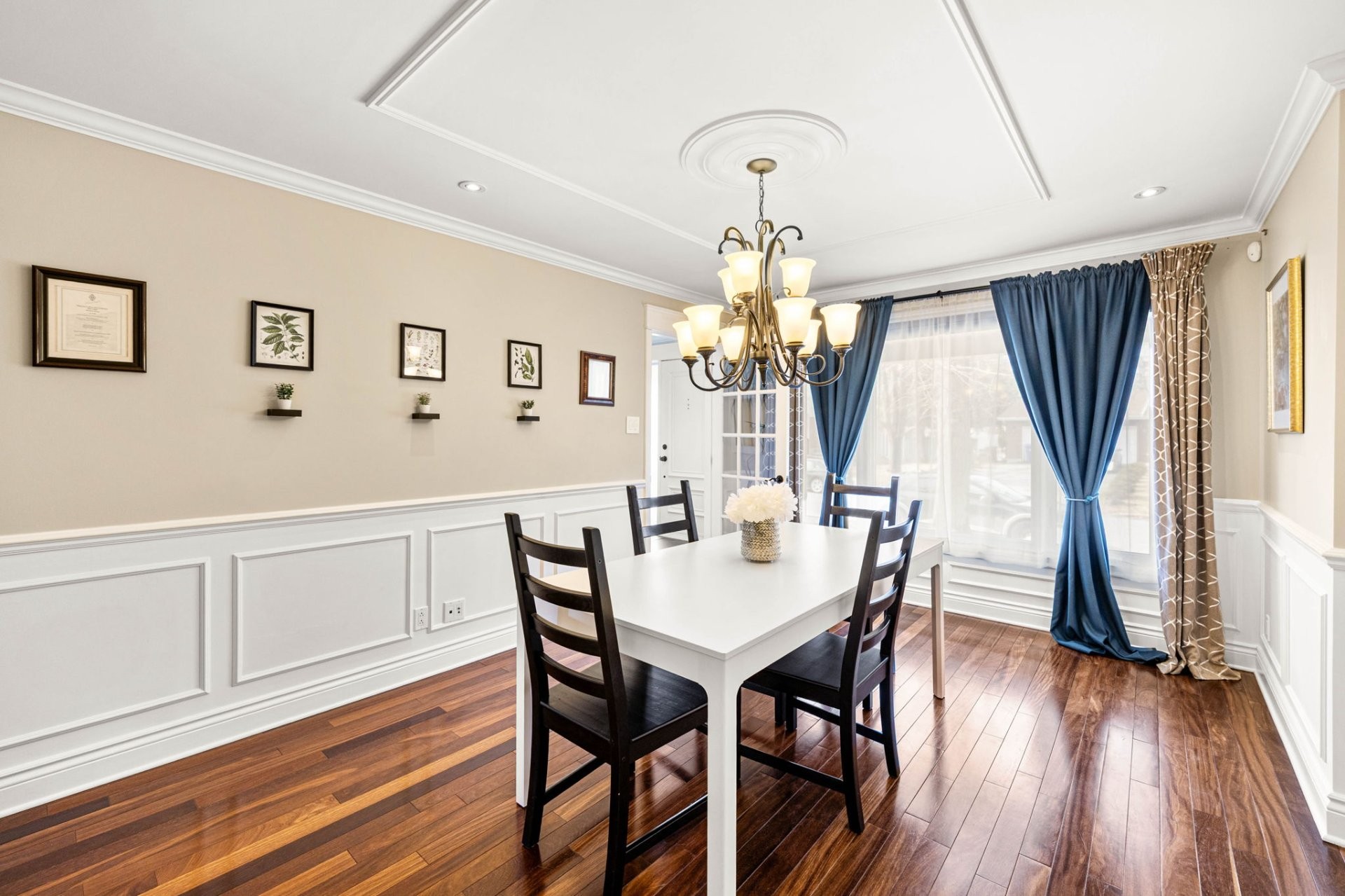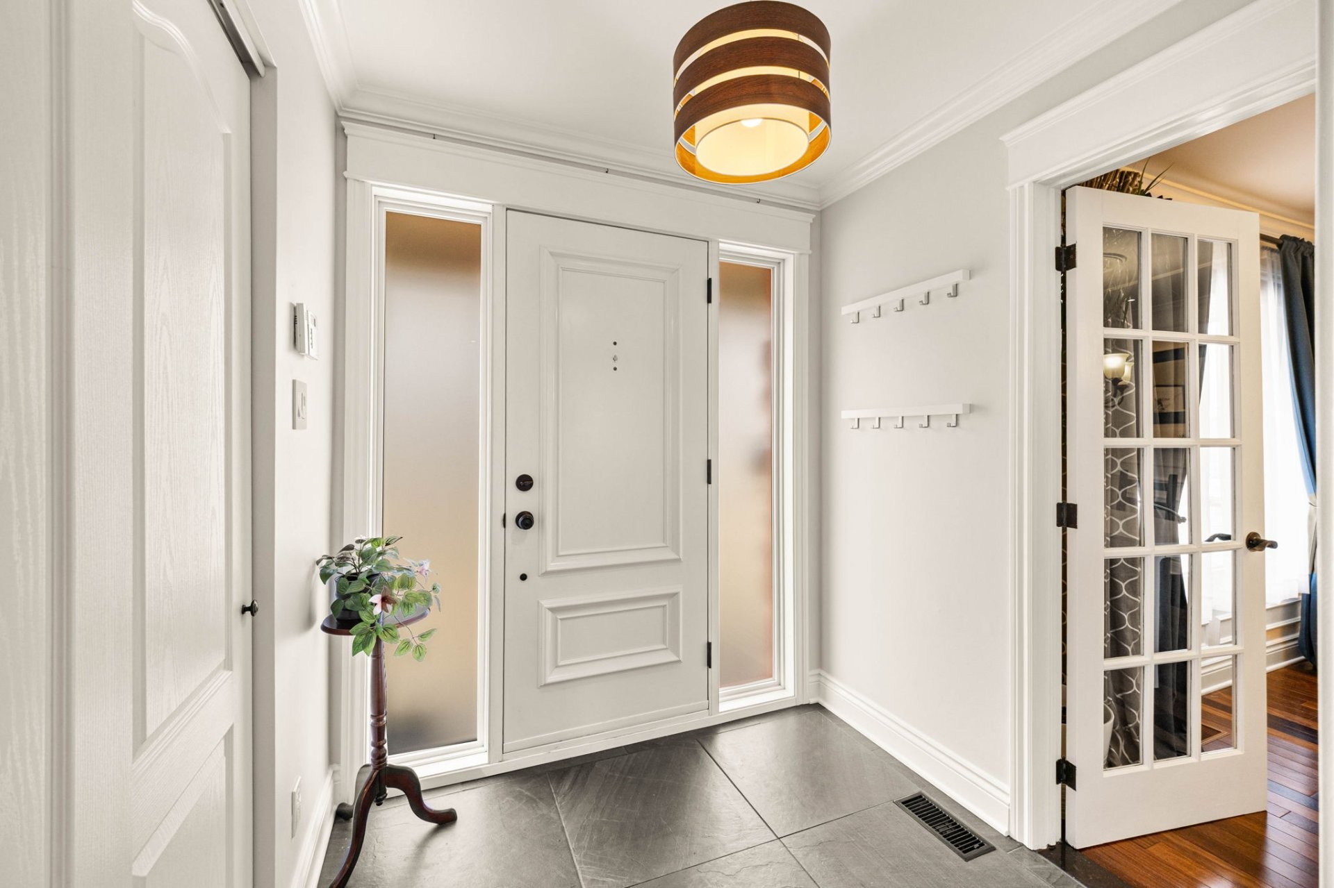 Entrez dans un hall d'entrée accueillant et bien proportionné, agrémenté d'élégantes portes françaises. Le rez-de-chaussée comprend un spacieux salon, une salle à manger formelle distincte et une cuisine avec coin-repas, le tout rehaussé par un riche plancher en bois franc brésilien. La cuisine est conçue aussi bien pour le quotidien que pour recevoir, avec des armoires en érable sur mesure et un îlot central. Une salle de bain powder room et une entrée de service avec planchers chauffants complètent les fonctionnalités de cet étage. Le garage double chauffé est doté d'un plancher en époxy et offre un espace de rangement dans le grenier au-dessus.