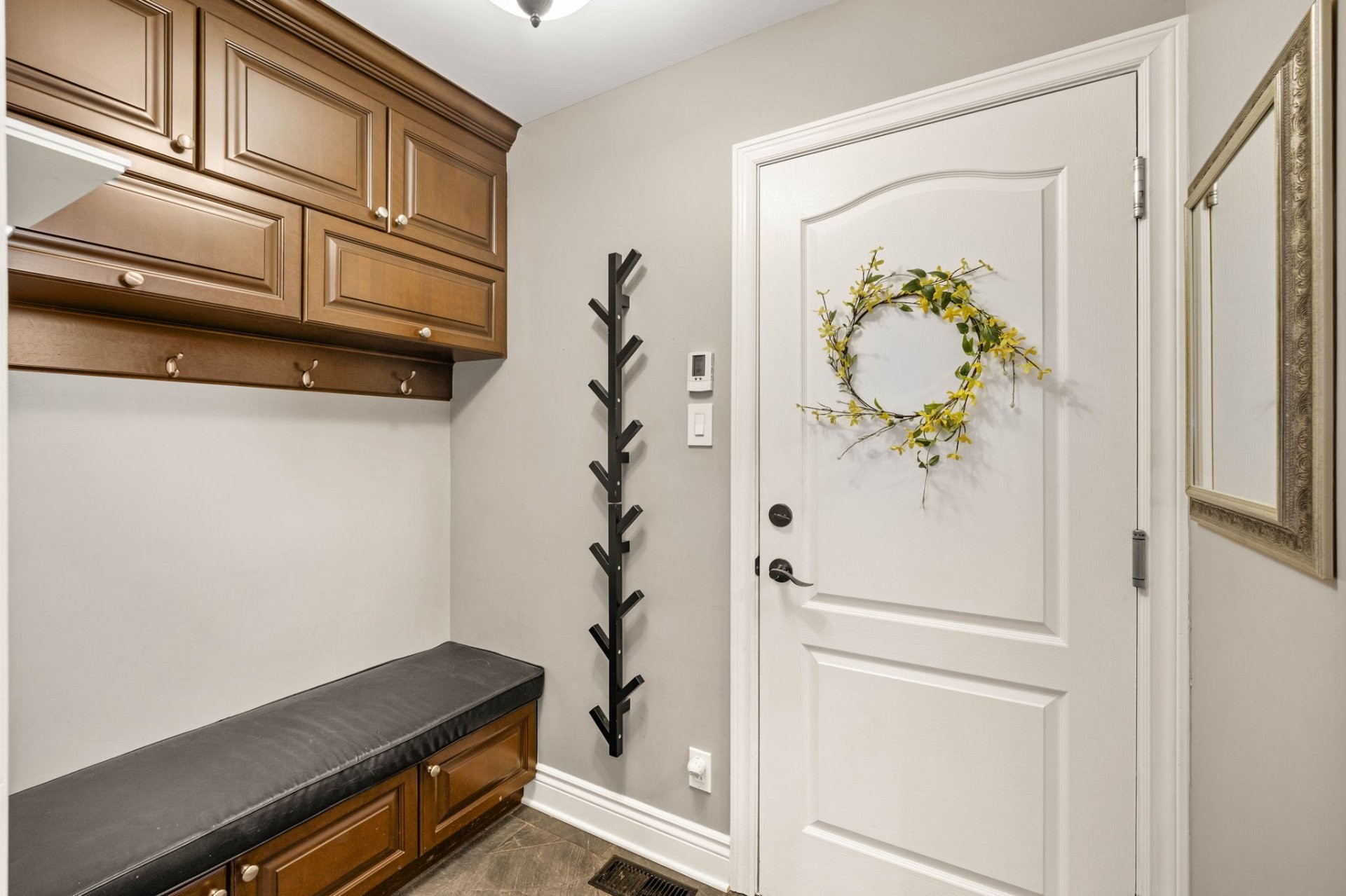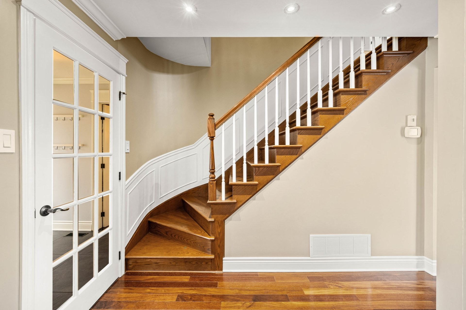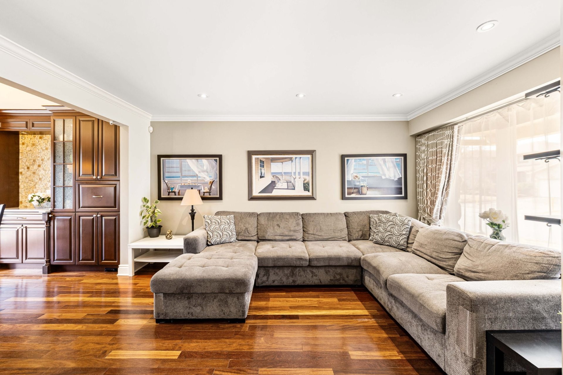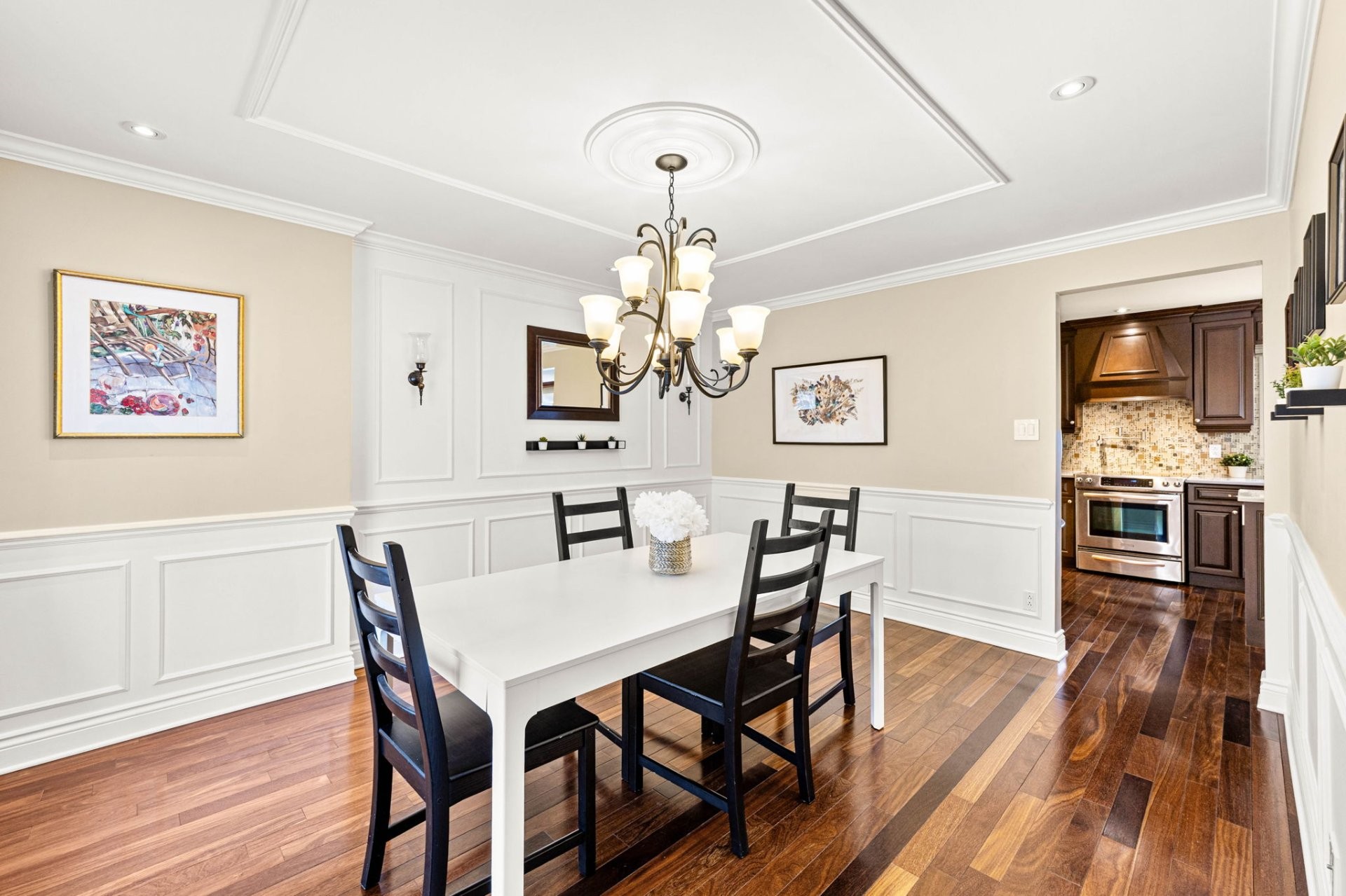 Entrez dans un hall d'entrée accueillant et bien proportionné, agrémenté d'élégantes portes françaises. Le rez-de-chaussée comprend un spacieux salon, une salle à manger formelle distincte et une cuisine avec coin-repas, le tout rehaussé par un riche plancher en bois franc brésilien. La cuisine est conçue aussi bien pour le quotidien que pour recevoir, avec des armoires en érable sur mesure et un îlot central. Une salle de bain powder room et une entrée de service avec planchers chauffants complètent les fonctionnalités de cet étage. Le garage double chauffé est doté d'un plancher en époxy et offre un espace de rangement dans le grenier au-dessus.