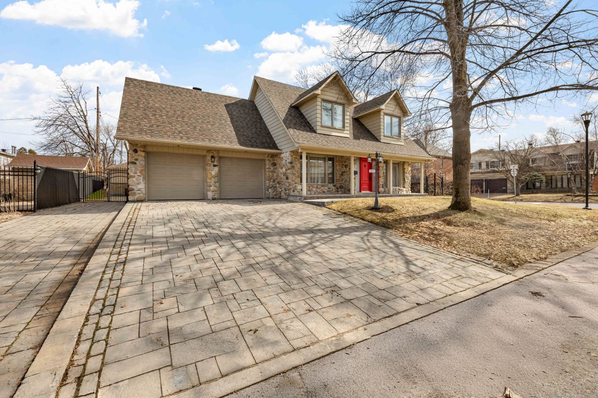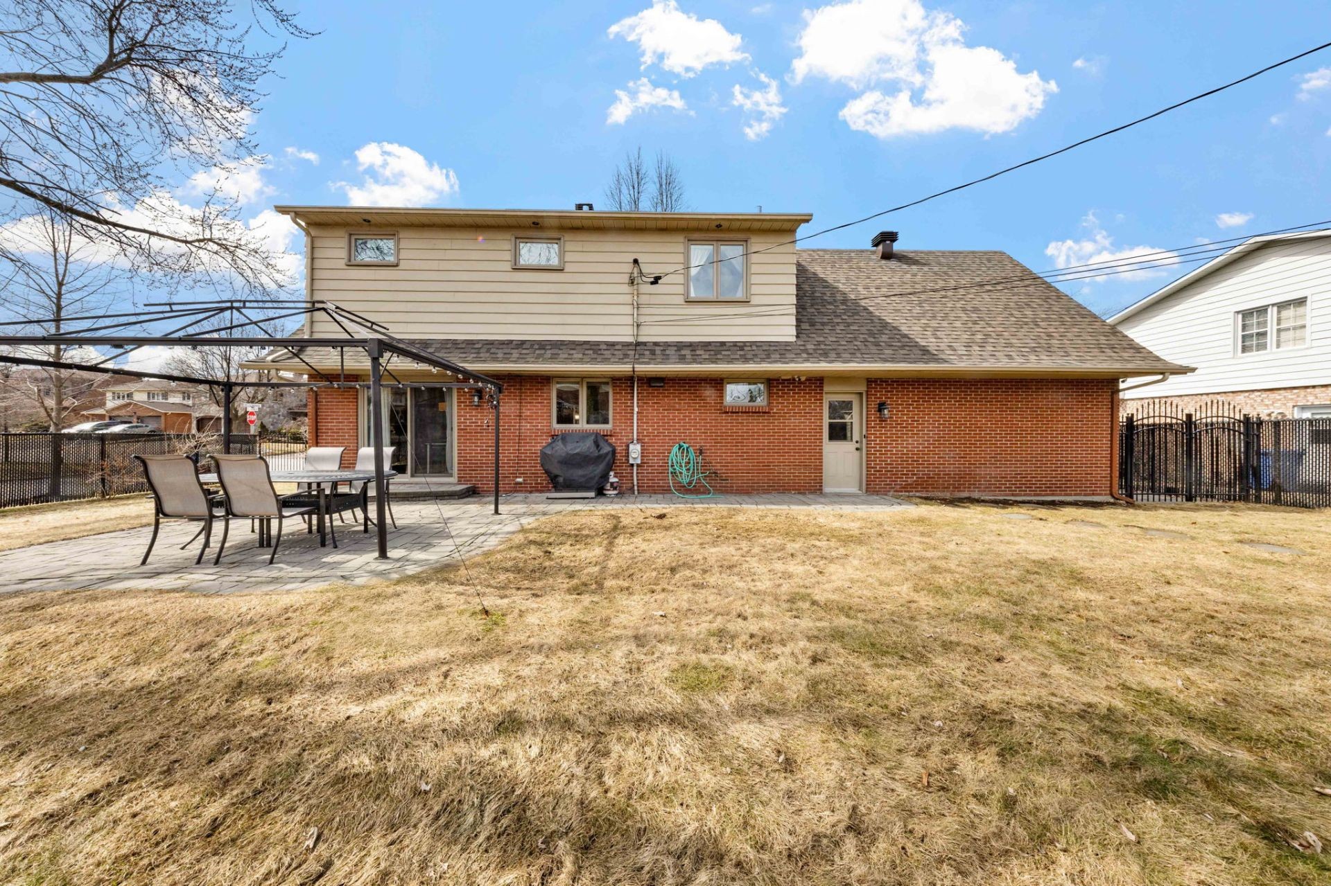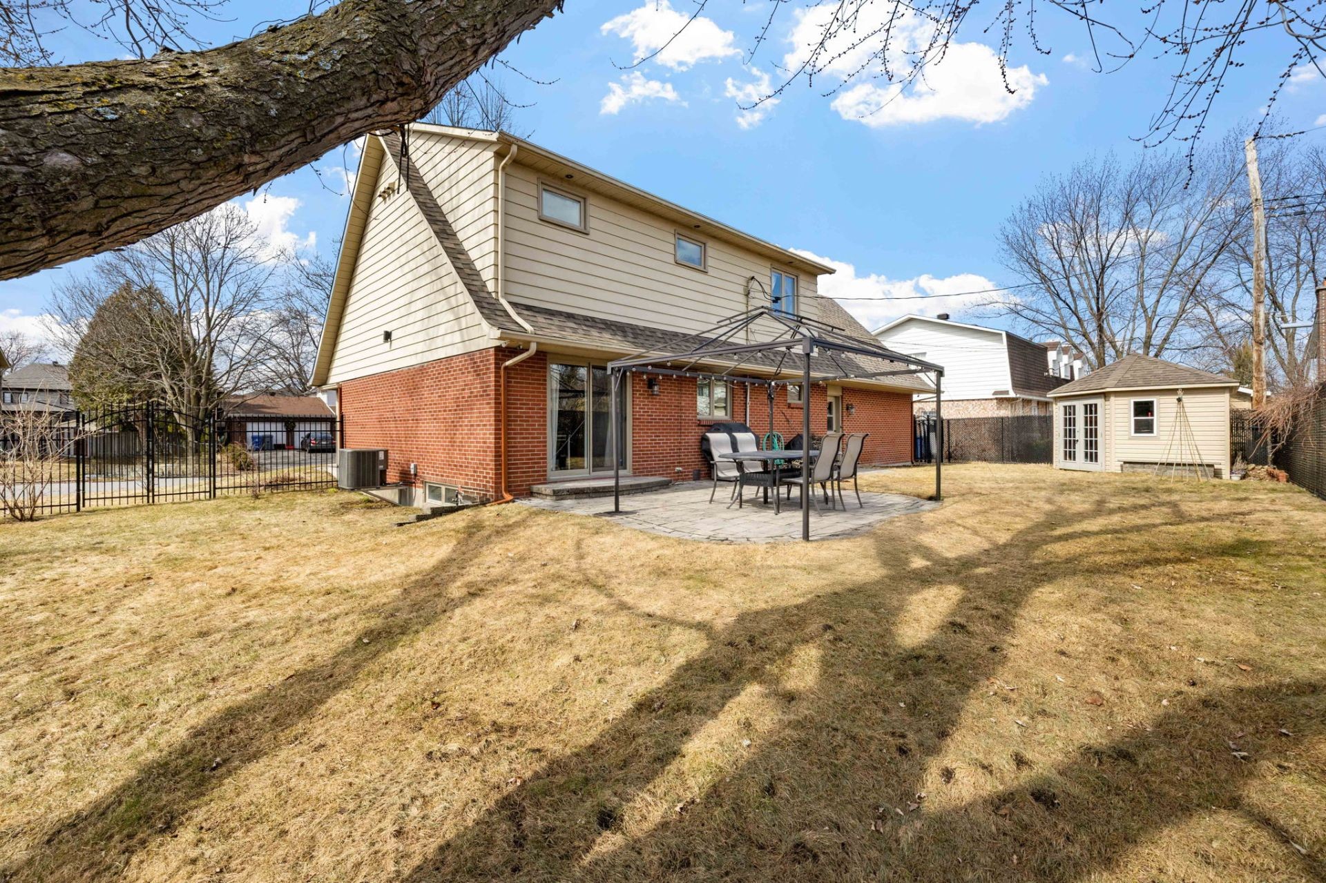 Des portes-patio donnent accès à une cour arrière généreuse, comprenant une terrasse en pierres uni-stone et un cabanon de coin de 12 x 12 construit sur une dalle de béton, avec plancher en époxy, électricité et système d'alarme. L'espace extérieur est également équipé d'un système de surveillance à 8 caméras, d'un éclairage automatique, d'une clôture en fer forgé et en Frost pour l'intimité, ainsi que d'un système d'irrigation pour un entretien simplifié. Une entrée en pierres uni-stone agrandie offre de l'espace pour plusieurs véhicules.