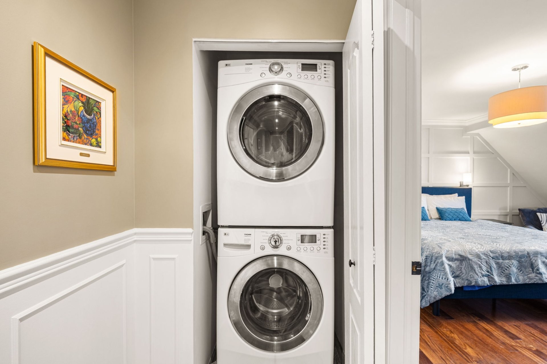 À l'étage, la chambre principale spacieuse offre un banc de fenêtre douillet et une salle de bain privative avec planchers chauffants. Deux chambres supplémentaires bien aménagées, une salle de bain familiale également avec planchers chauffants, et un espace buanderie pratique complètent cet étage.