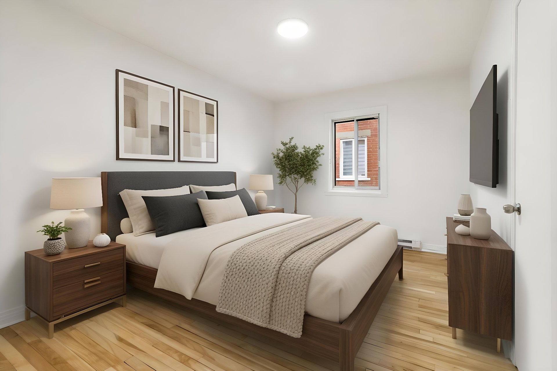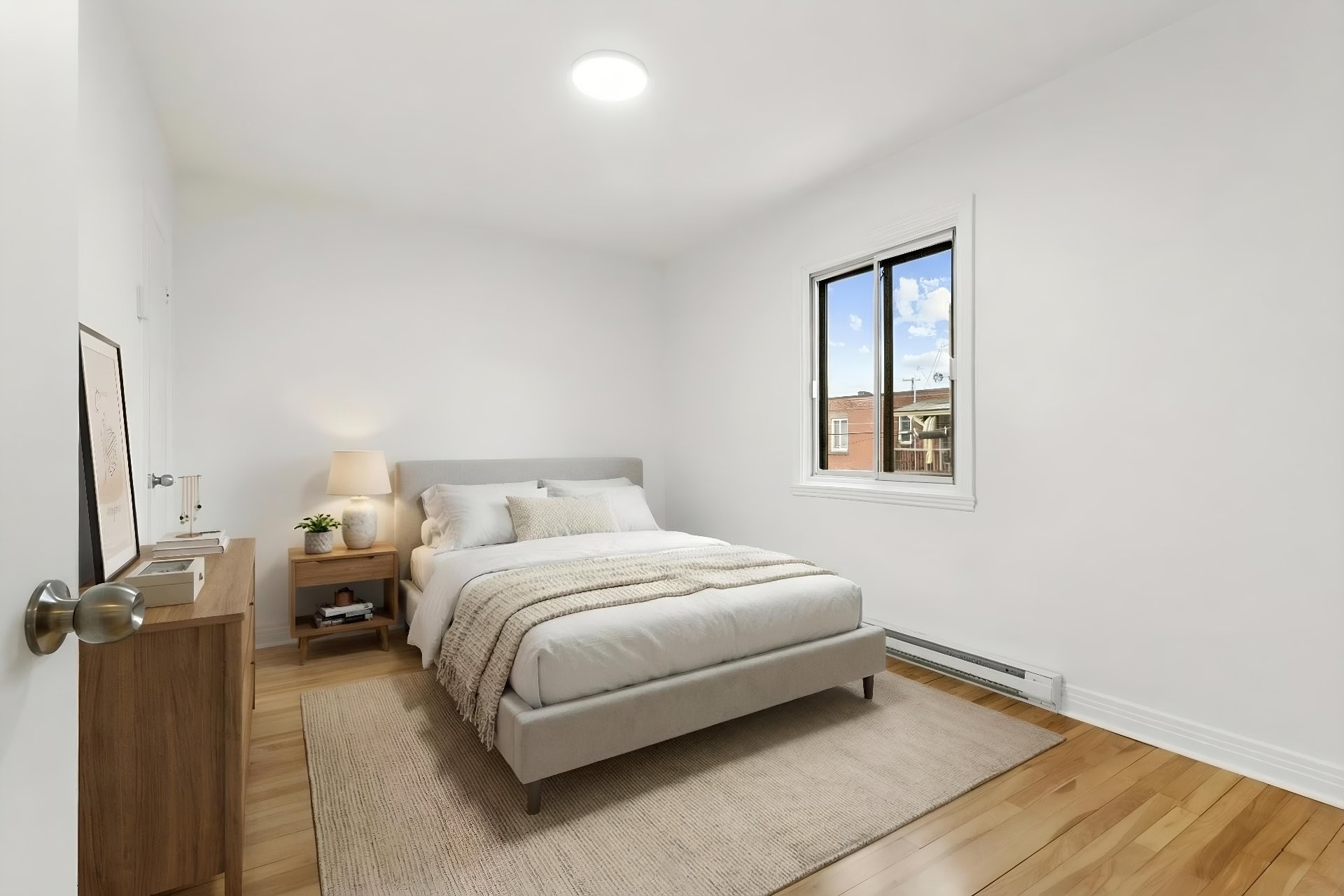 Appartement à l'étage supérieur (2e étage) magnifiquement rénové, alliant style moderne et grand confort, avec une cuisine toute neuve dotée de comptoirs en quartz, d'armoires élégantes et de finitions contemporaines, un intérieur fraîchement peint et 3 chambres généreusement dimensionnées. La salle de bain moderne comprend des installations stylées, et l'appartement offre deux balcons privés (avant et arrière) ainsi qu'un climatiseur mural pour un confort tout au long de l'année. Idéalement situé à proximité des épiceries, parcs, écoles, commerces et transports en commun, avec un accès facile aux espaces verts. Disponible immédiatement !