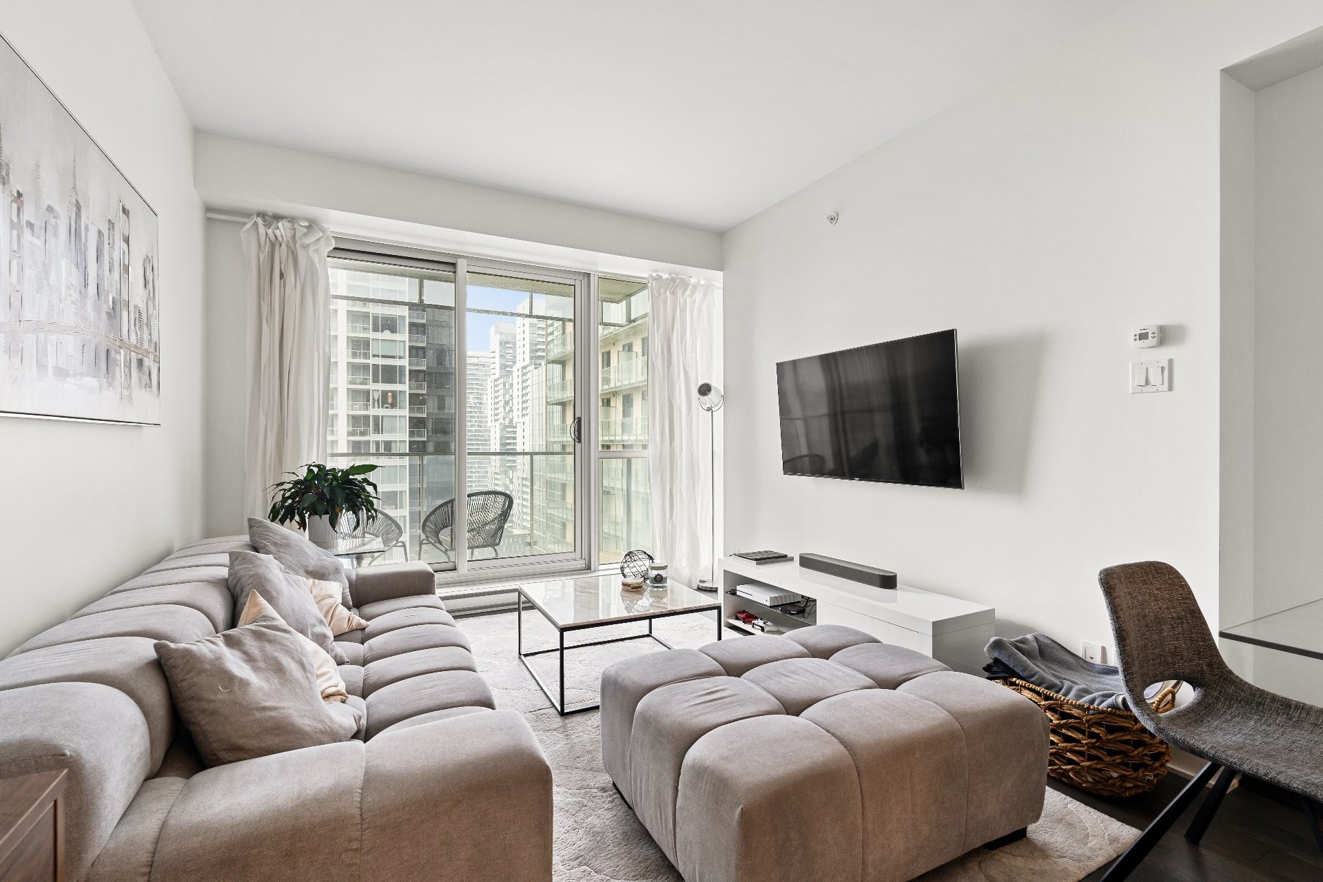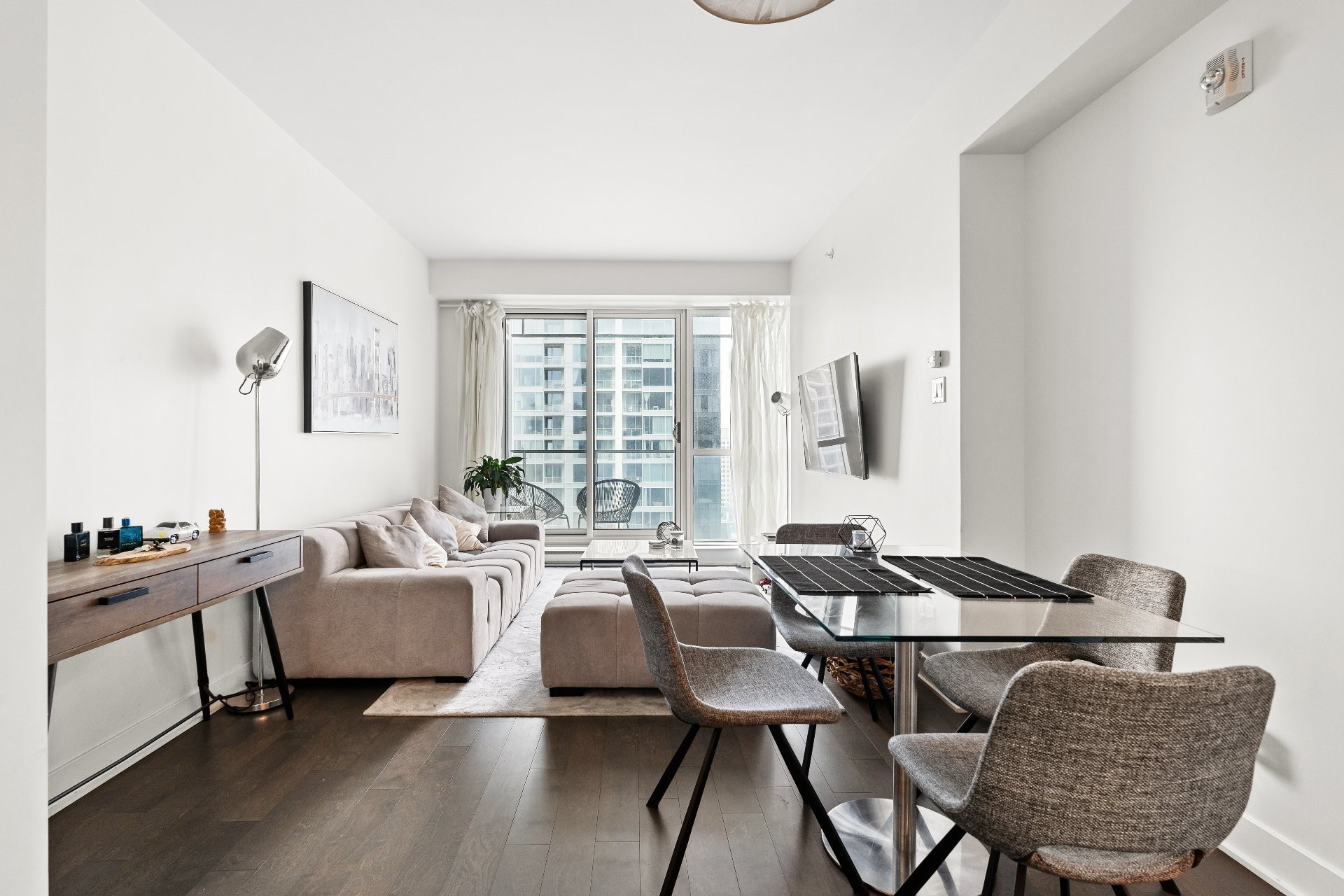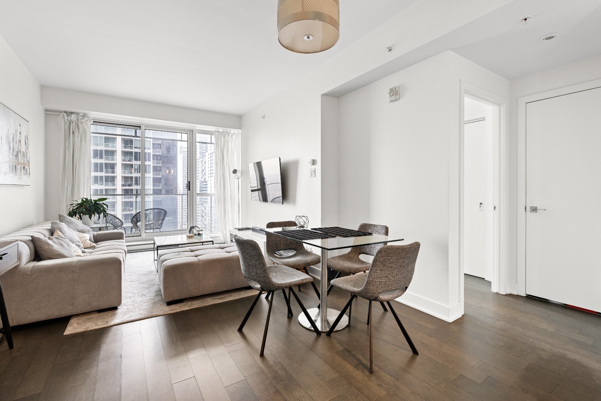 Unité de coin partiellement meublé moderne au YUL avec 2 chambres, 1 salle de bain et espace lumineux à aire ouverte. Fenêtres pleine hauteu...