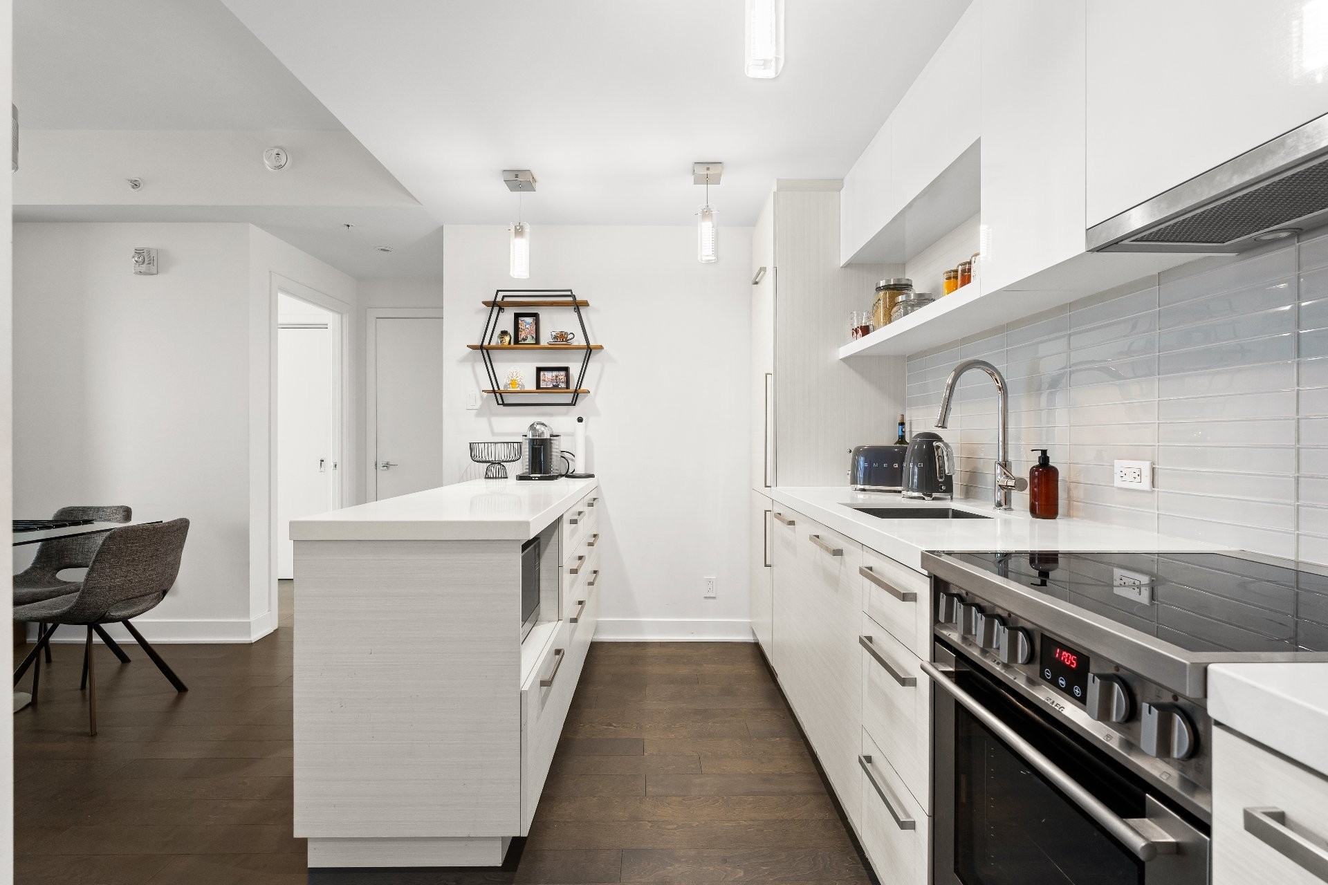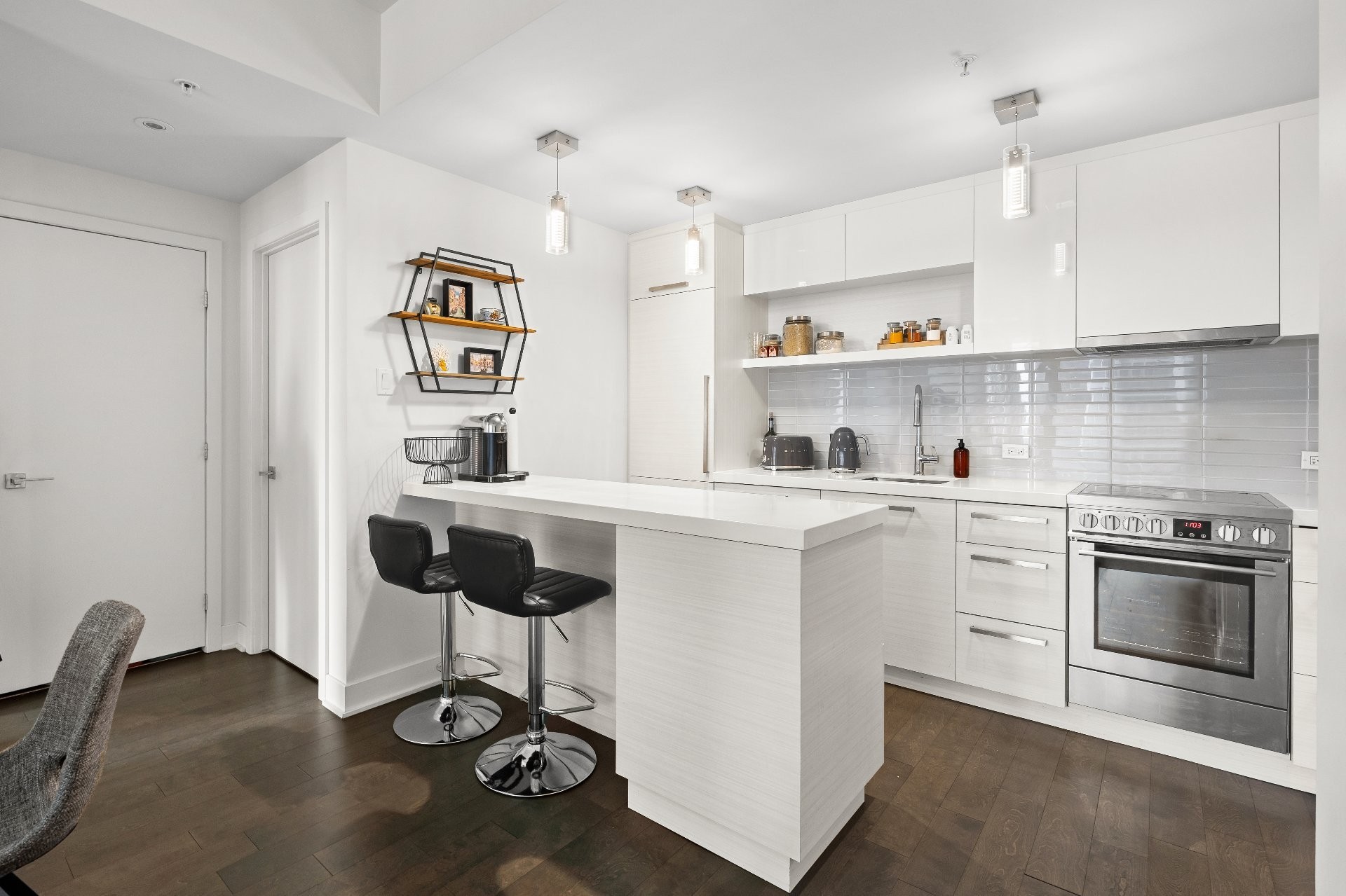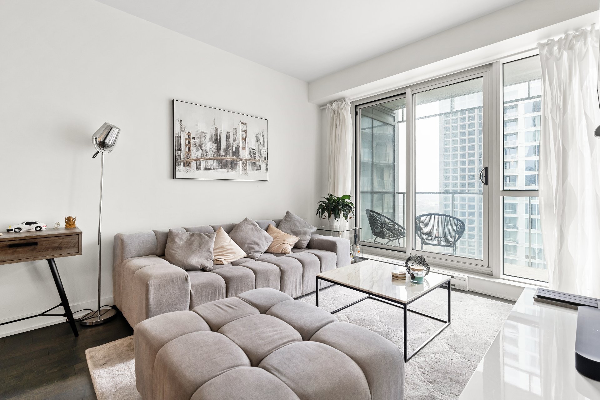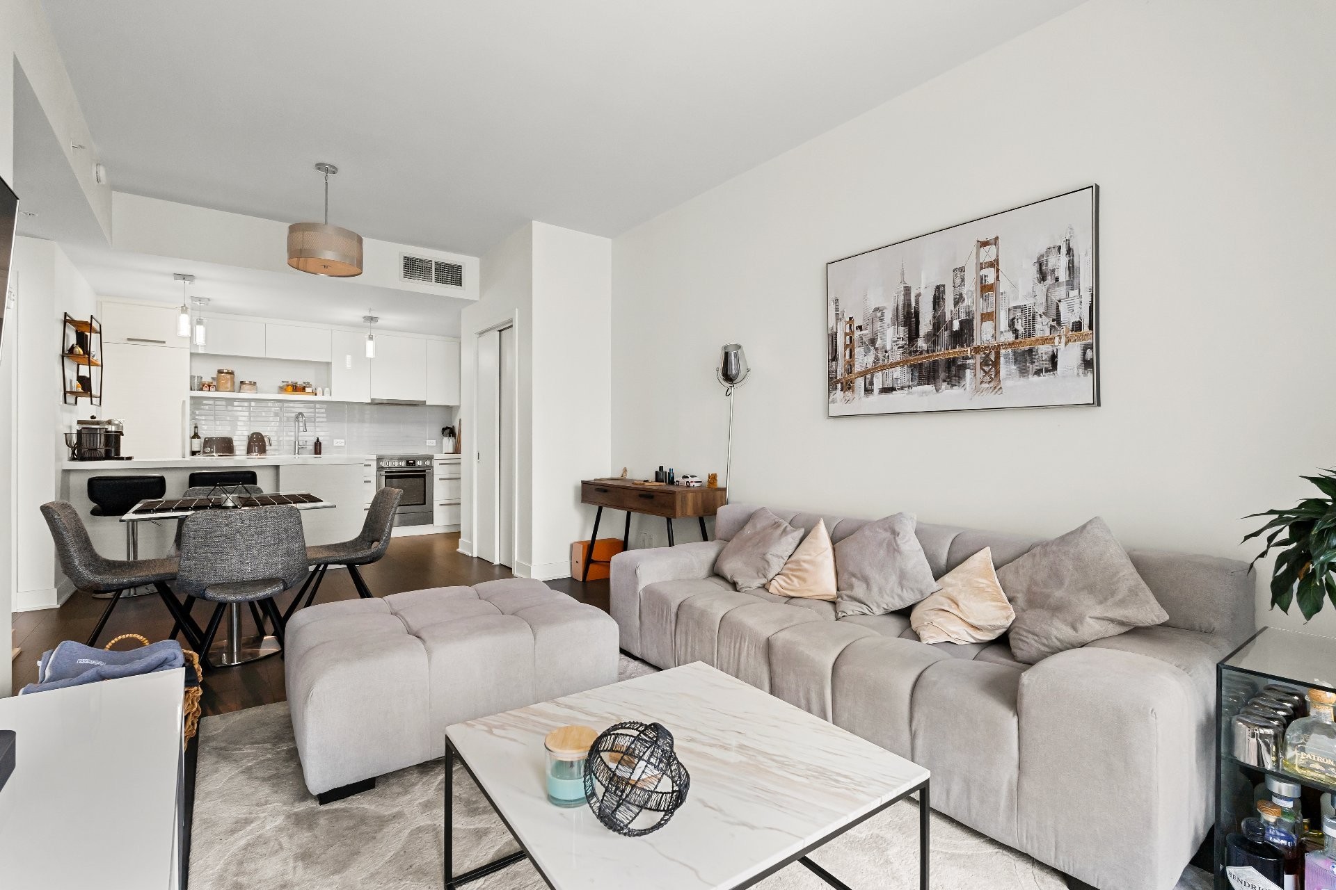 Unité de coin partiellement meublé moderne au YUL avec 2 chambres, 1 salle de bain et espace lumineux à aire ouverte. Fenêtres pleine hauteu...