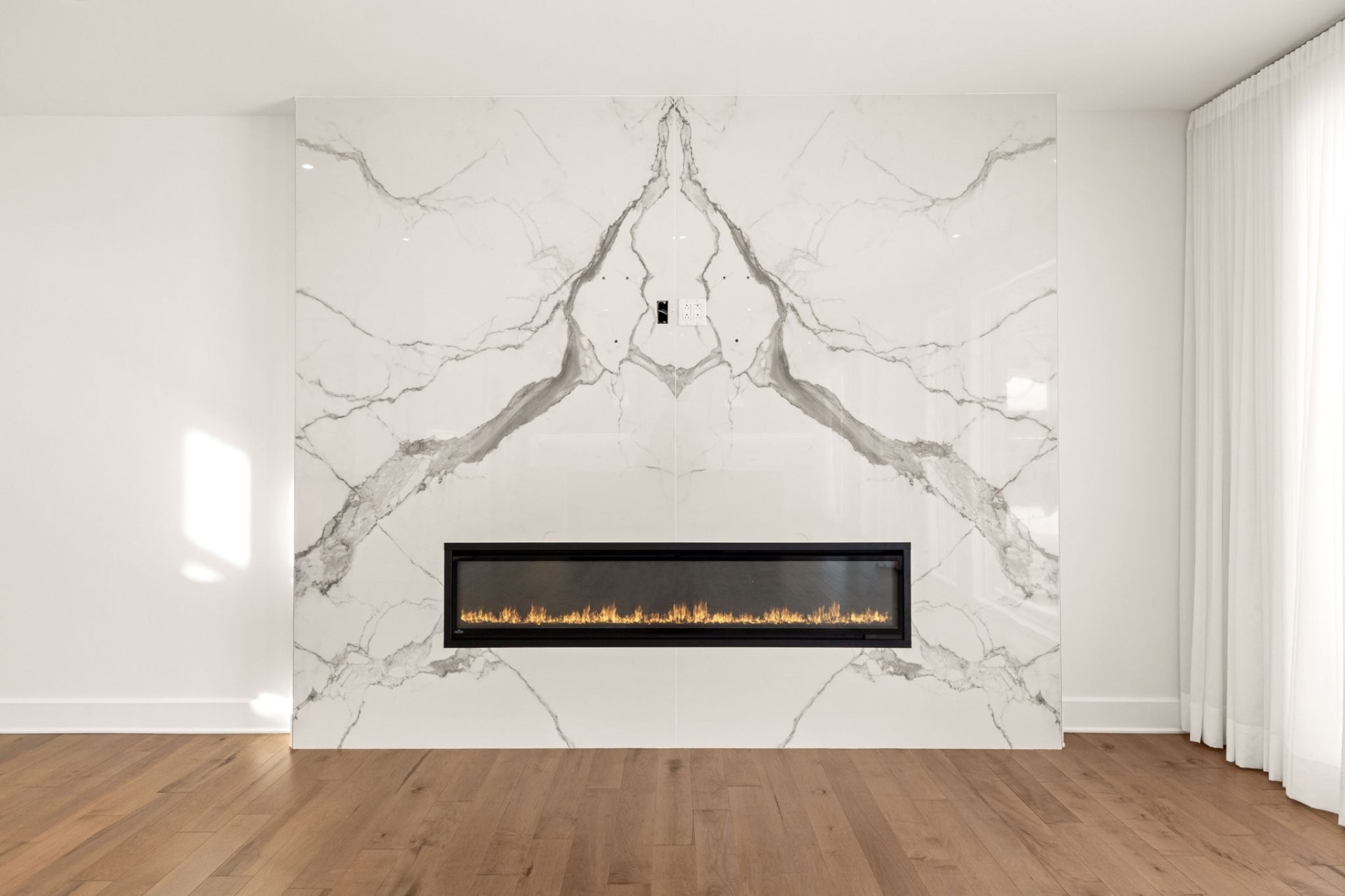- Superbe cheminée en dalle de porcelaine personnalisée, importée d'Italie