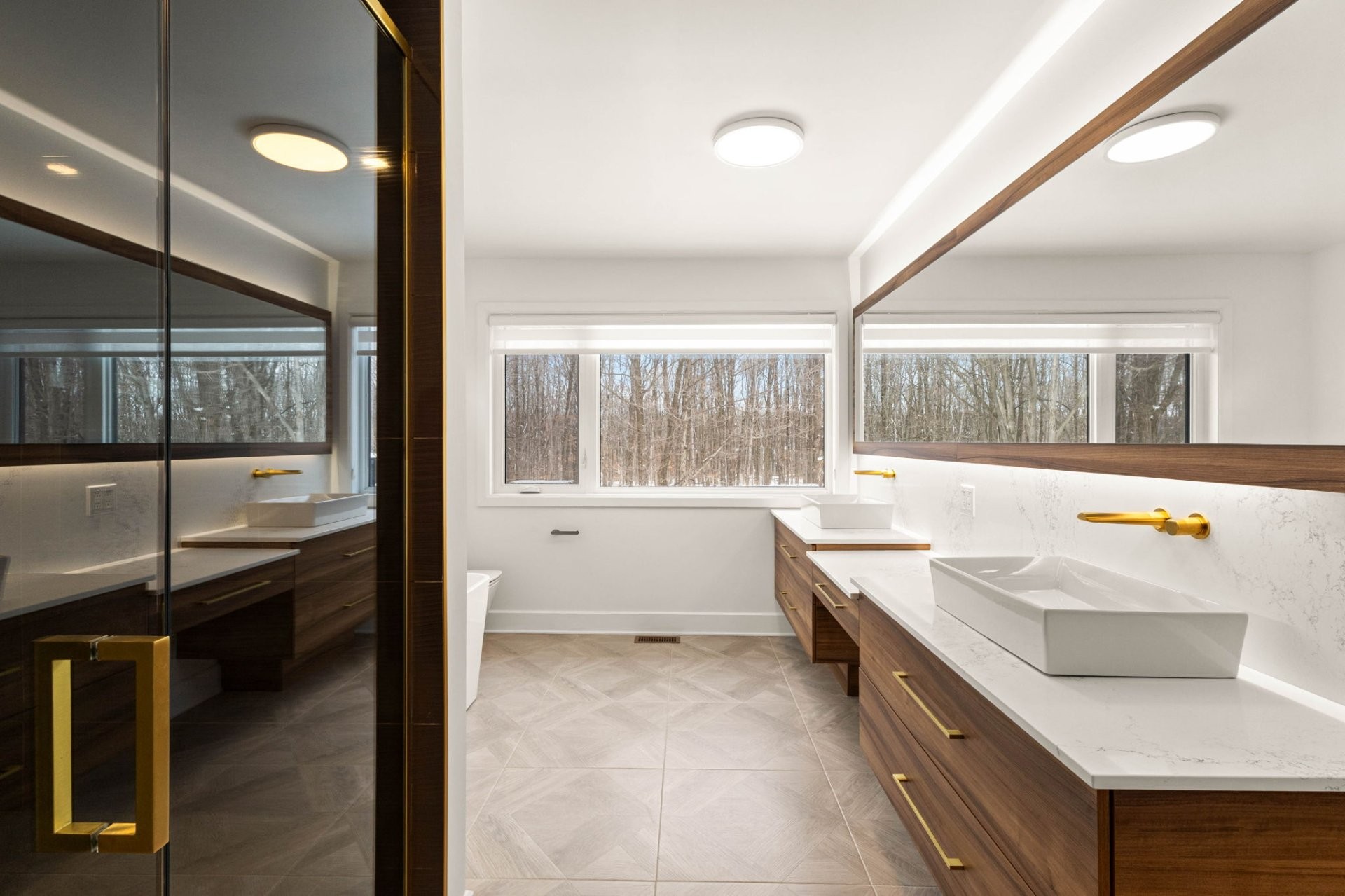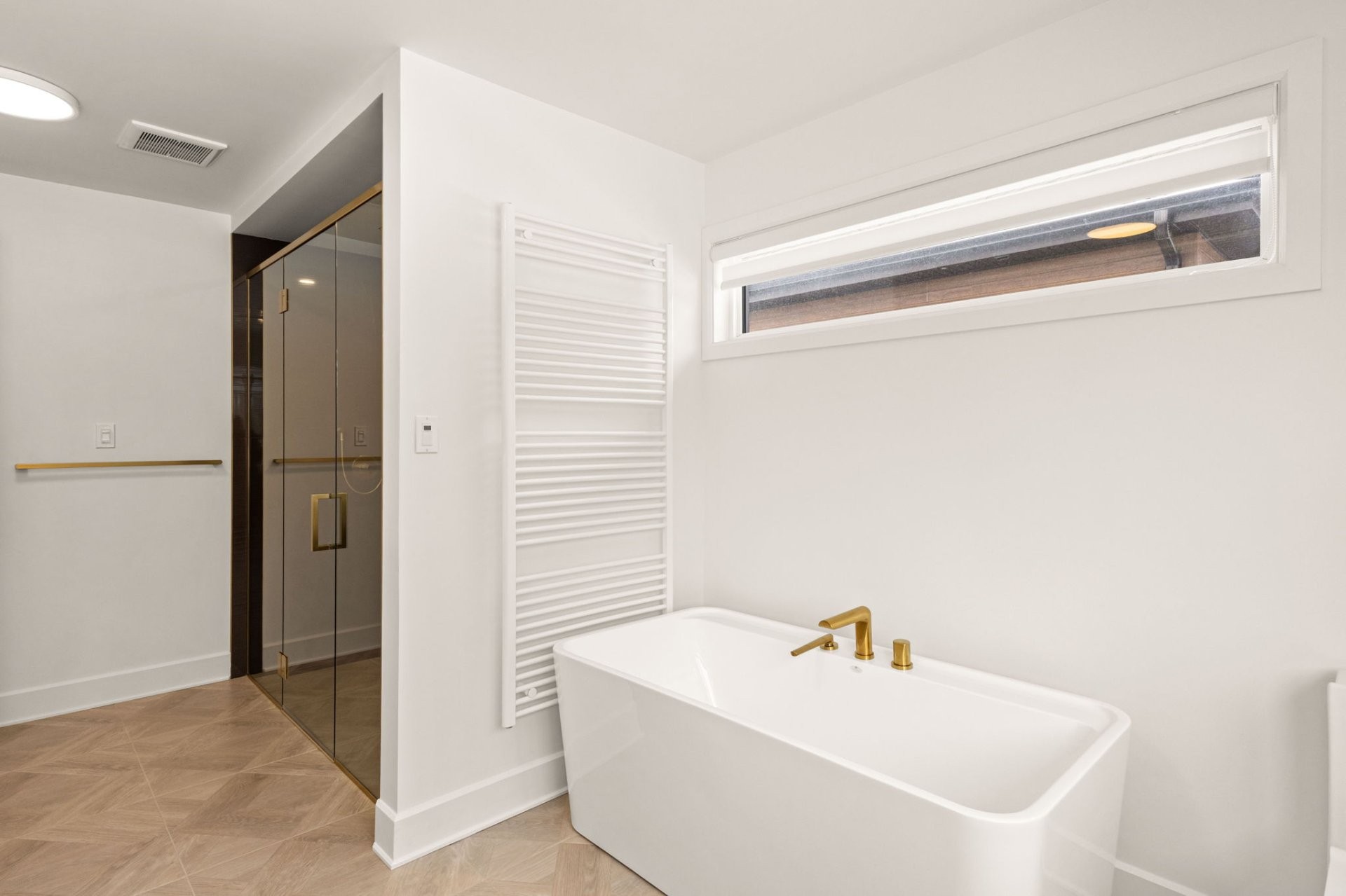 - Salle de bain attenante avec baignoire profonde, douche vitrée et double vasque