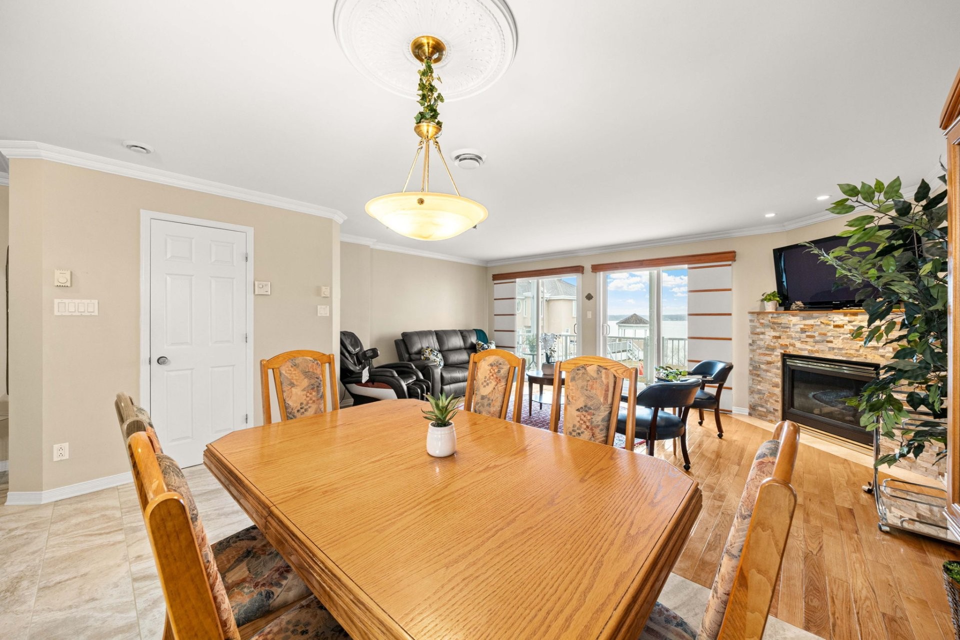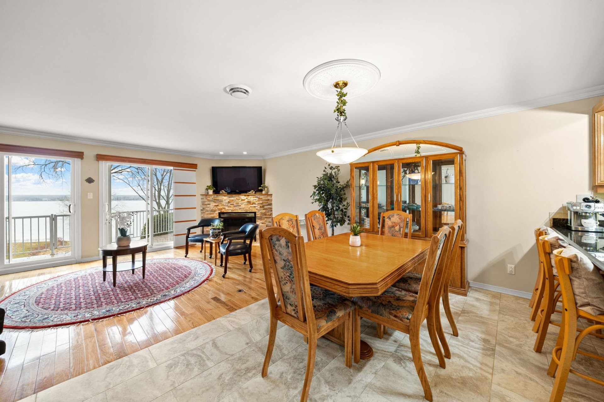 * Aire de vie et salle à manger à aire ouverte avec vue sur l'eau