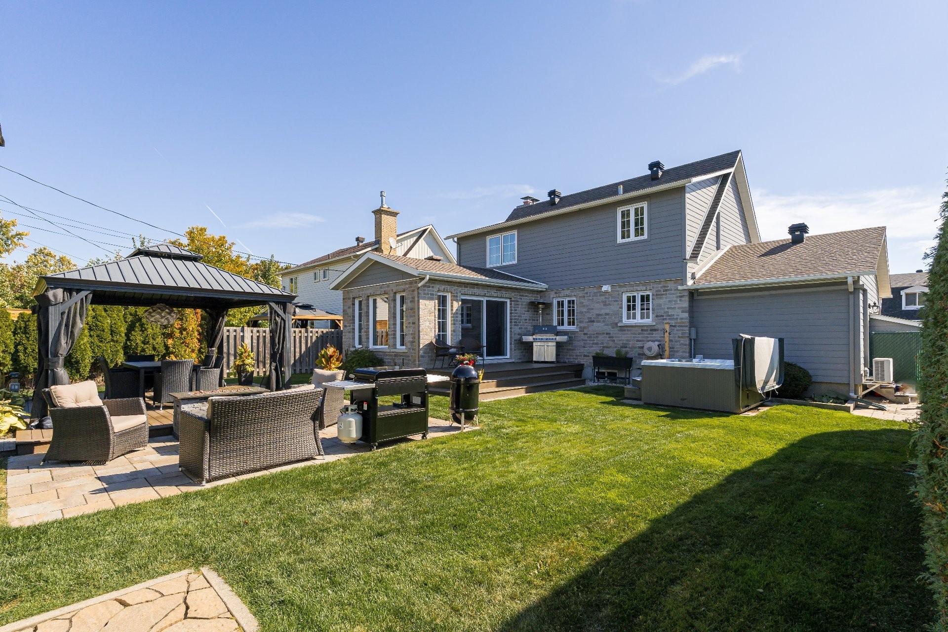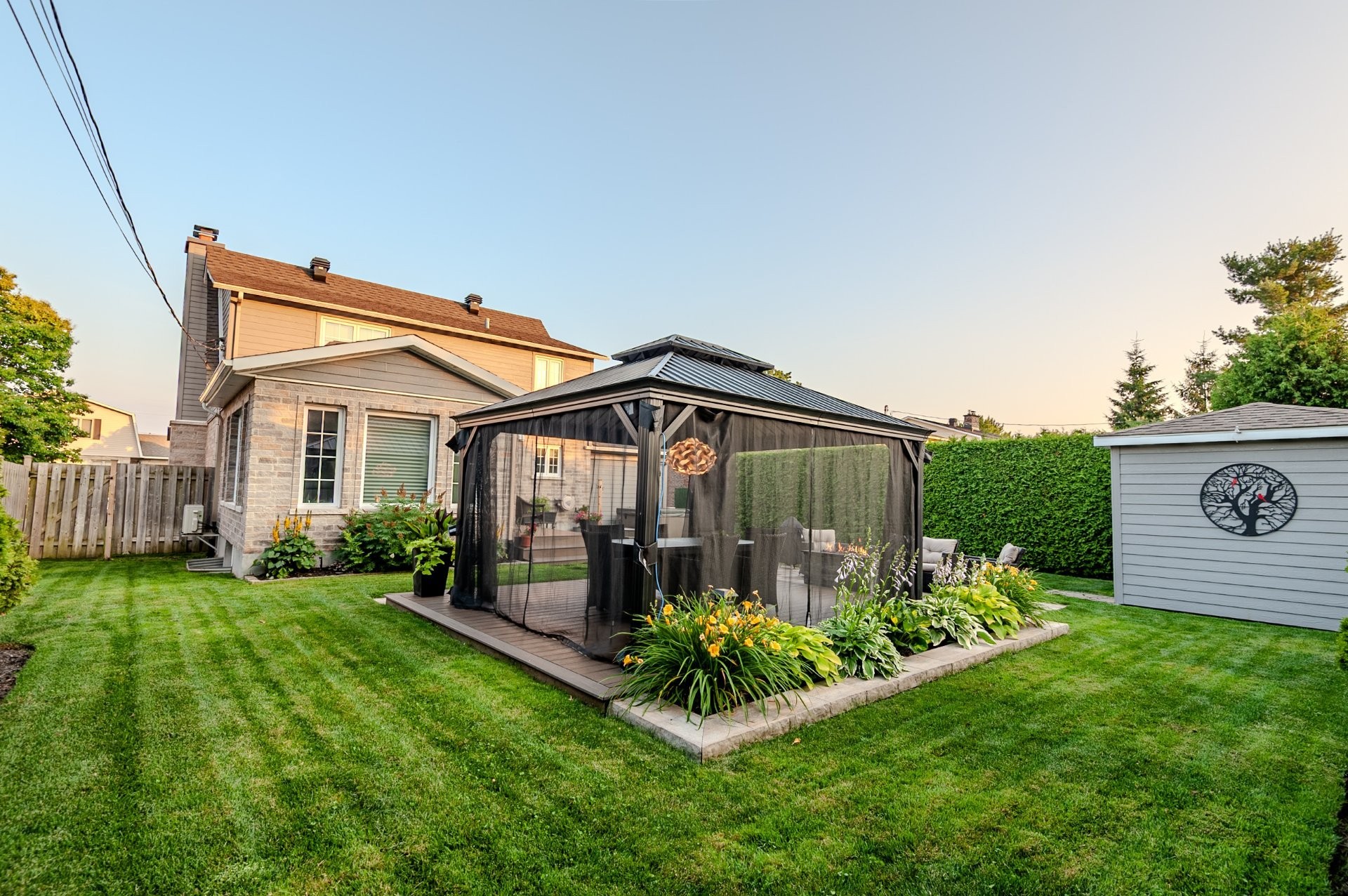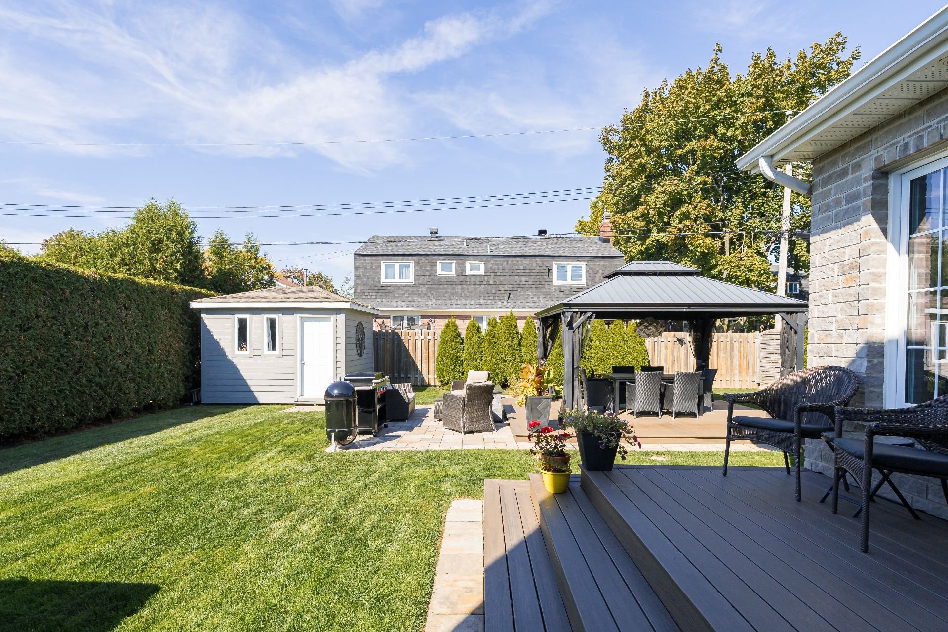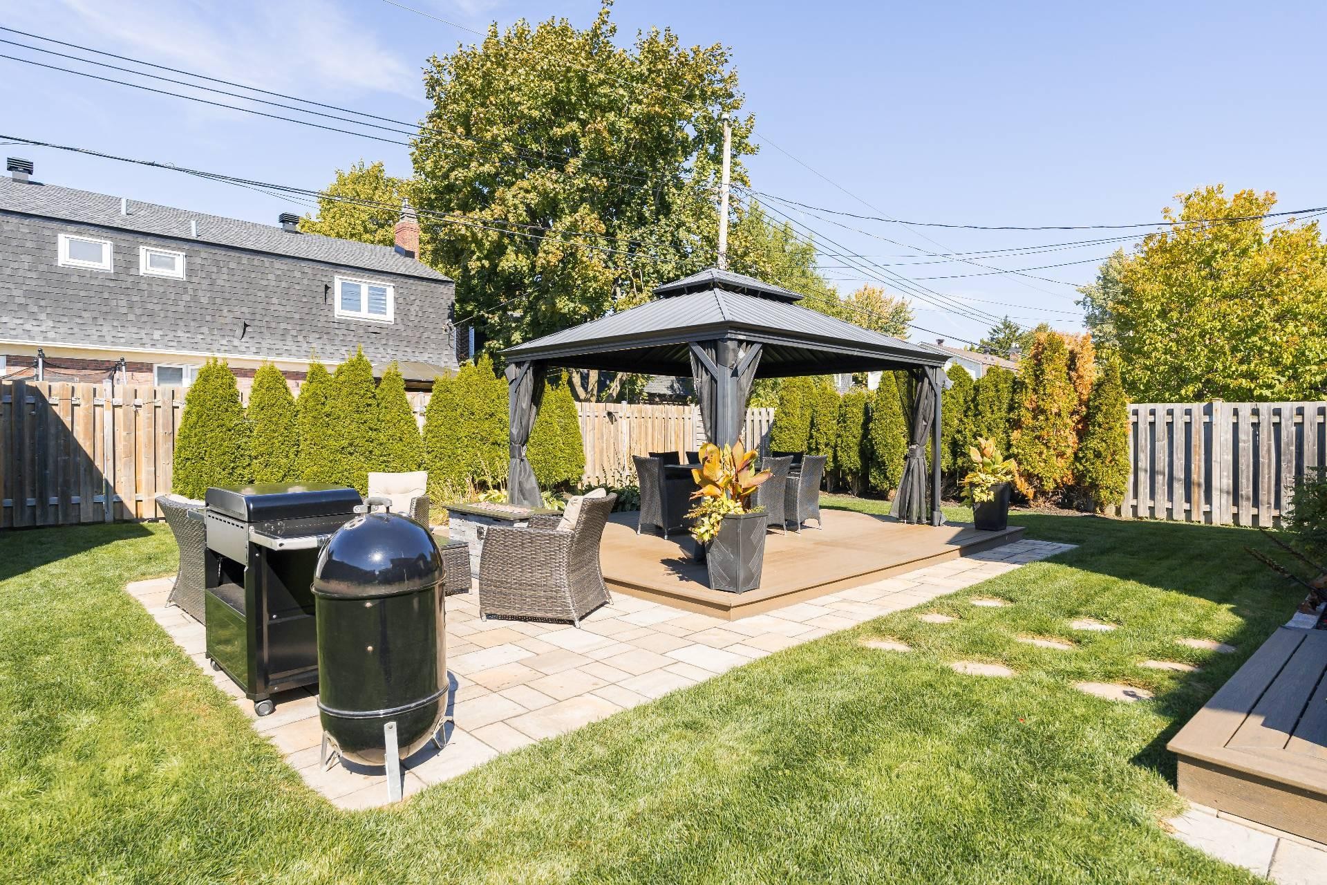 La cour arrière entièrement clôturée et paysagée a été soigneusement aménagée avec un foyer extérieur, un gazebo, un cabanon et une élégante terrasse en pavé Uni-stone, idéale pour profiter des rassemblements en toute saison. Un système d'irrigation intégré assure un entretien simplifié du terrain et réduit les tâches au fil des saisons.