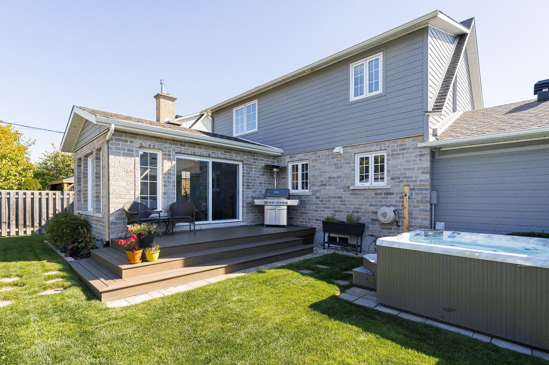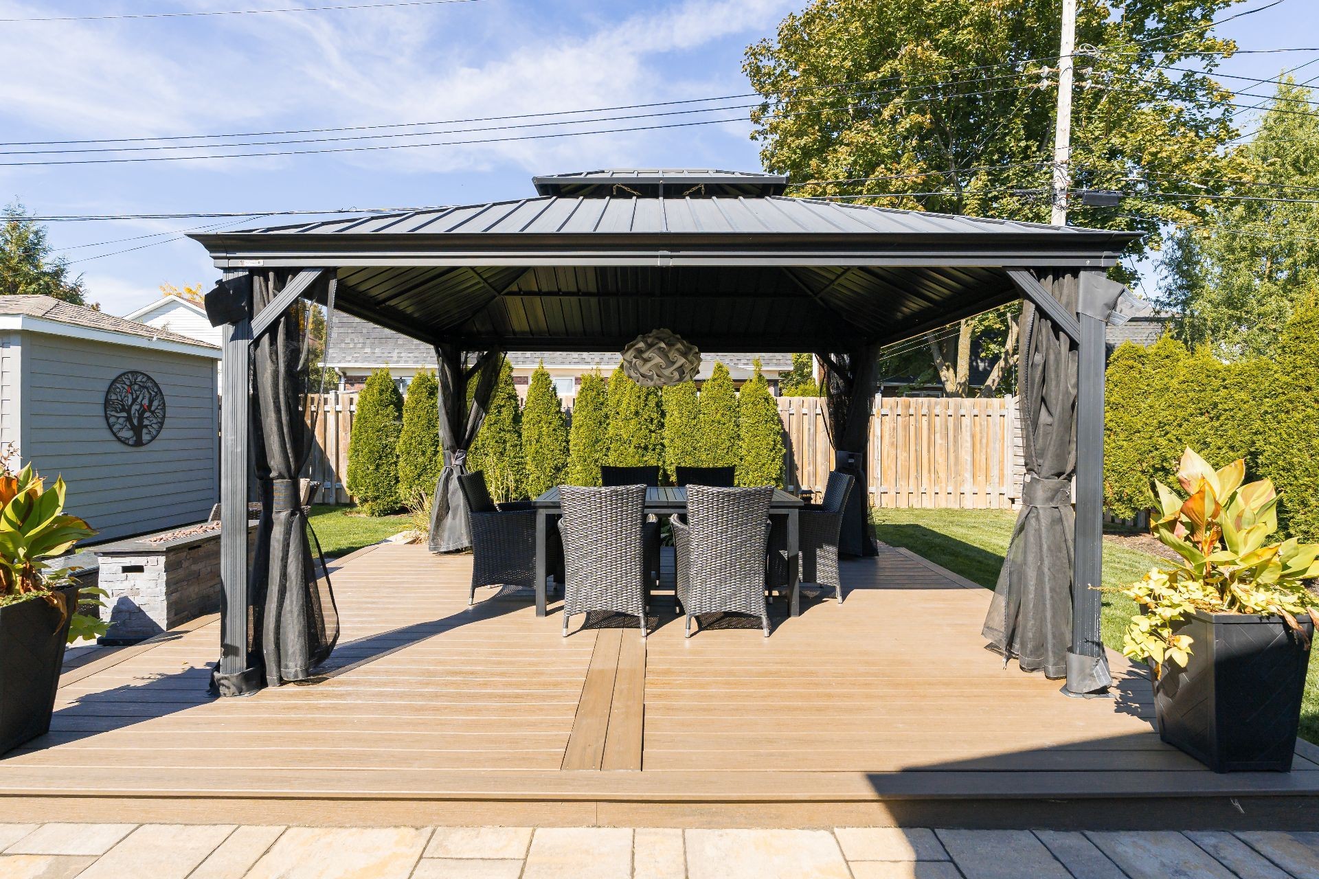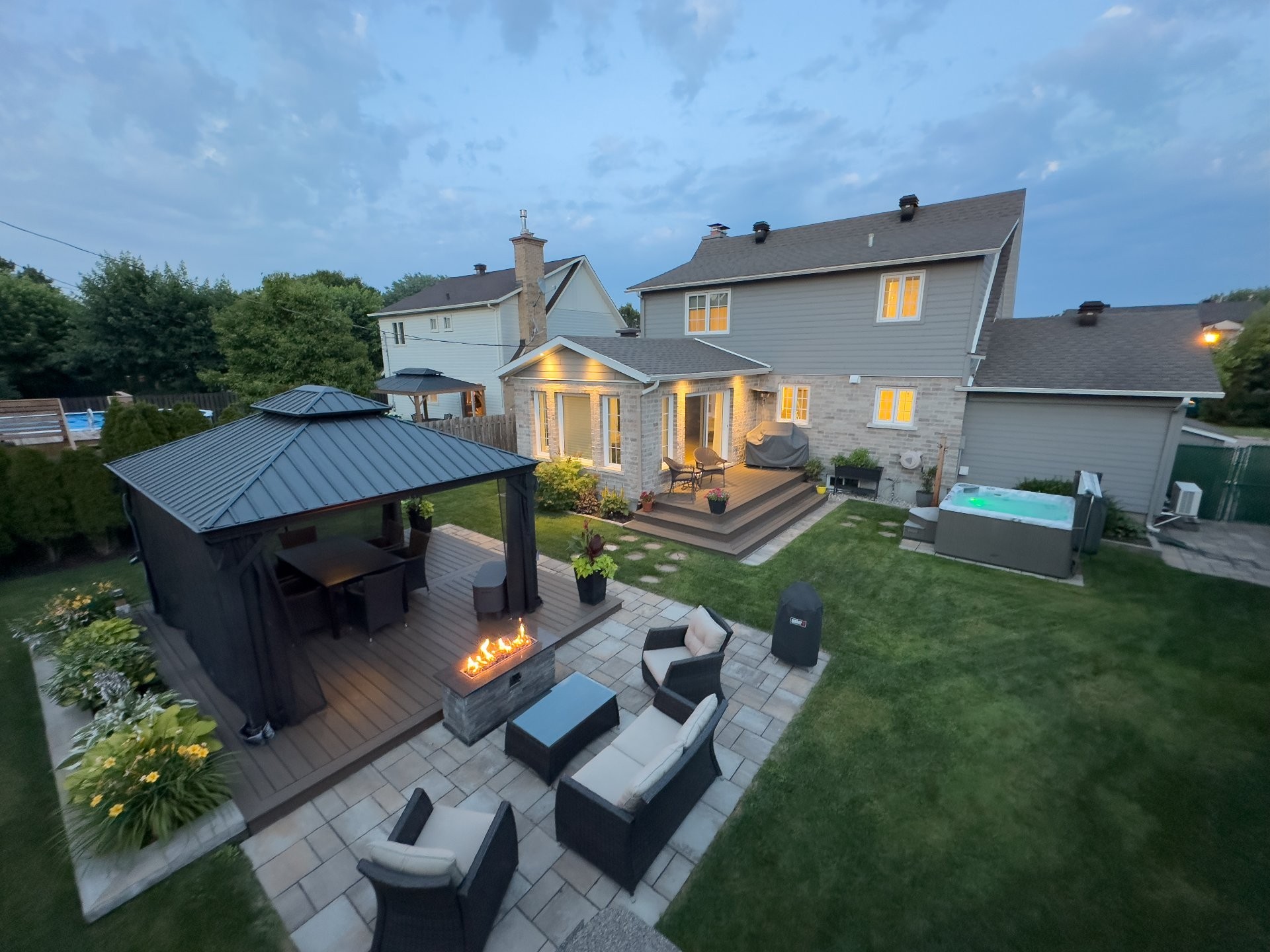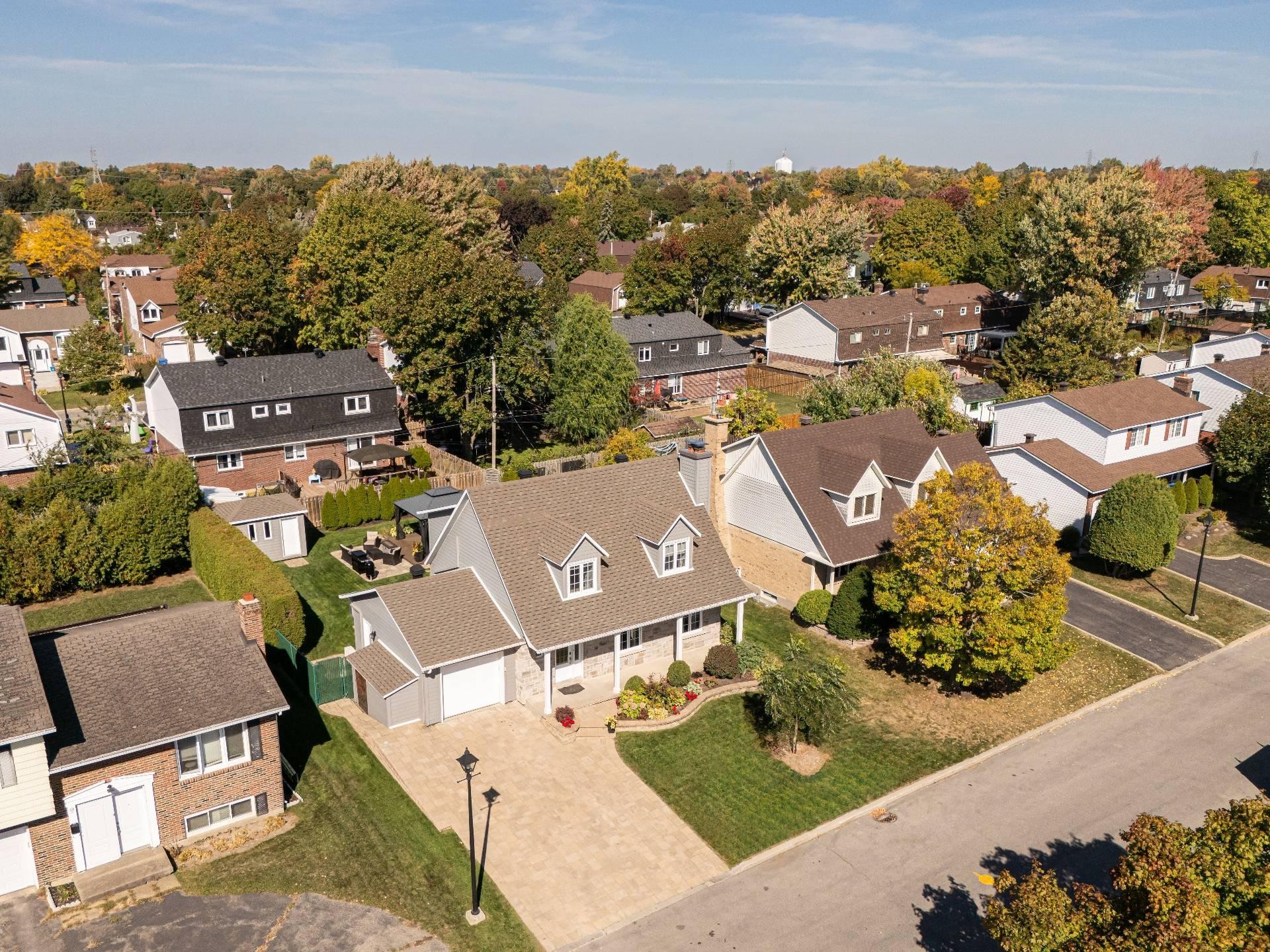 La cour arrière entièrement clôturée et paysagée a été soigneusement aménagée avec un foyer extérieur, un gazebo, un cabanon et une élégante terrasse en pavé Uni-stone, idéale pour profiter des rassemblements en toute saison. Un système d'irrigation intégré assure un entretien simplifié du terrain et réduit les tâches au fil des saisons.