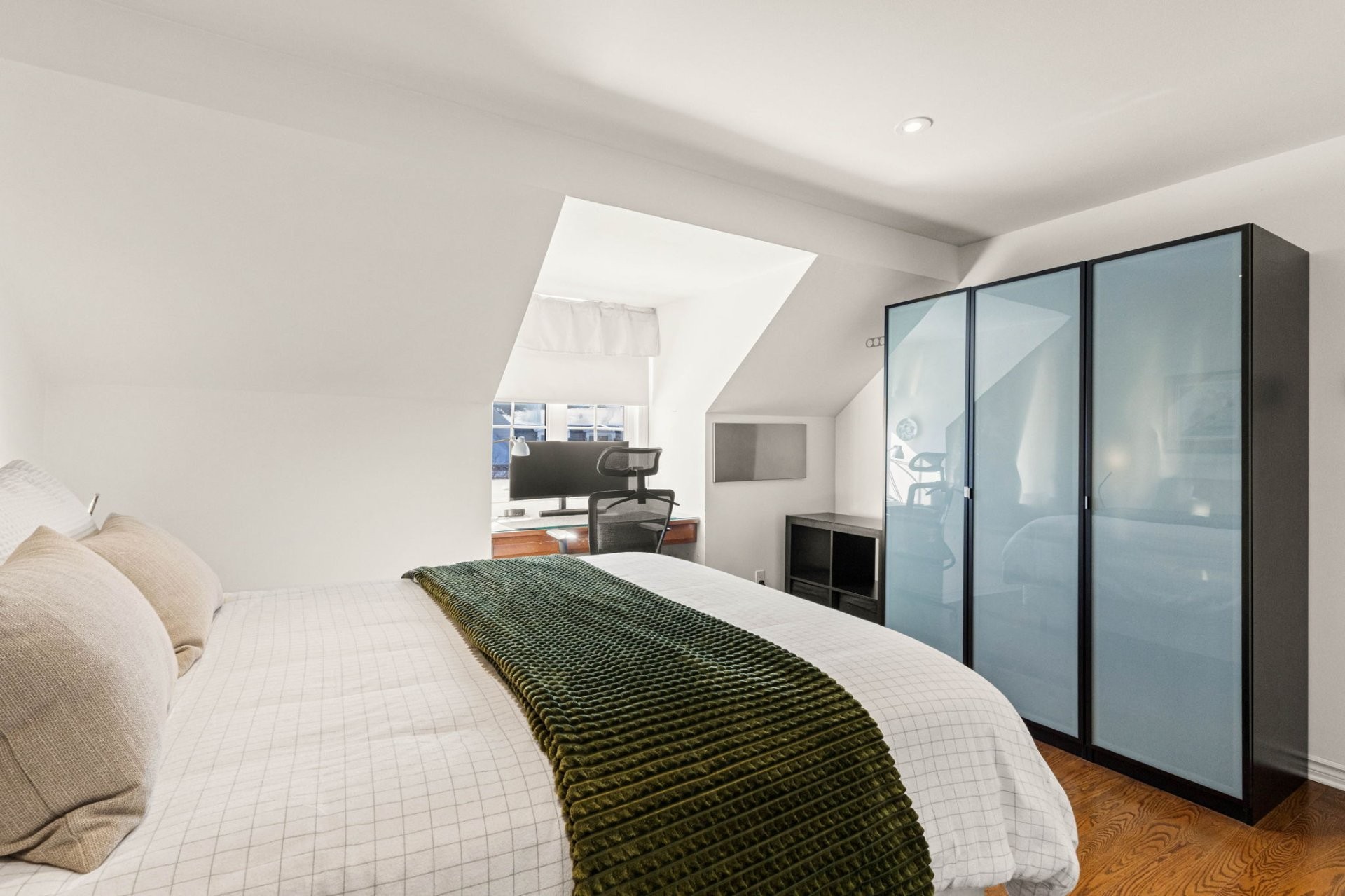 À l'étage, la chambre principale est munie de superbes rangements intégrés sur mesure. Deux autres chambres de bonnes dimensions ainsi qu'une salle de bains familiale rénovée avec planchers chauffants assurent le confort et la fonctionnalité.