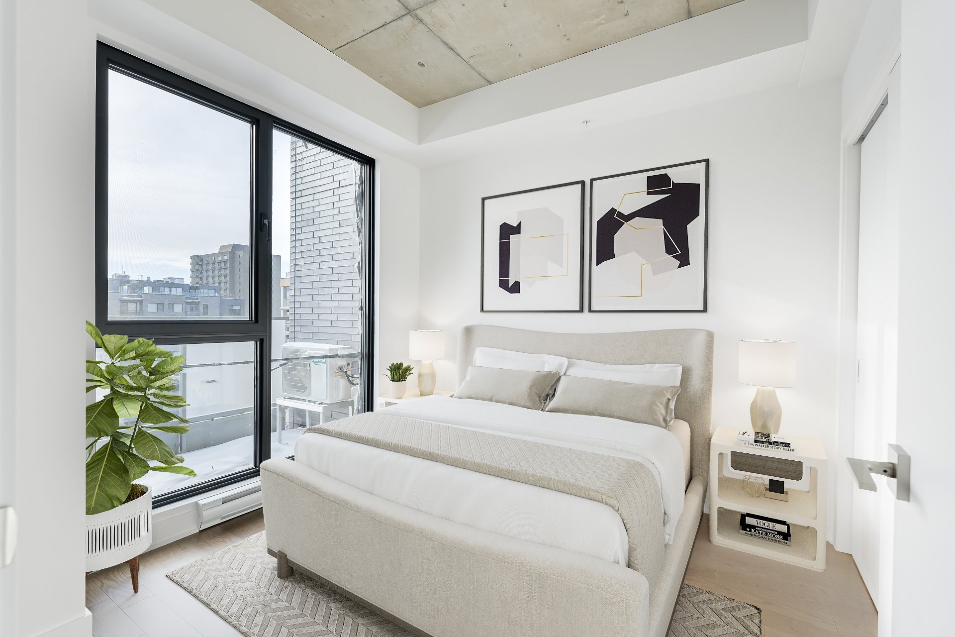 Unité de coin partiellement meublé moderne au YUL avec 2 chambres, 1 salle de bain et espace lumineux à aire ouverte. Fenêtres pleine hauteu...