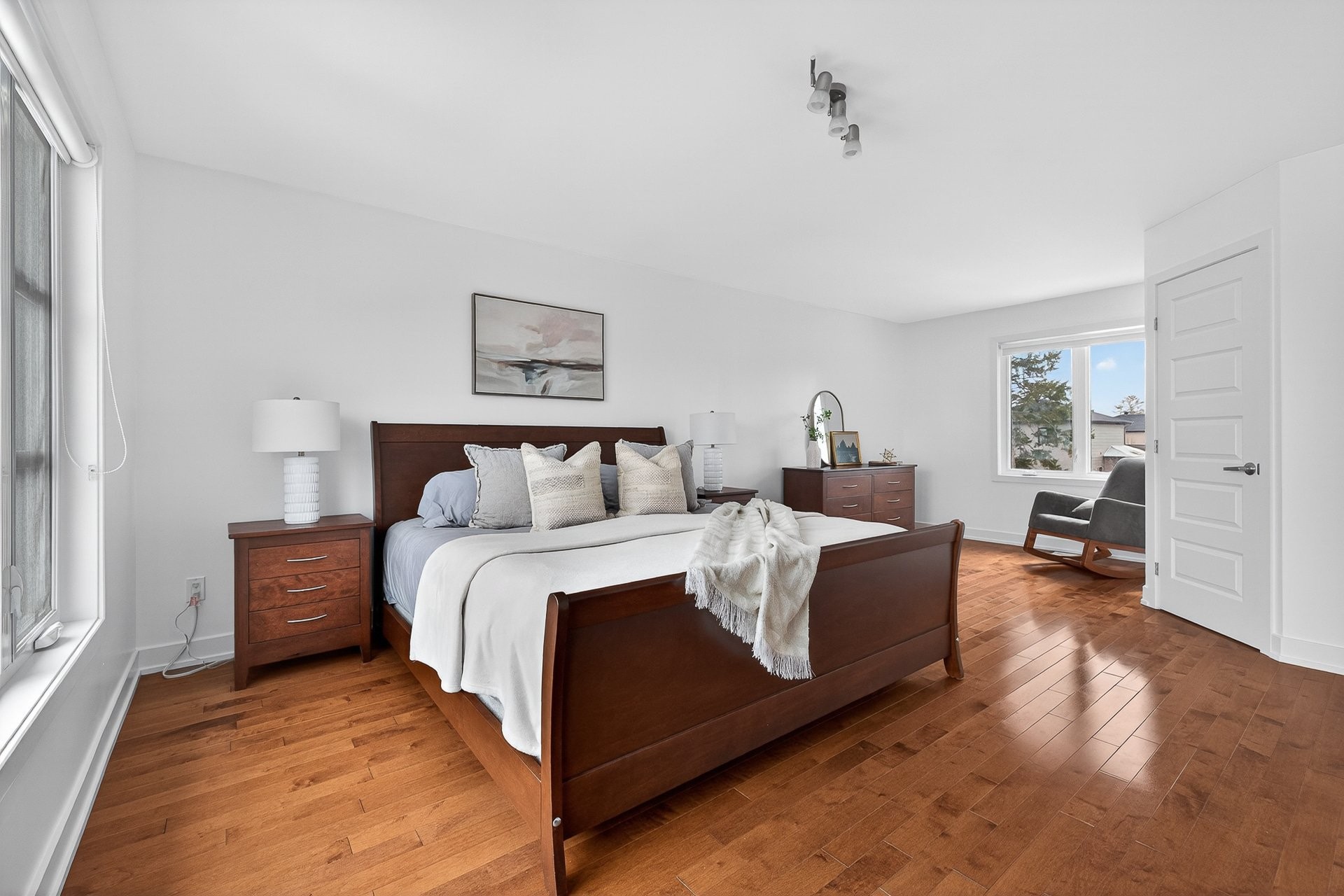 À l'étage, vous découvrirez quatre chambres de belles dimensions, dont une spacieuse chambre principale avec coin boudoir et salle de bain privée attenante comprenant douche vitrée, bain podium et grand meuble lavabo avec grand espace de comptoir. Une deuxième salle de bain avec bain-douche et meuble pratique complète l'étage.
