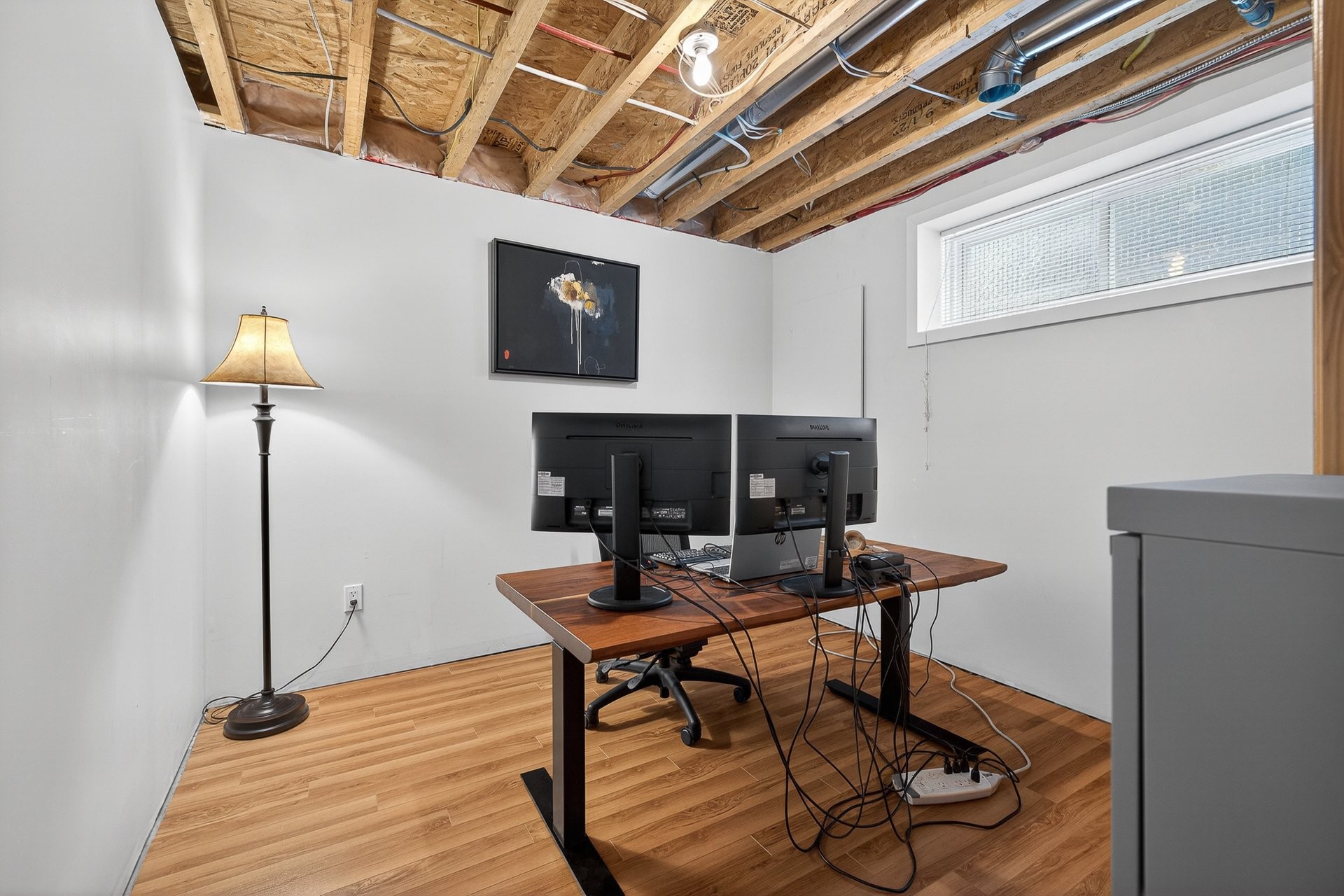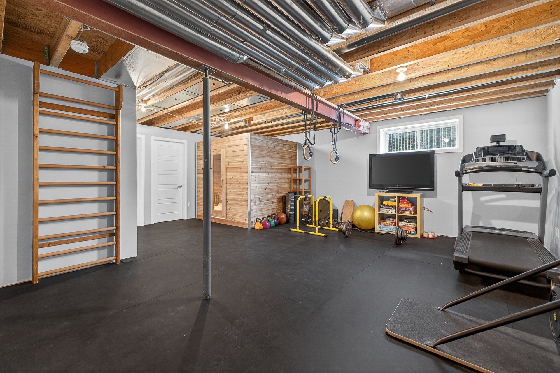 Le sous-sol, actuellement aménagé en gym, offre une belle polyvalence avec une salle familiale, une chambre supplémentaire ainsi qu'une salle de lavage.