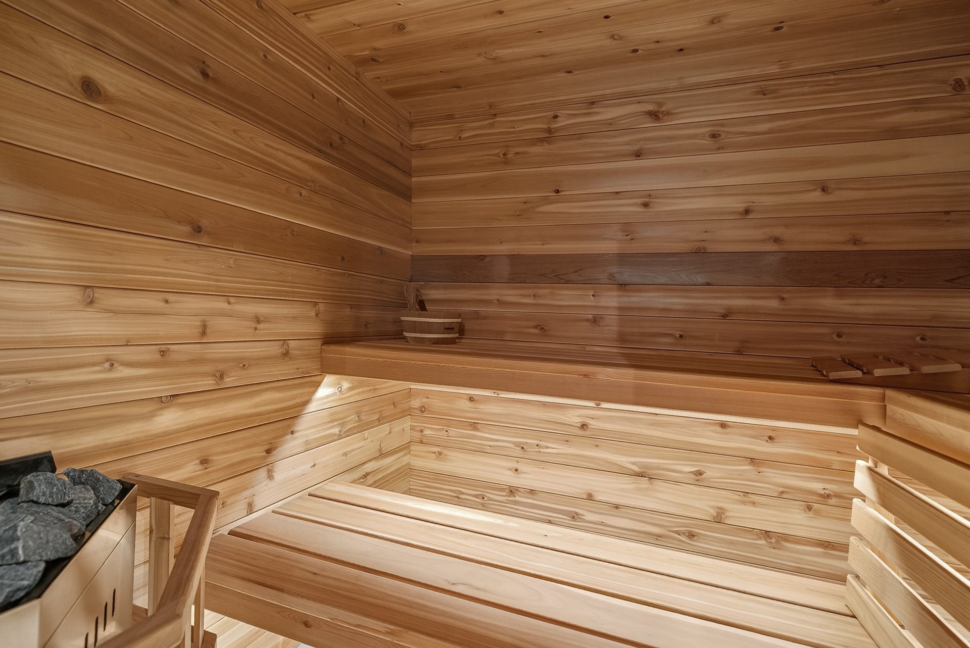 chauffe-eau, sauna au sous-sol, cellier