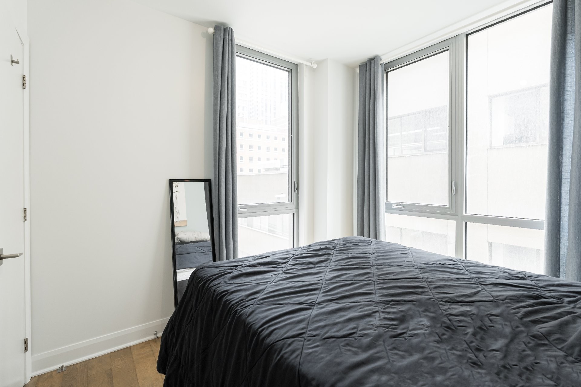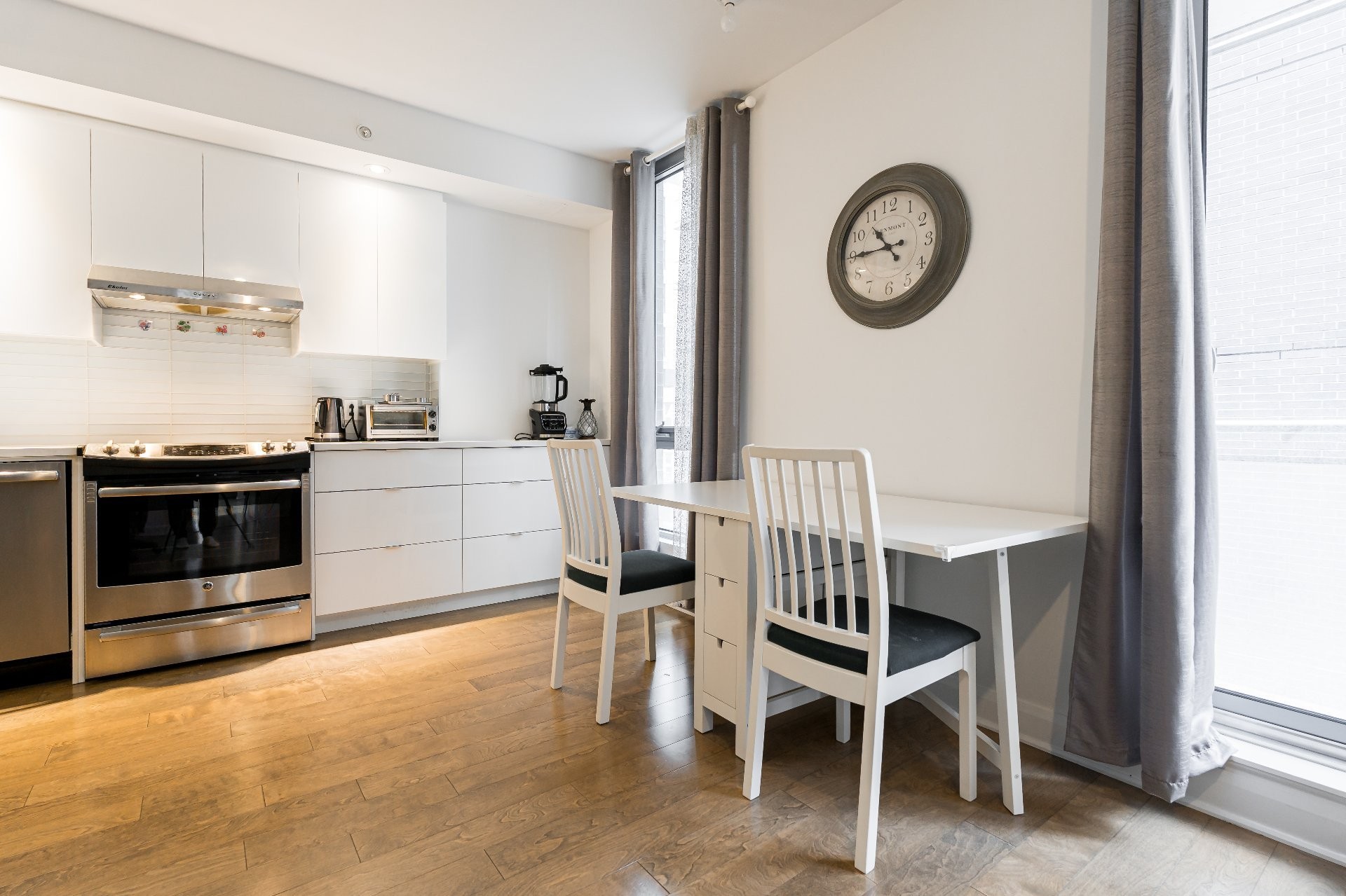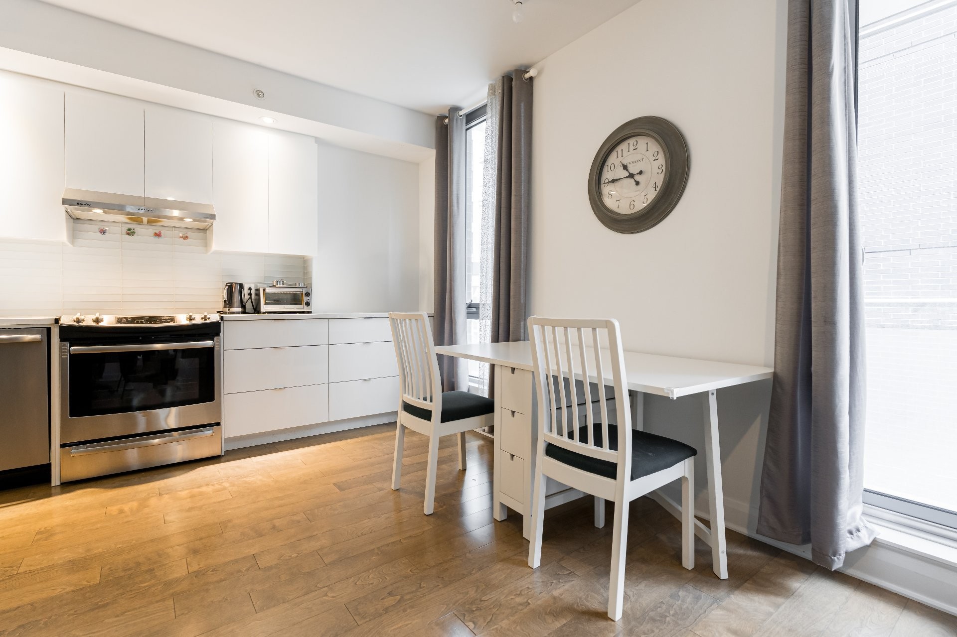 Unité de coin partiellement meublé moderne au YUL avec 2 chambres, 1 salle de bain et espace lumineux à aire ouverte. Fenêtres pleine hauteu...