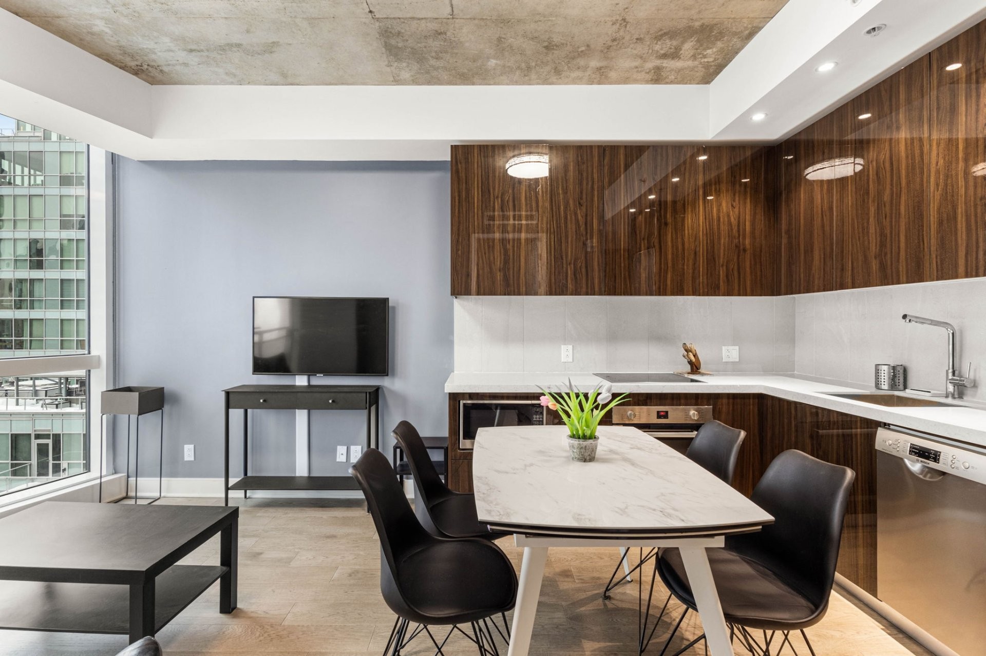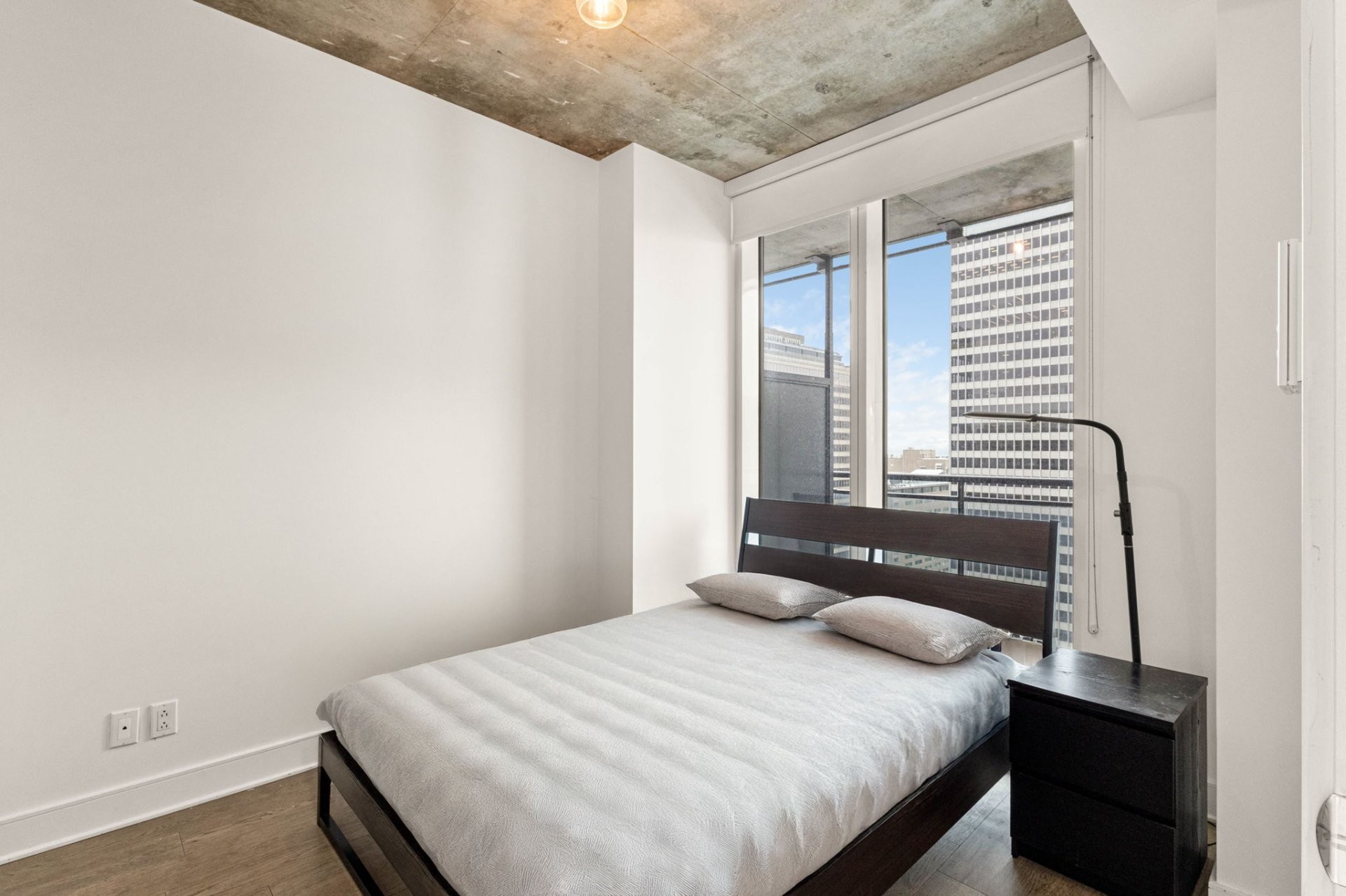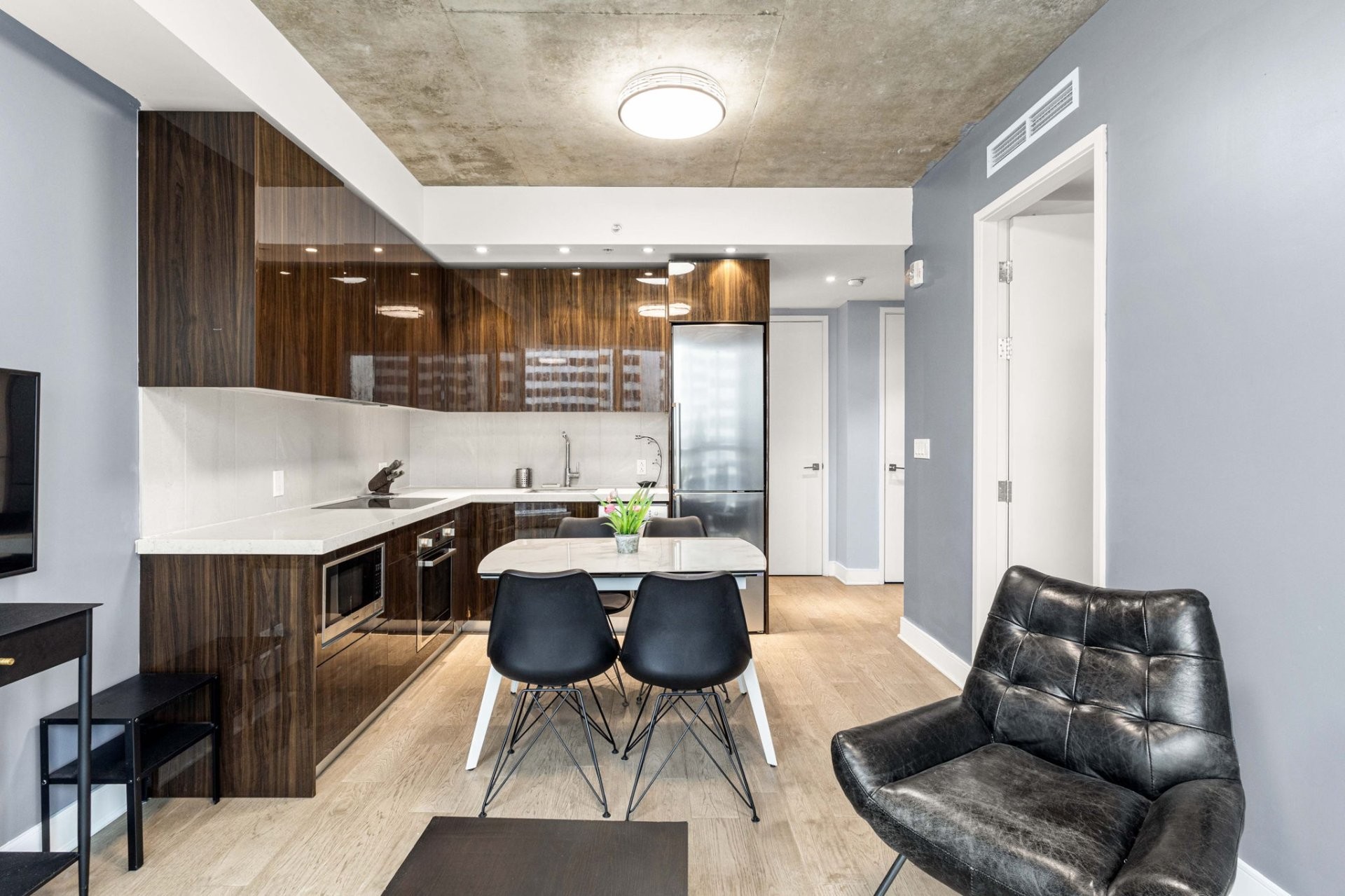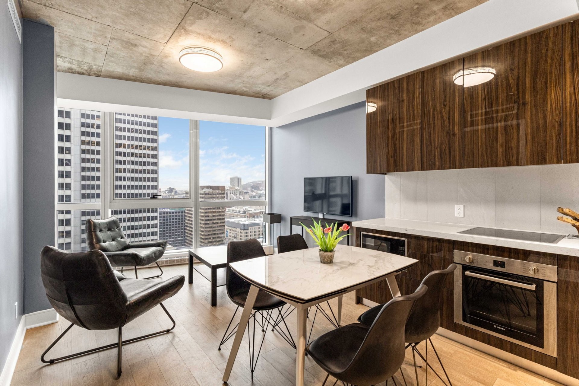 Unité de coin partiellement meublé moderne au YUL avec 2 chambres, 1 salle de bain et espace lumineux à aire ouverte. Fenêtres pleine hauteu...