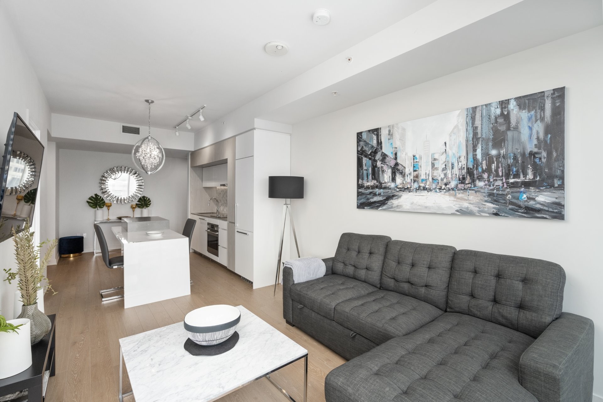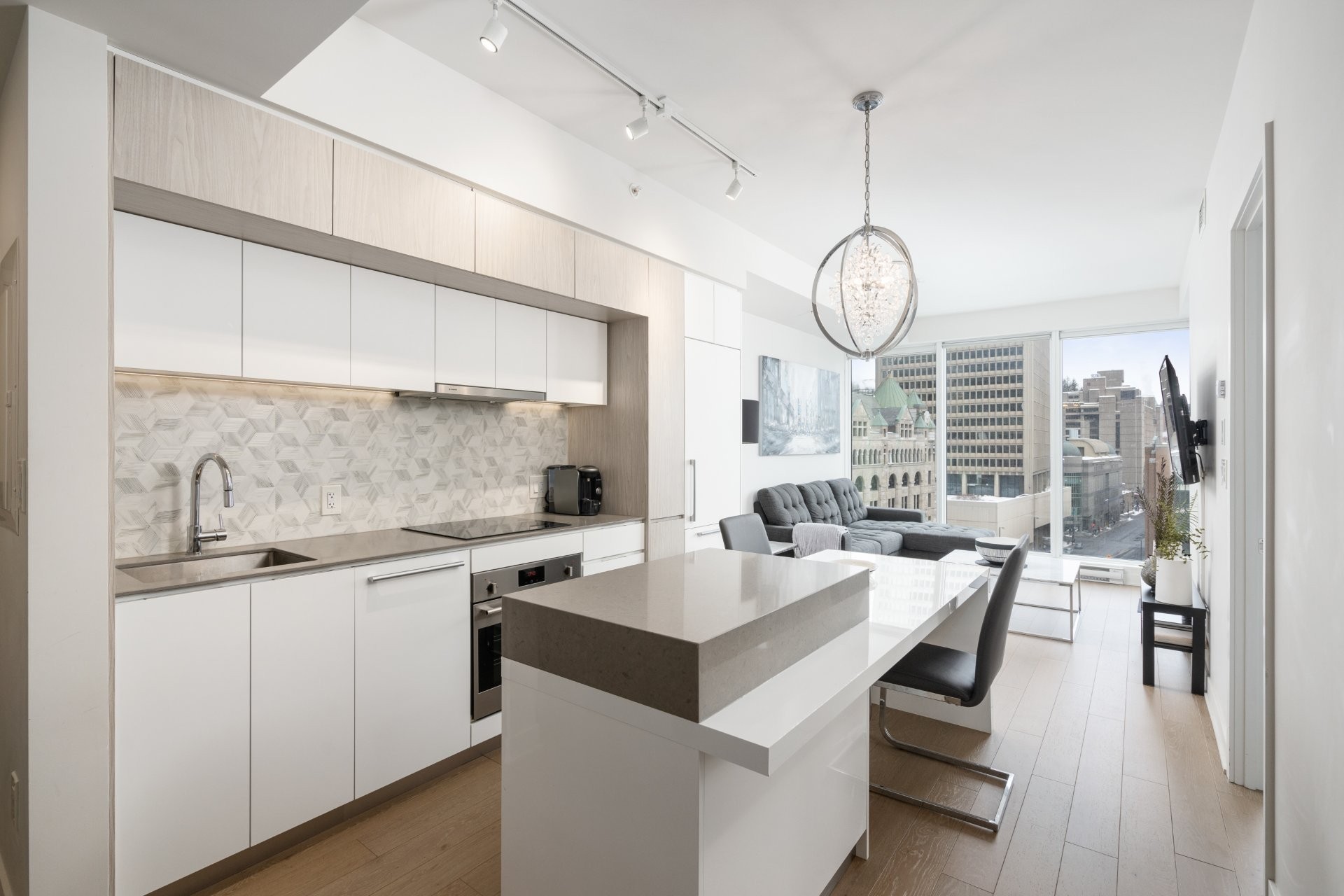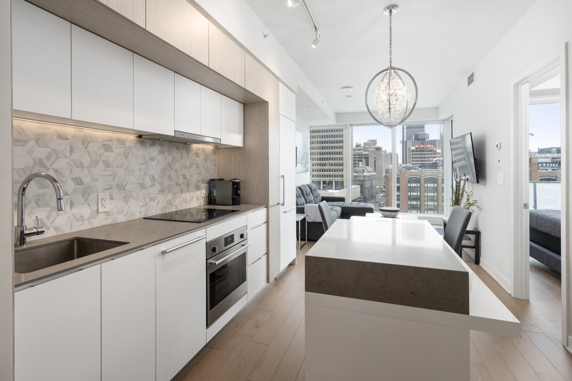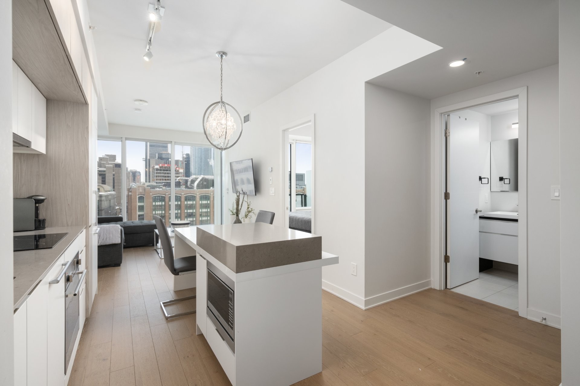 Unité de coin partiellement meublé moderne au YUL avec 2 chambres, 1 salle de bain et espace lumineux à aire ouverte. Fenêtres pleine hauteu...