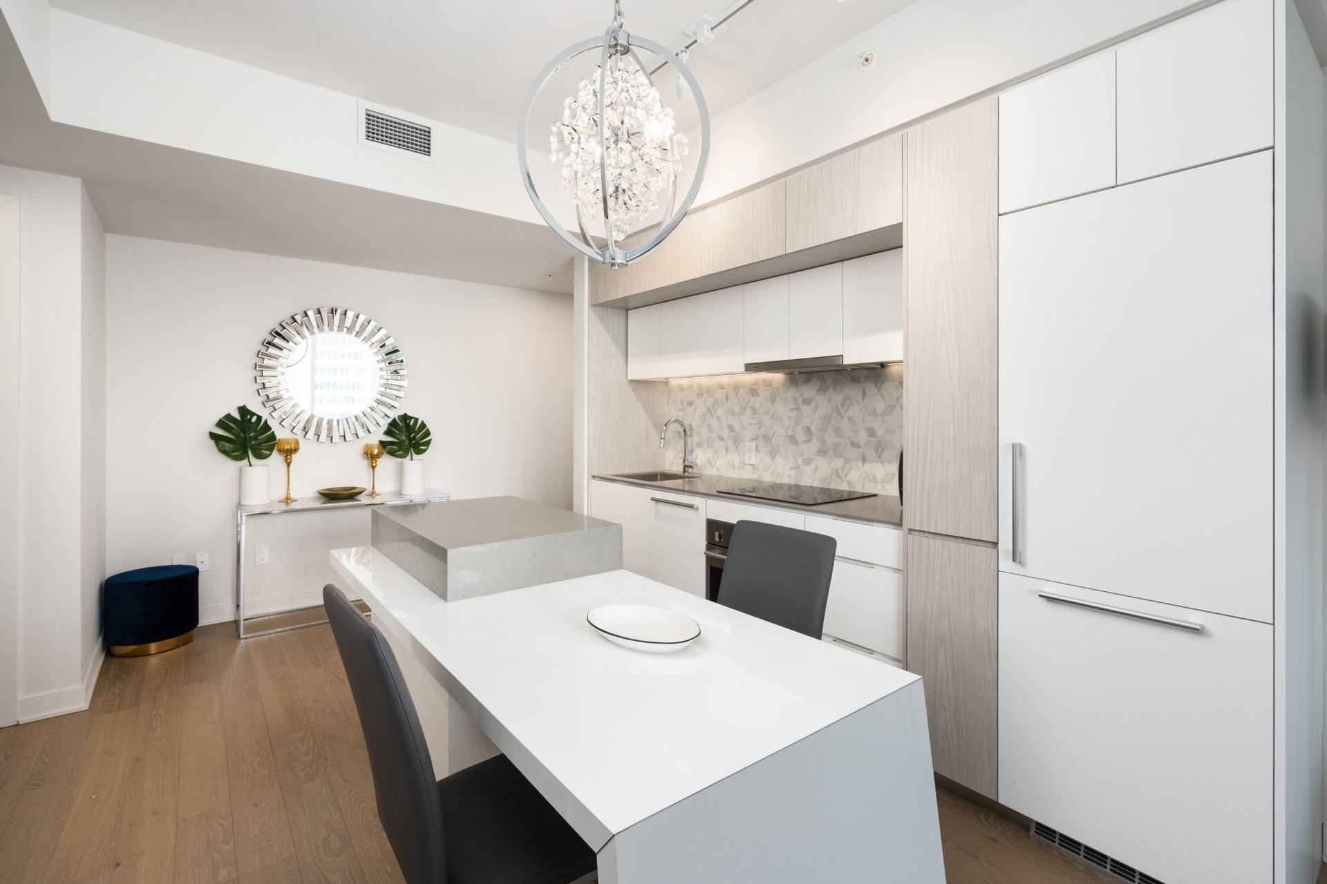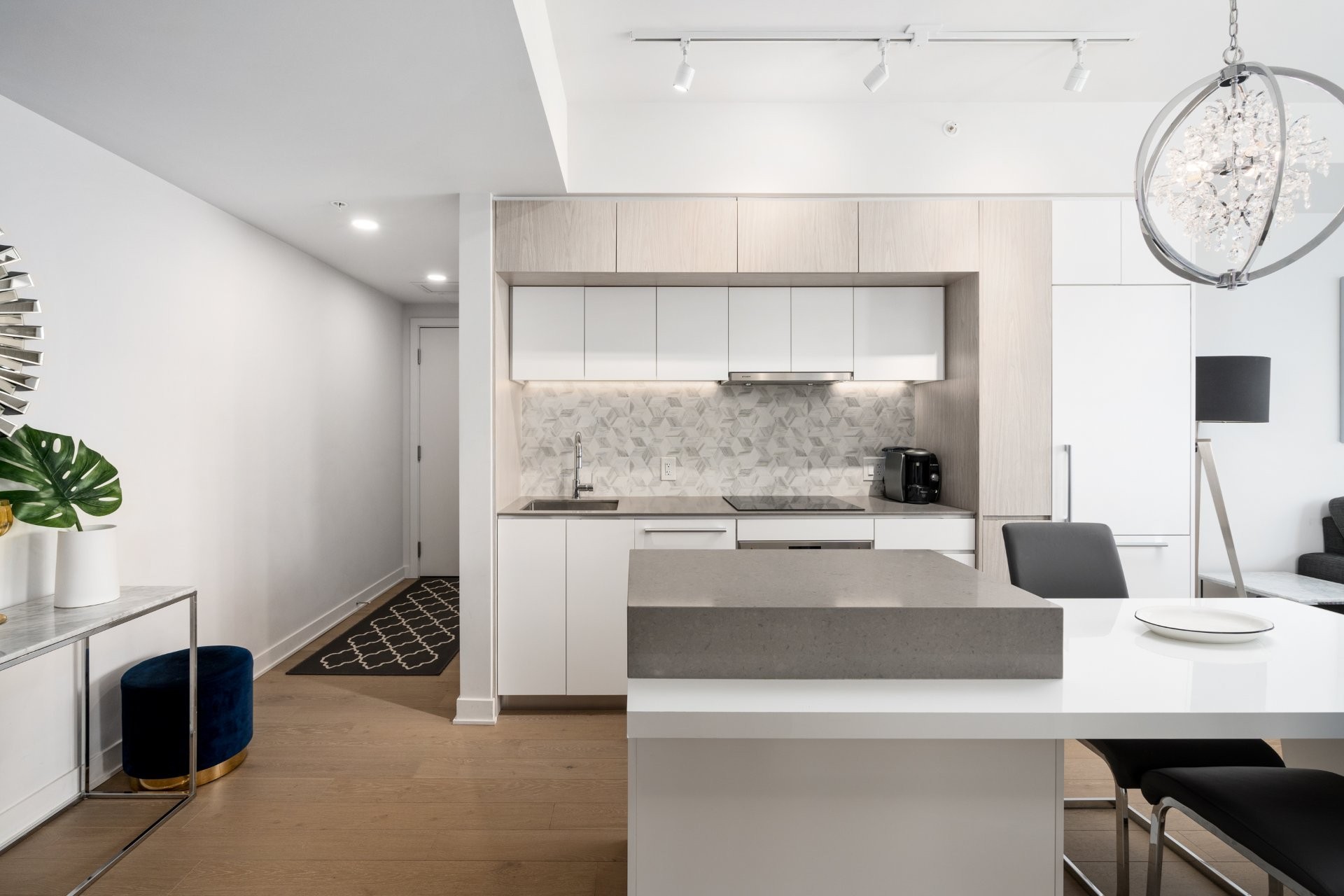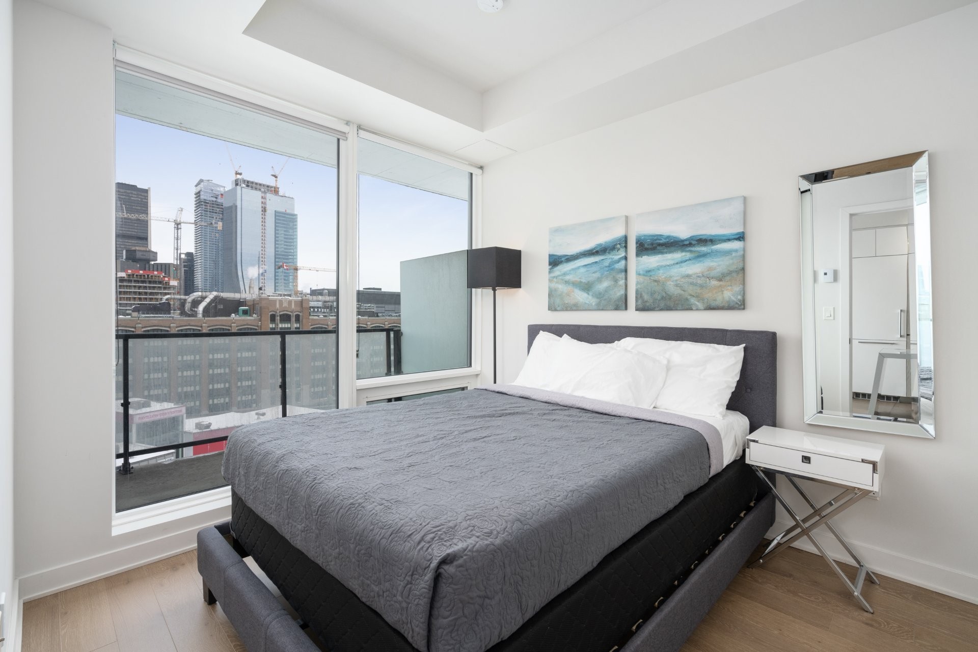 Unité de coin partiellement meublé moderne au YUL avec 2 chambres, 1 salle de bain et espace lumineux à aire ouverte. Fenêtres pleine hauteu...