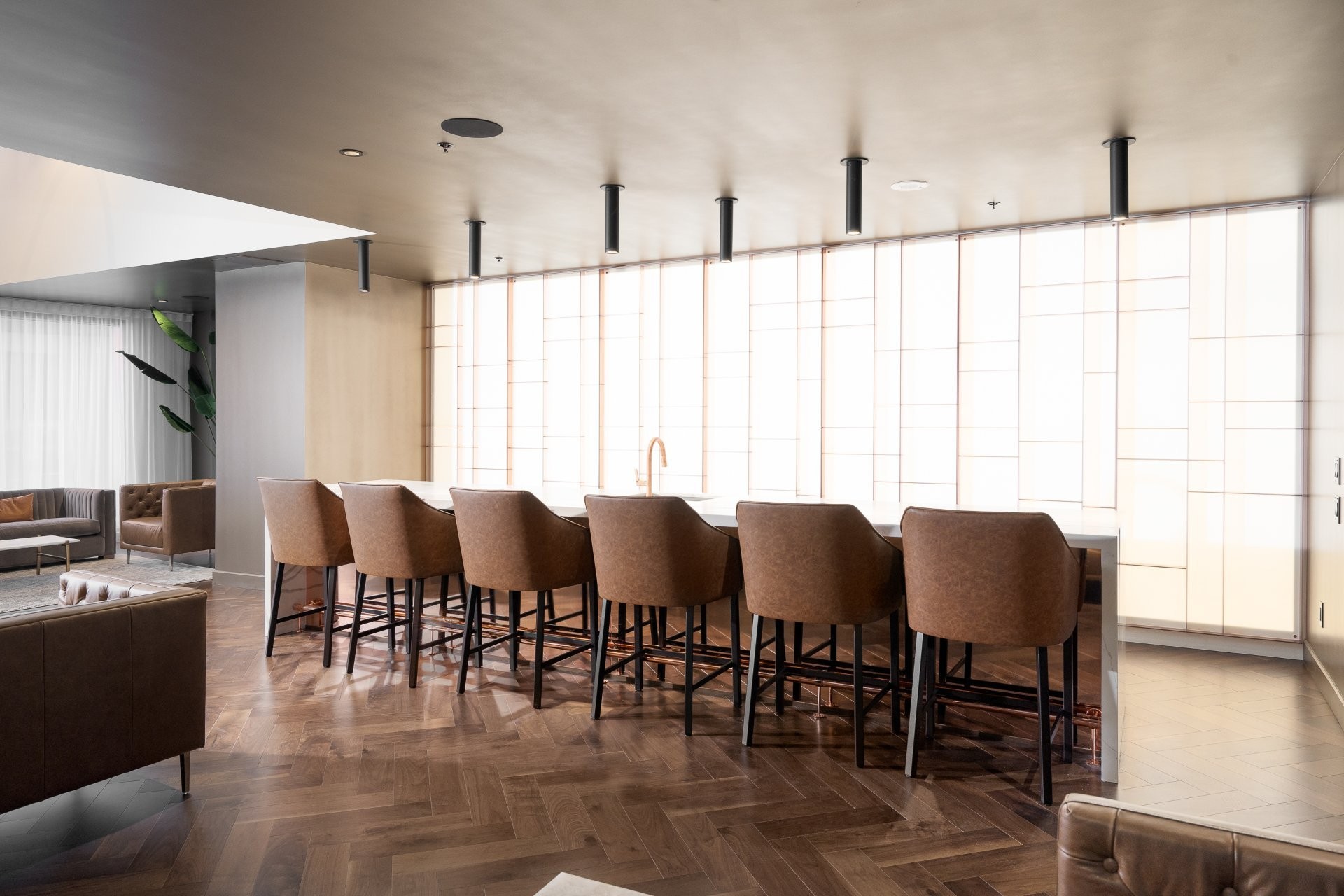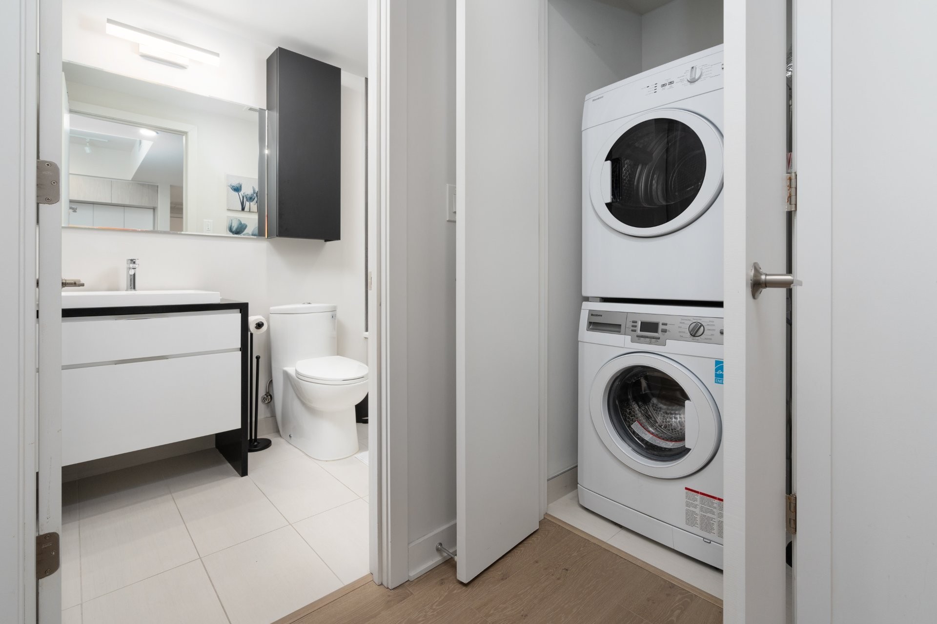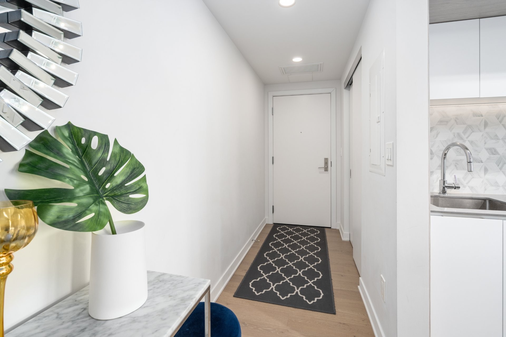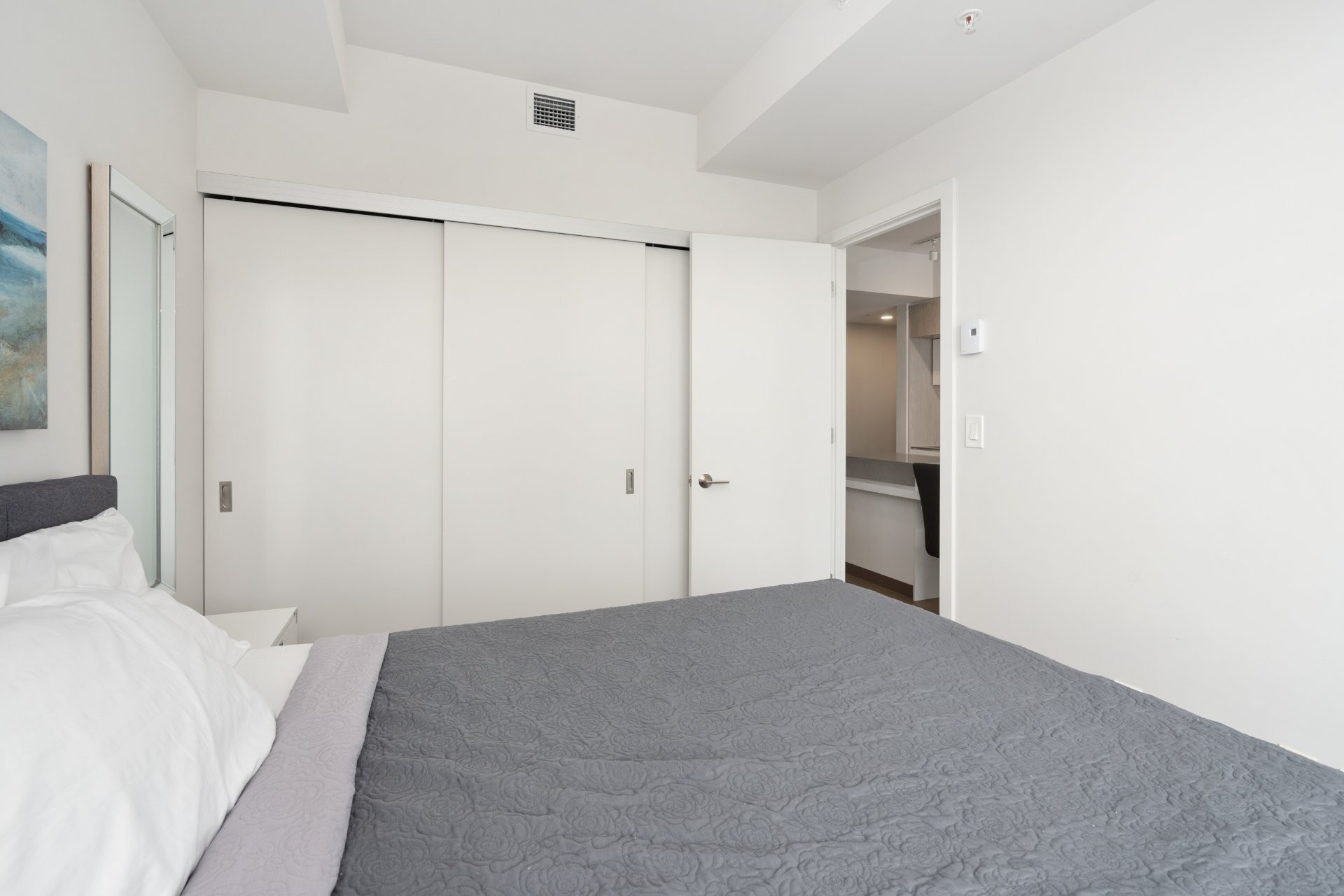 Unité de coin partiellement meublé moderne au YUL avec 2 chambres, 1 salle de bain et espace lumineux à aire ouverte. Fenêtres pleine hauteu...