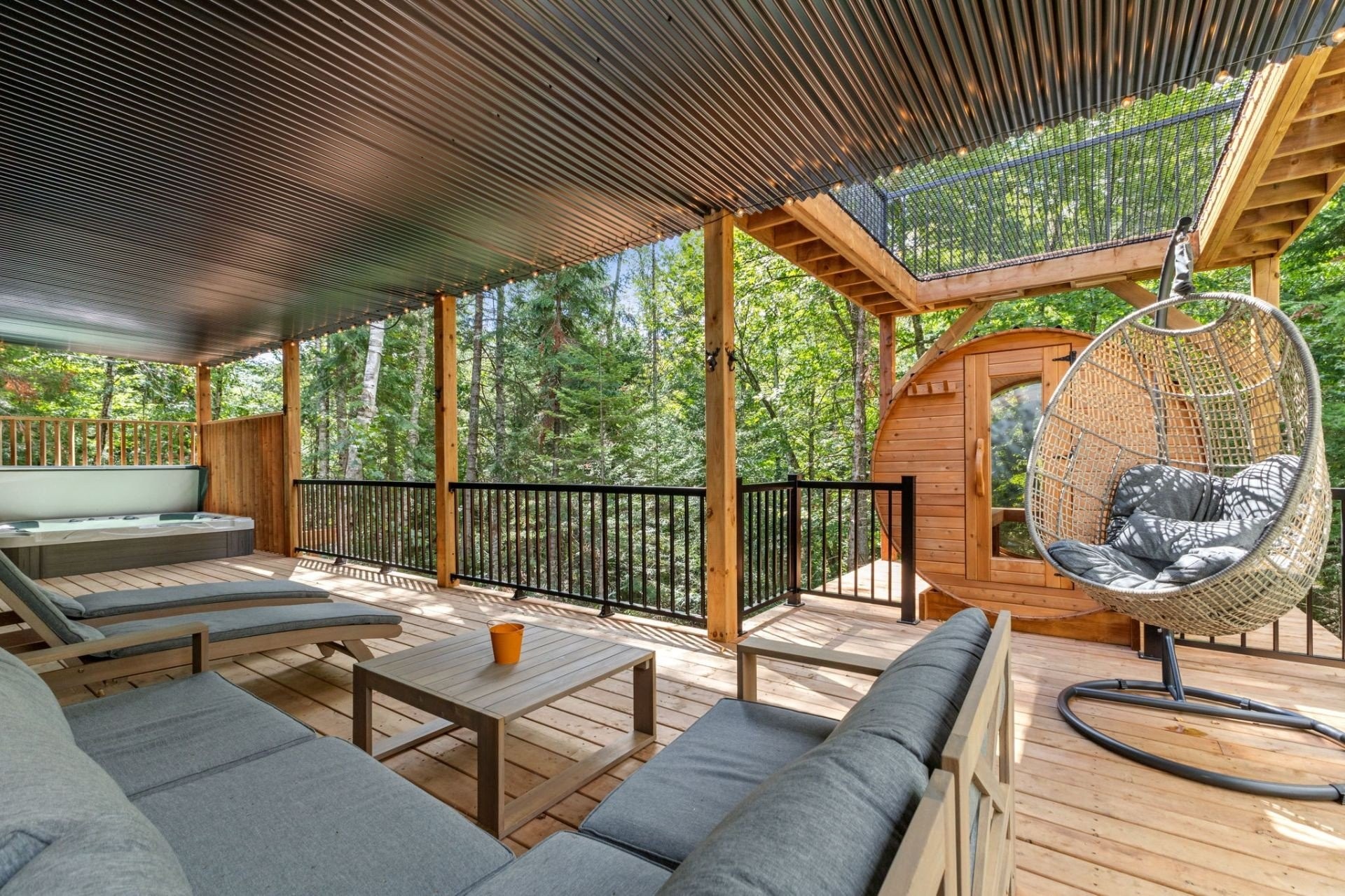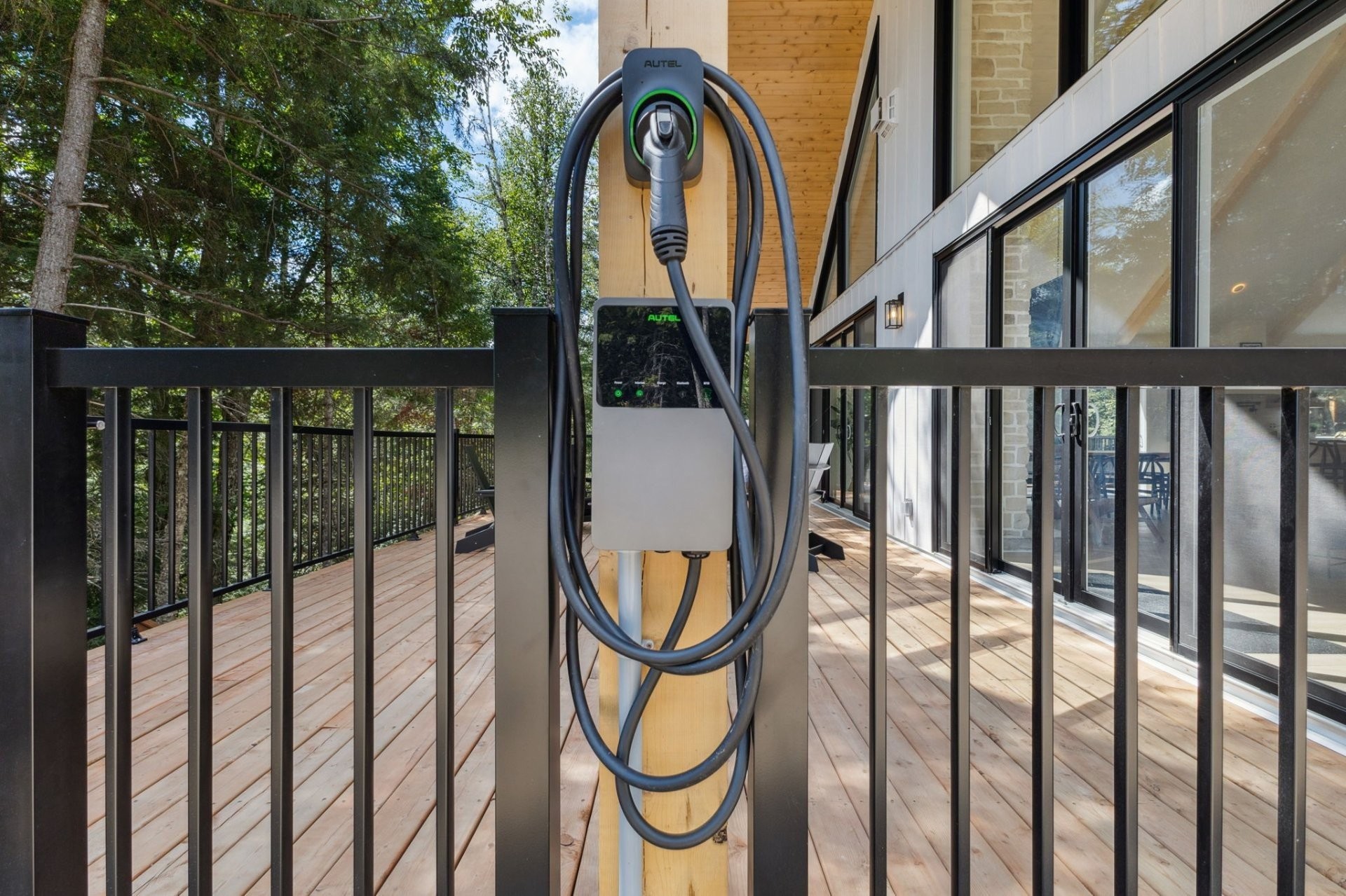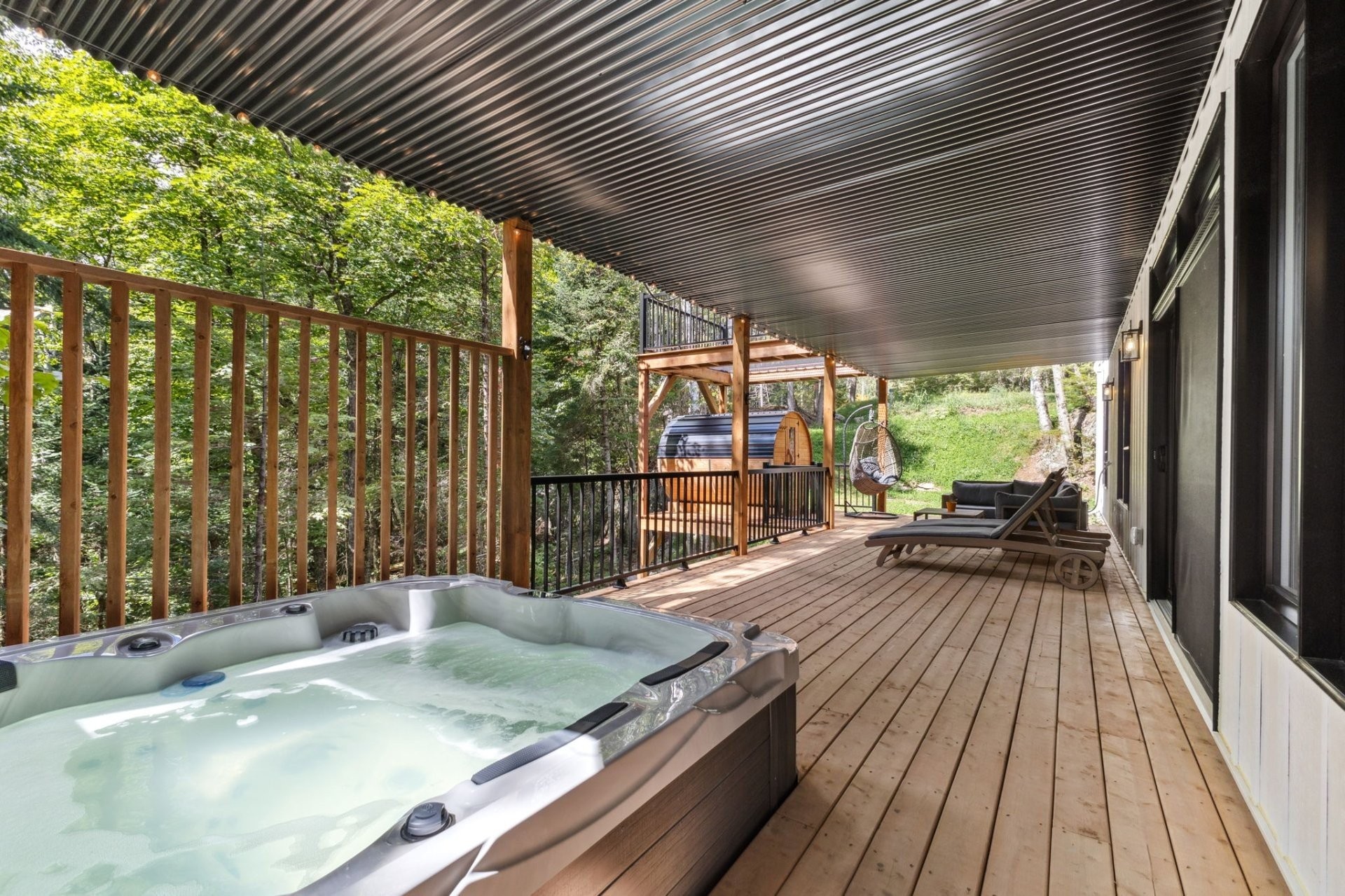 Jacuzzi, 1 thermopompe murale, terrasse en bois, finition de type toit cathédral, prise pour voiture électrique.