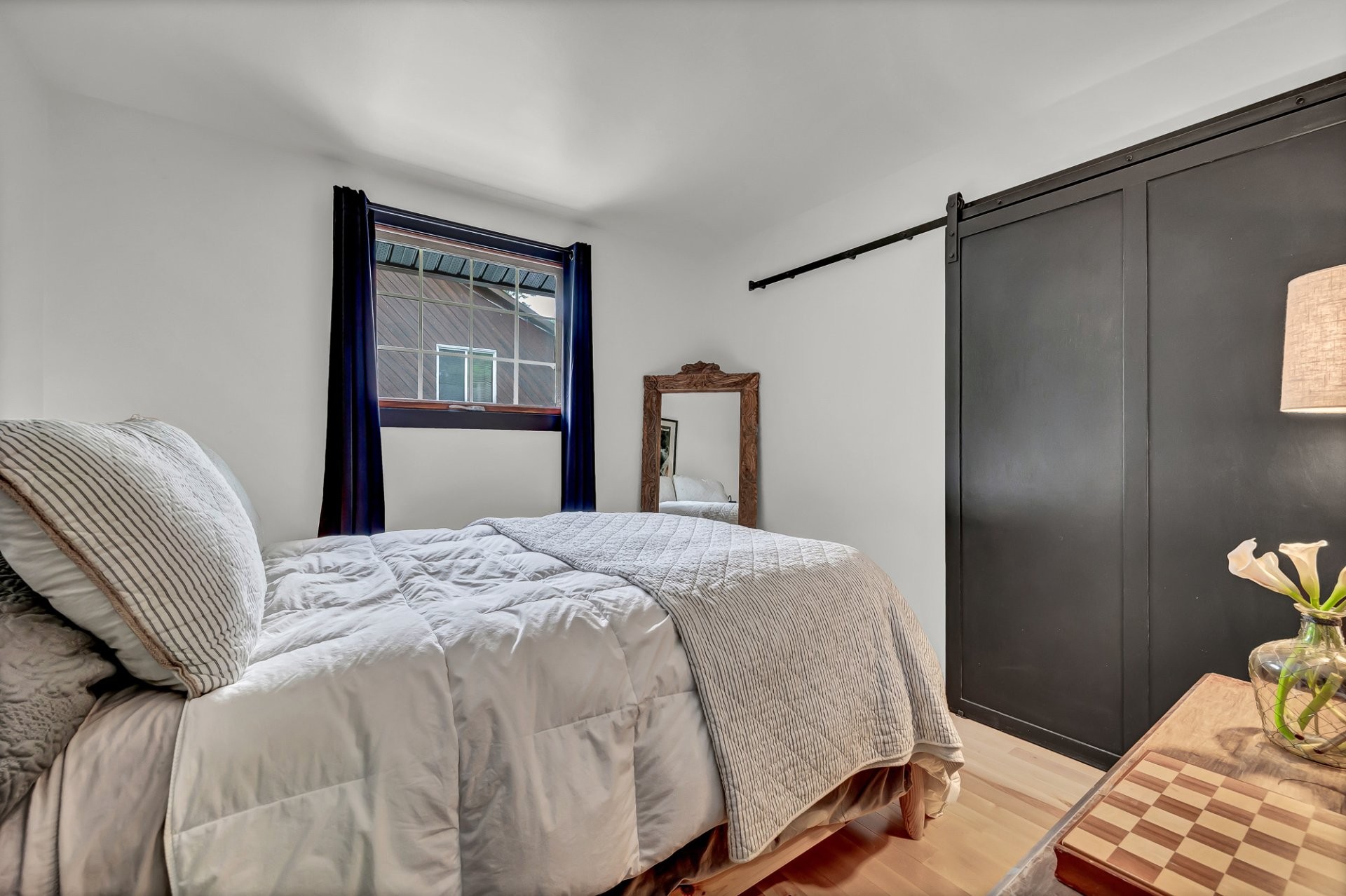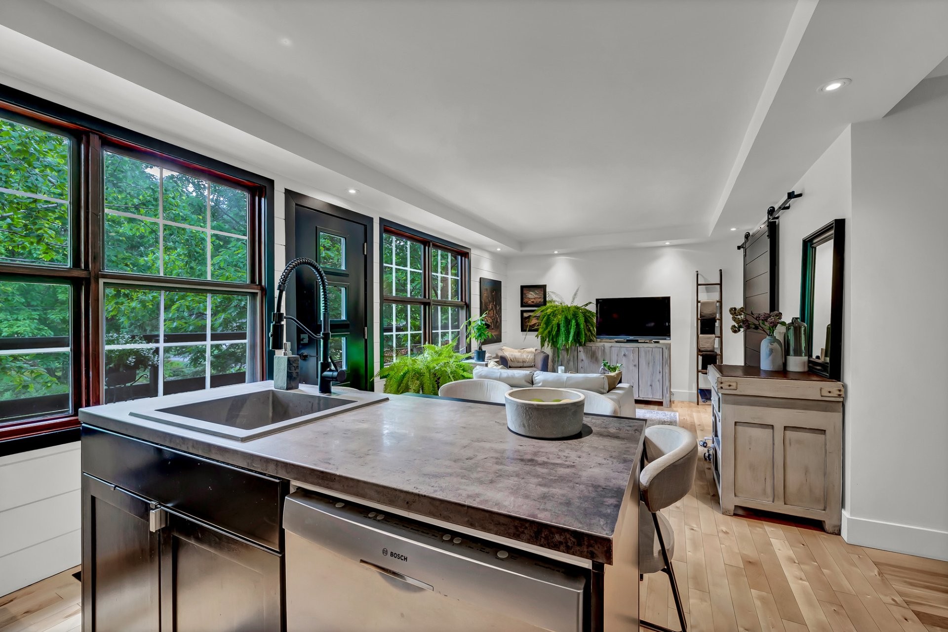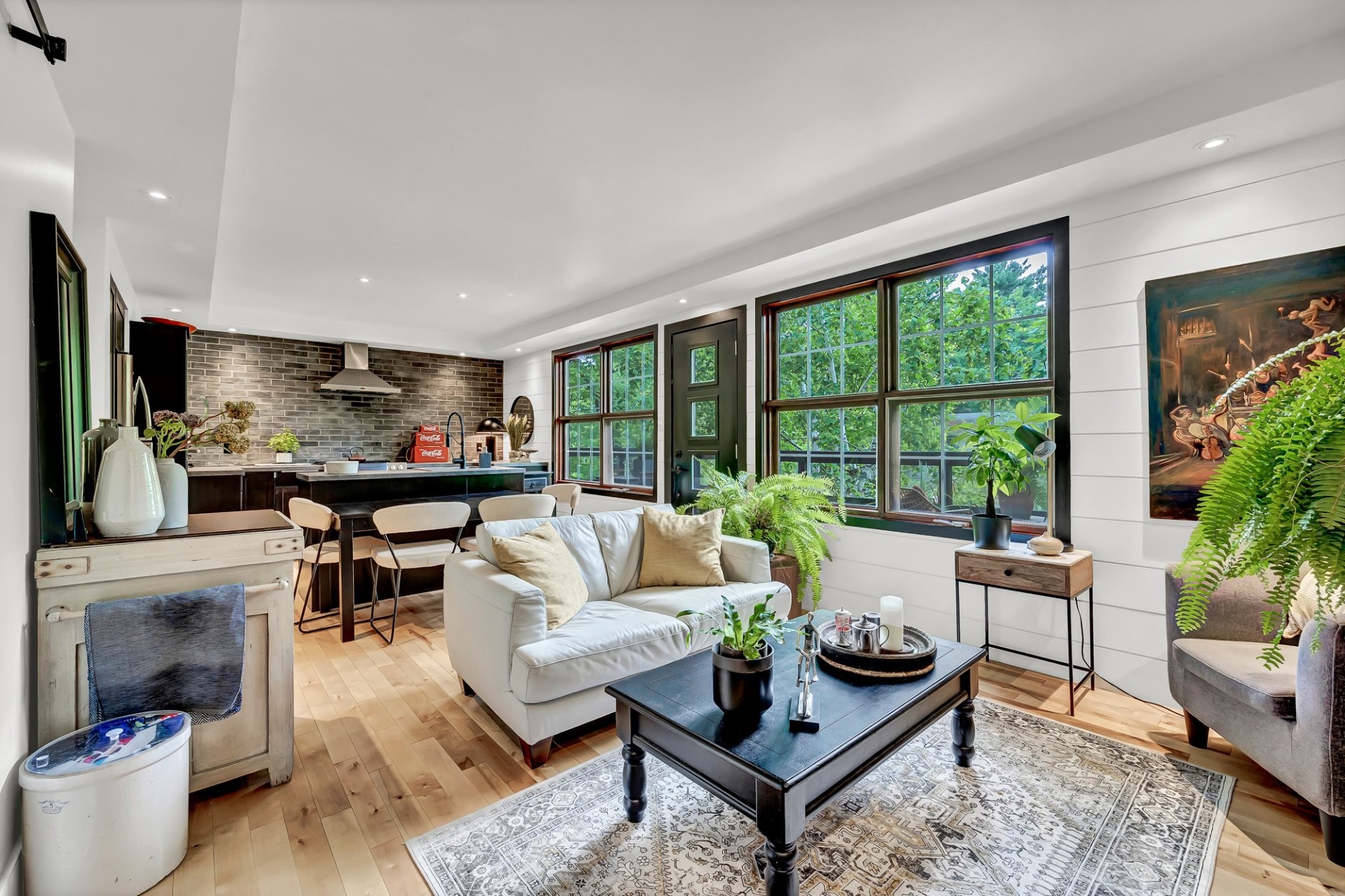 Le deuxième étage accueille également le logement intergénérationnel, qui propose une cuisine au caractère unique avec mur de pierre et îlot central, ouverte sur la salle à manger et le salon. Ce logement comprend aussi une chambre à coucher ainsi qu'une salle de bain complète, offrant autonomie et confort.
