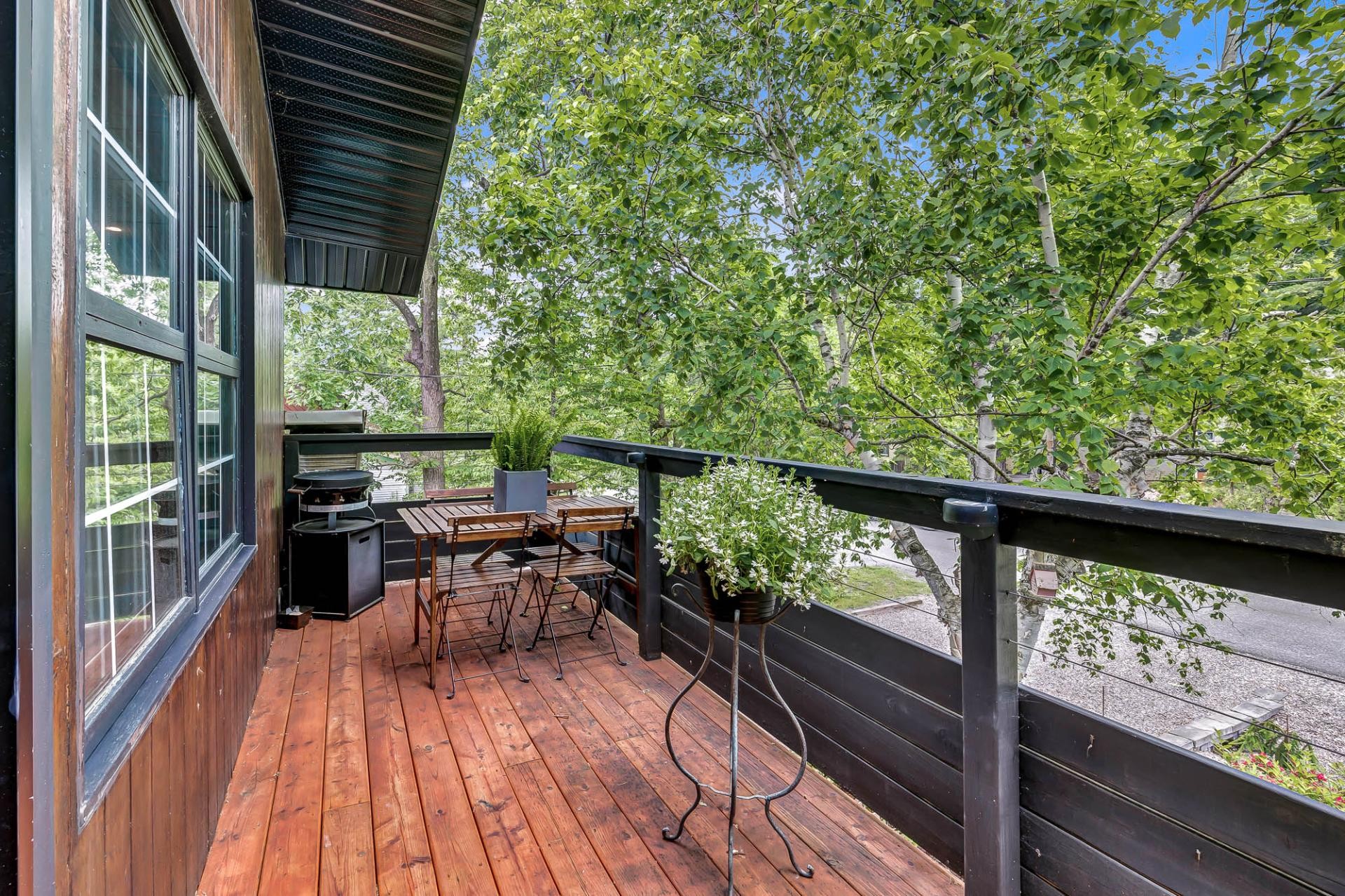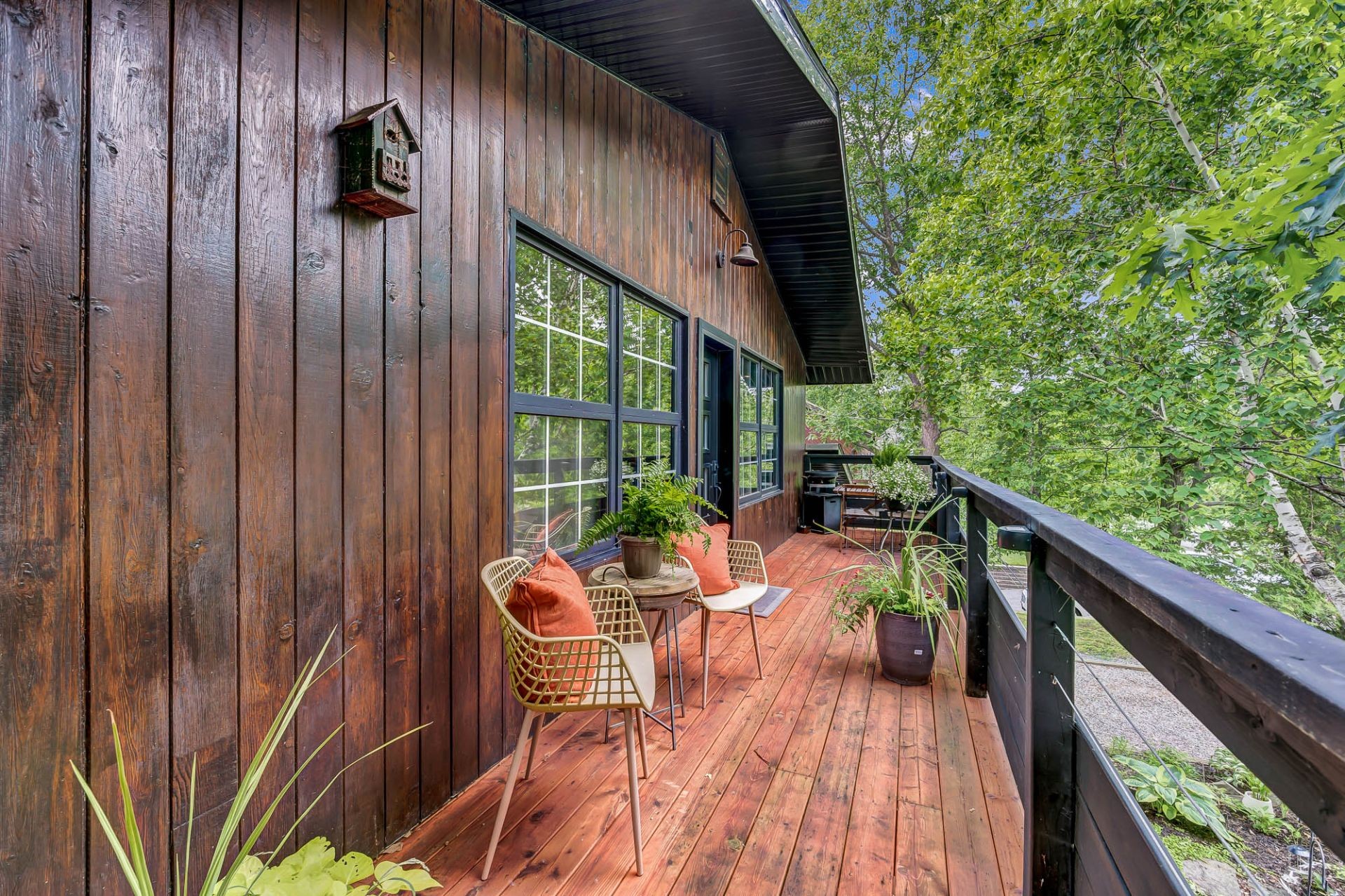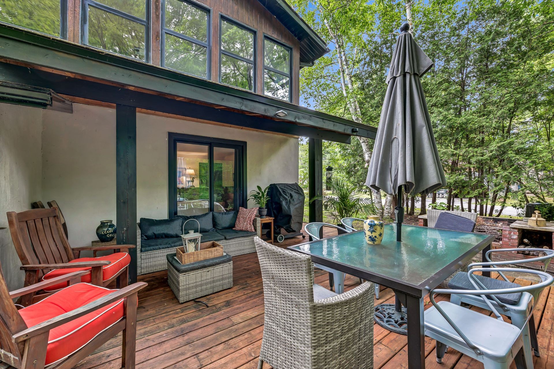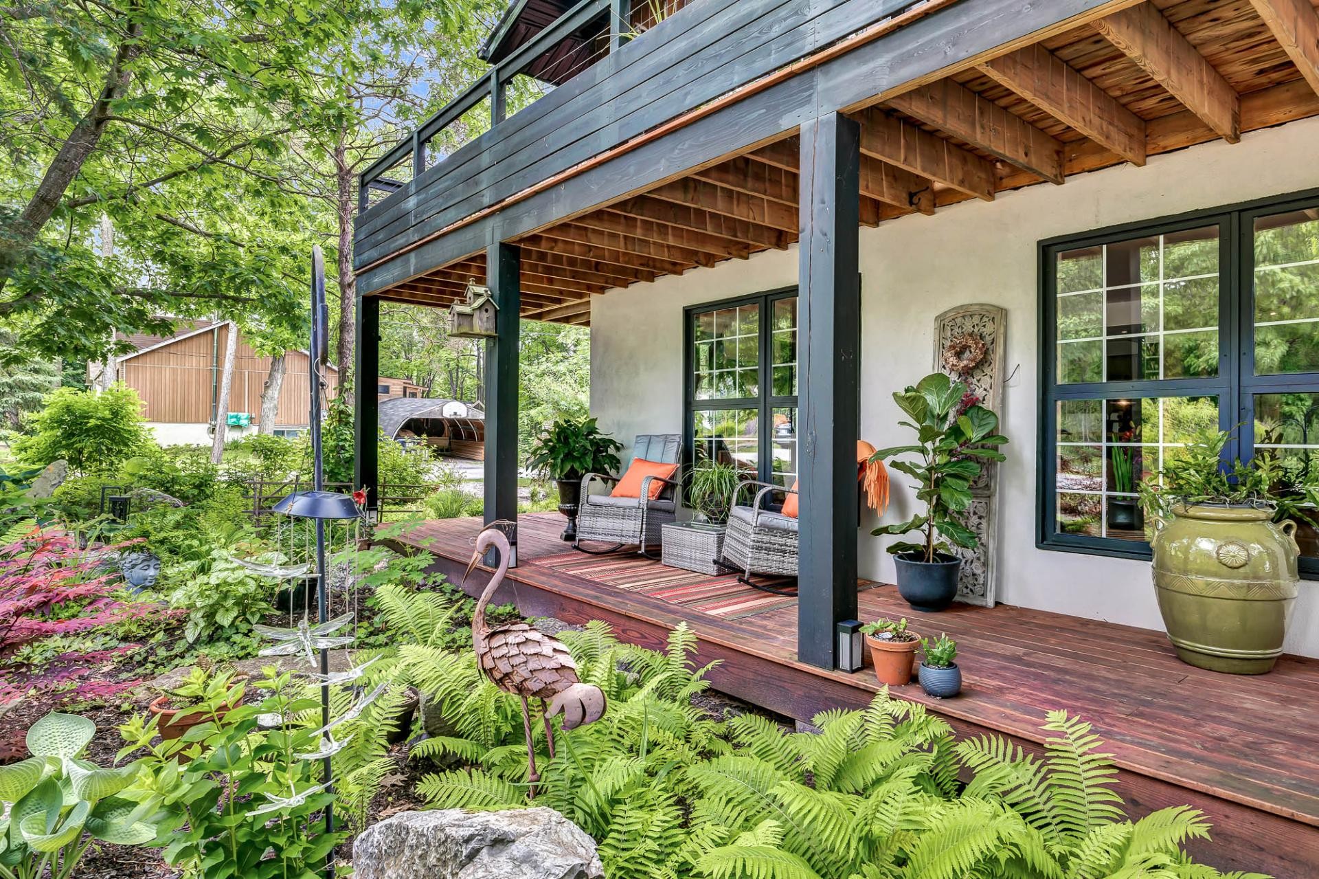 À l'extérieur, la cour arrière est aménagée avec une grande terrasse pouvant accueillir un espace repas, de vastes espaces verts et un accès à de grands balcons à l'étage. Un véritable havre de paix où nature, confort et polyvalence se rencontrent.