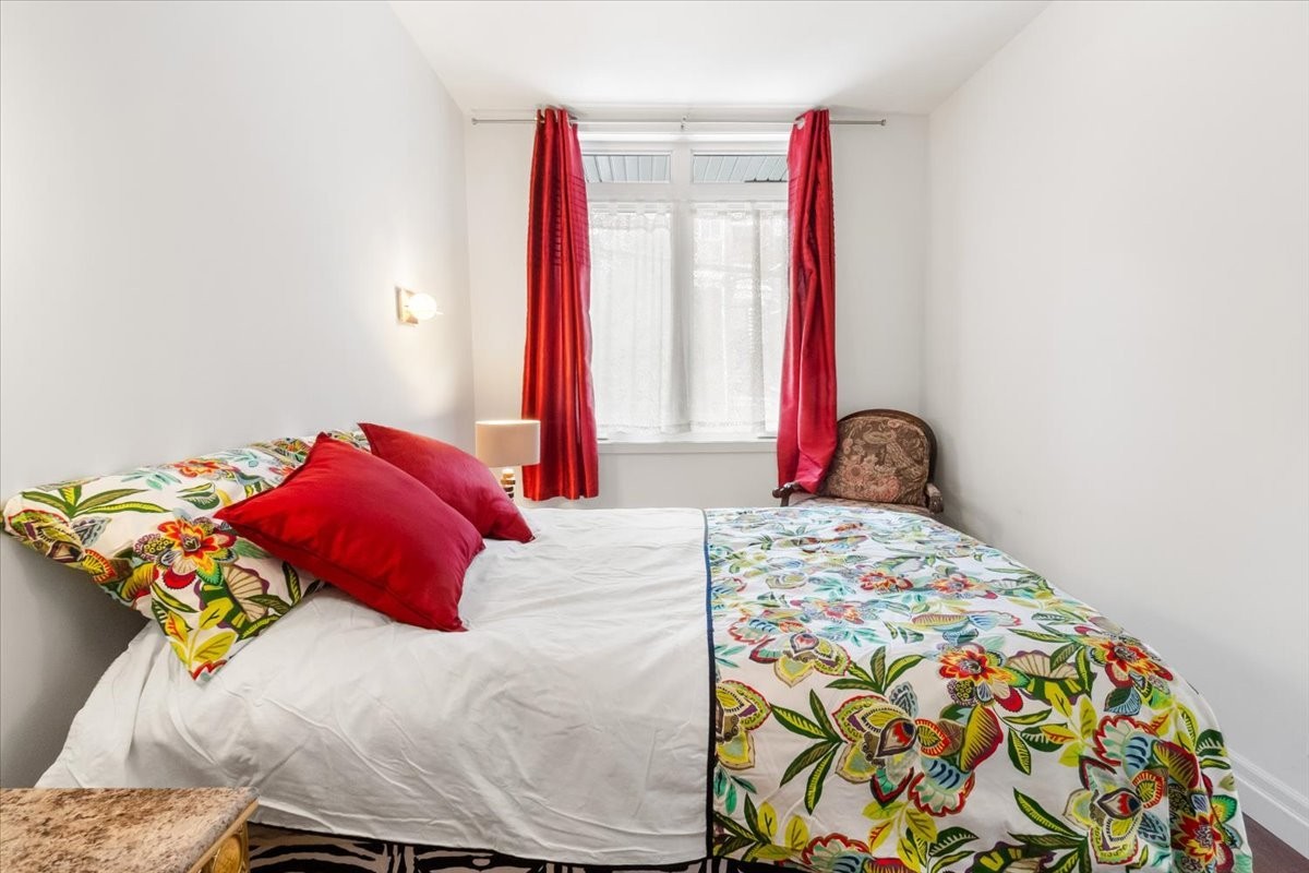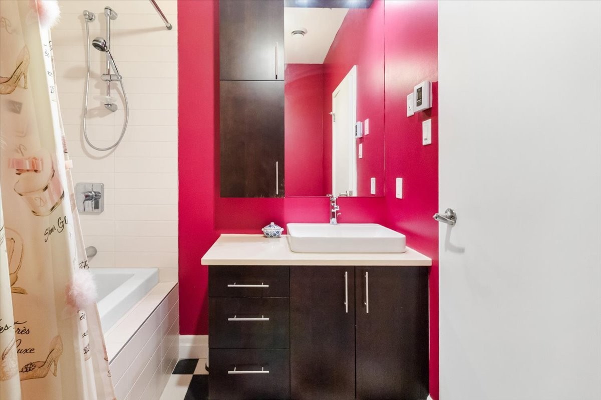 La cuisine de style designer est équipée de comptoirs en quartz, d'un dosseret en céramique vitrée et d'armoires de qualité. La salle de bain spacieuse a été personnalisée avec l'installation d'une baignoire, offrant confort et fonctionnalité. Deux grands garde-robes assurent un rangement optimal.