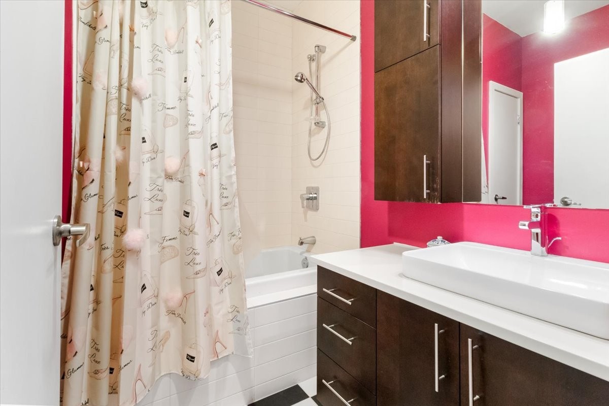 La cuisine design est soigneusement aménagée avec comptoirs en quartz, dosseret en céramique vitrée et armoires de qualité. La salle de bain spacieuse se distingue par sa douche double surdimensionnée de style designer avec panneaux de verre et finitions raffinées.
