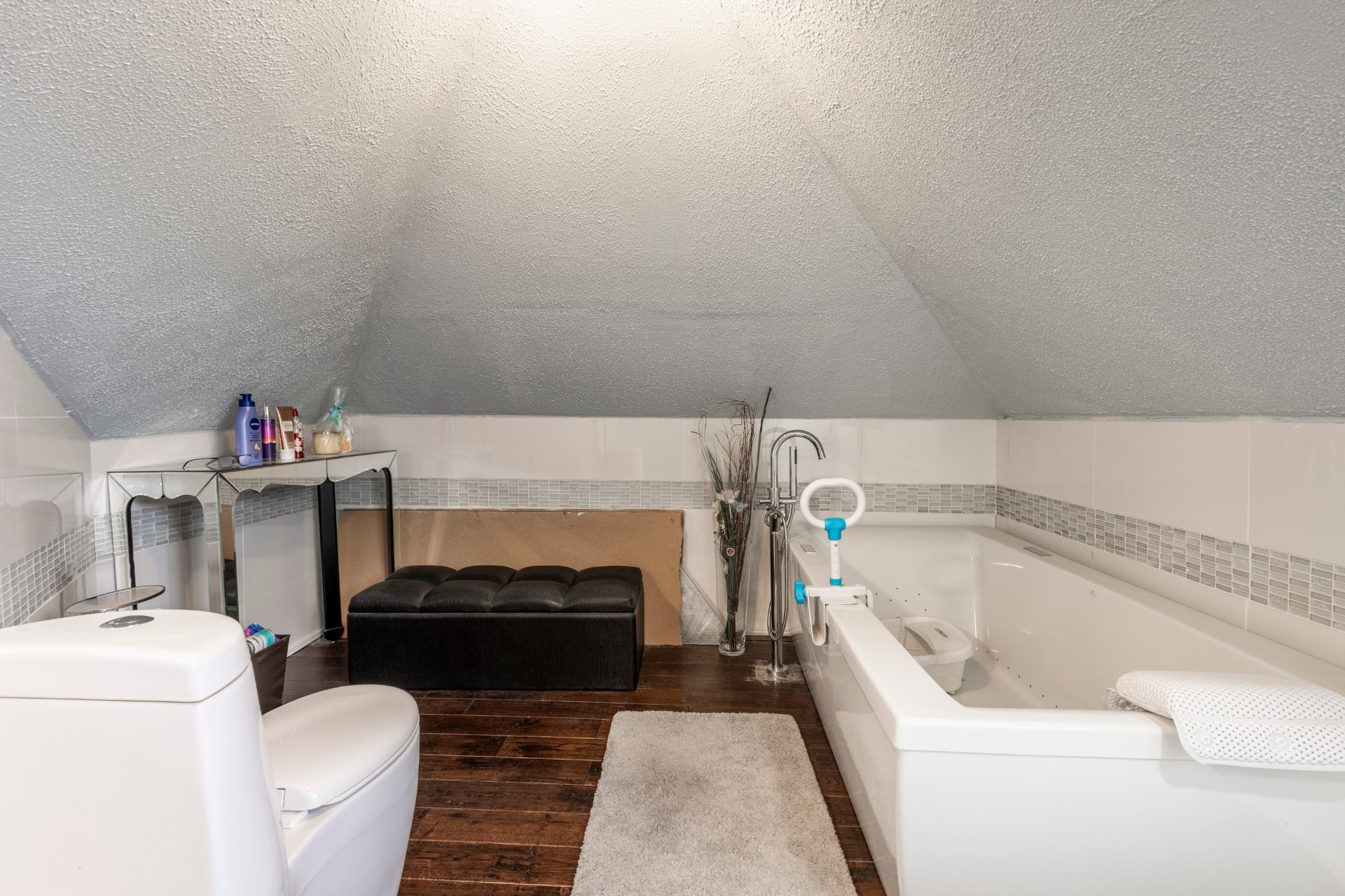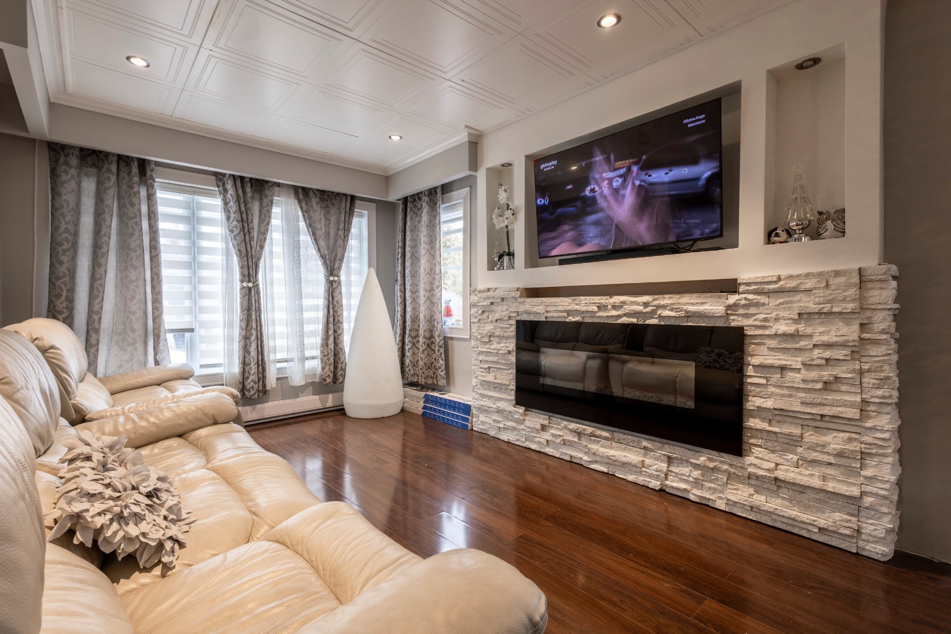 Tous les électroménagers, bain thérapeutique multi-jets dans la salle de bain de la chambre principale à l'étage, porte décorative brune coulissante sur rail de l'armoire du corridor, rideaux en tissu du salon