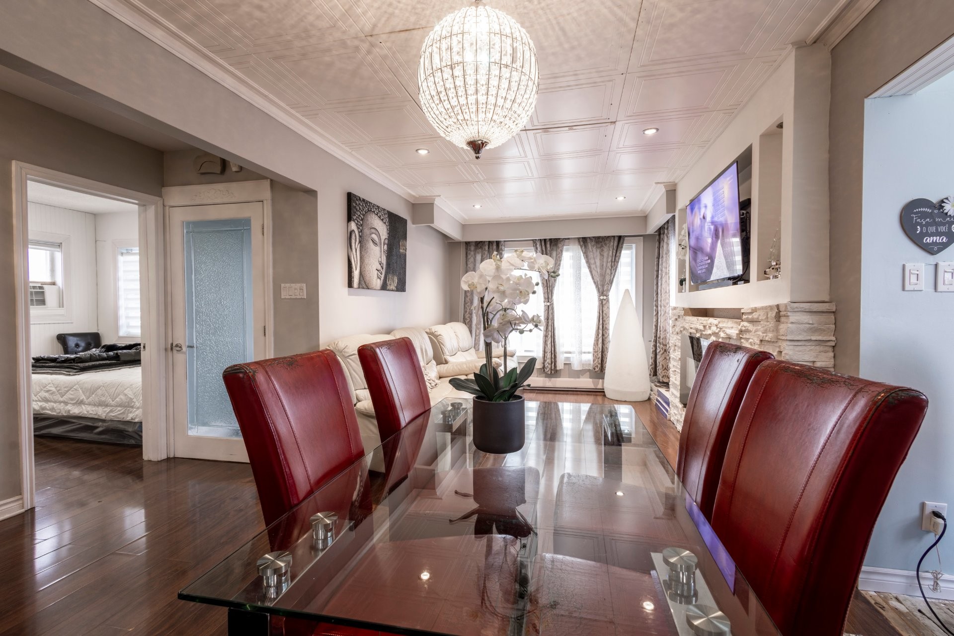 Cabanon, Air climatise de fenetre au 2e etage, store blanc dans salon et chambres, eclerage decoratif dans cuisine et salle a manger