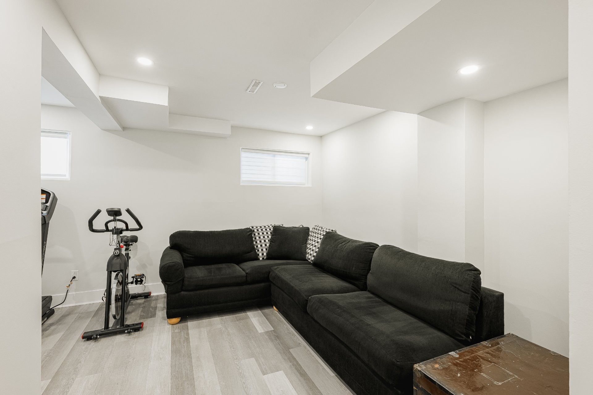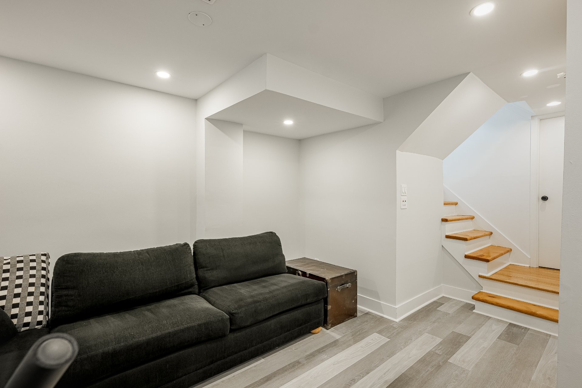 - Murs extérieurs dénudés et isolée. Retrait du plancher d'origine et installation d'un nouveau revêtement de sol en vinyle.