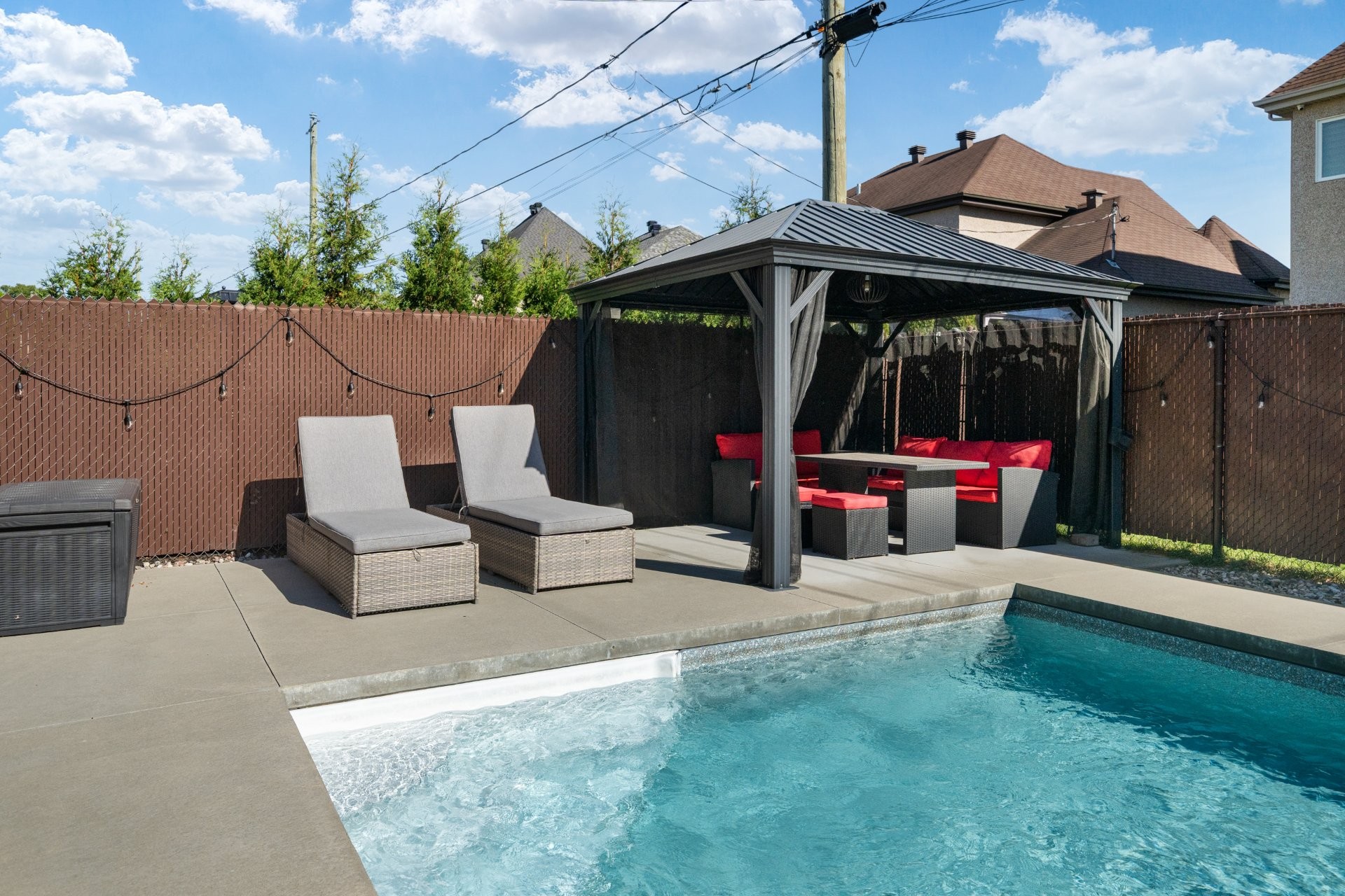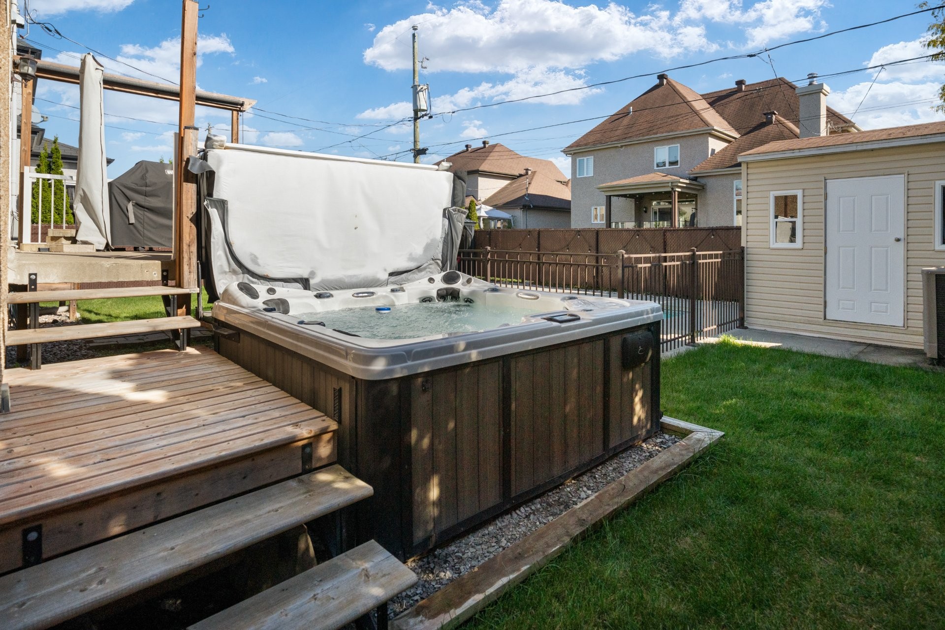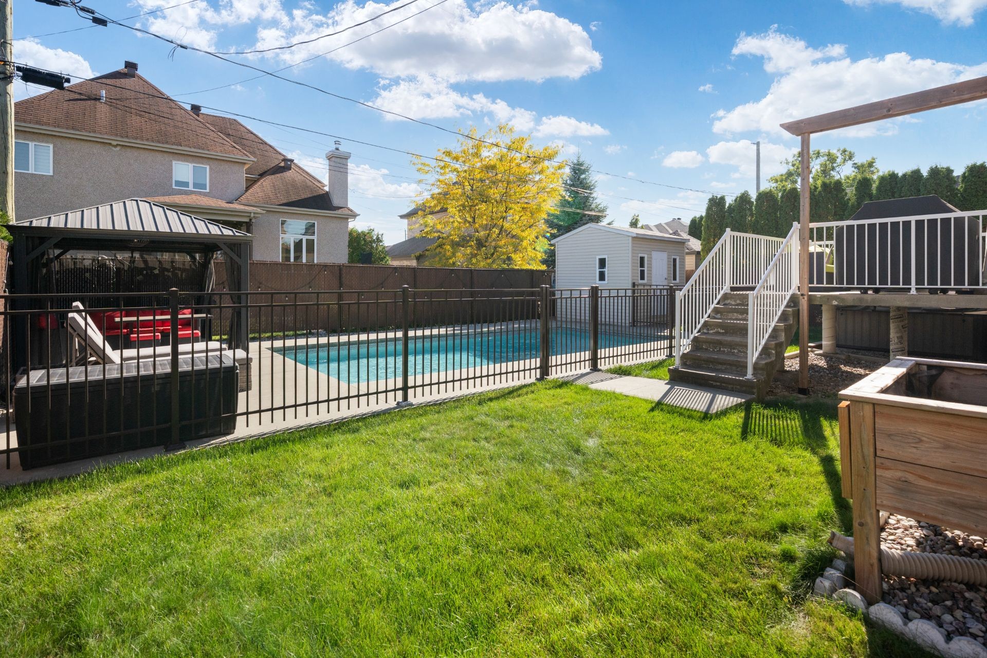 À l'étage, vous trouverez quatre chambres de belles dimensions, parfaites pour une famille grandissante, ainsi qu'une salle de bains attenante rénovée avec goût. La cour arrière est un véritable espace de détente, avec une superbe piscine creusée idéalement orientée pour profiter du soleil toute la journée, un spa et une terrasse invitant à la relaxation.