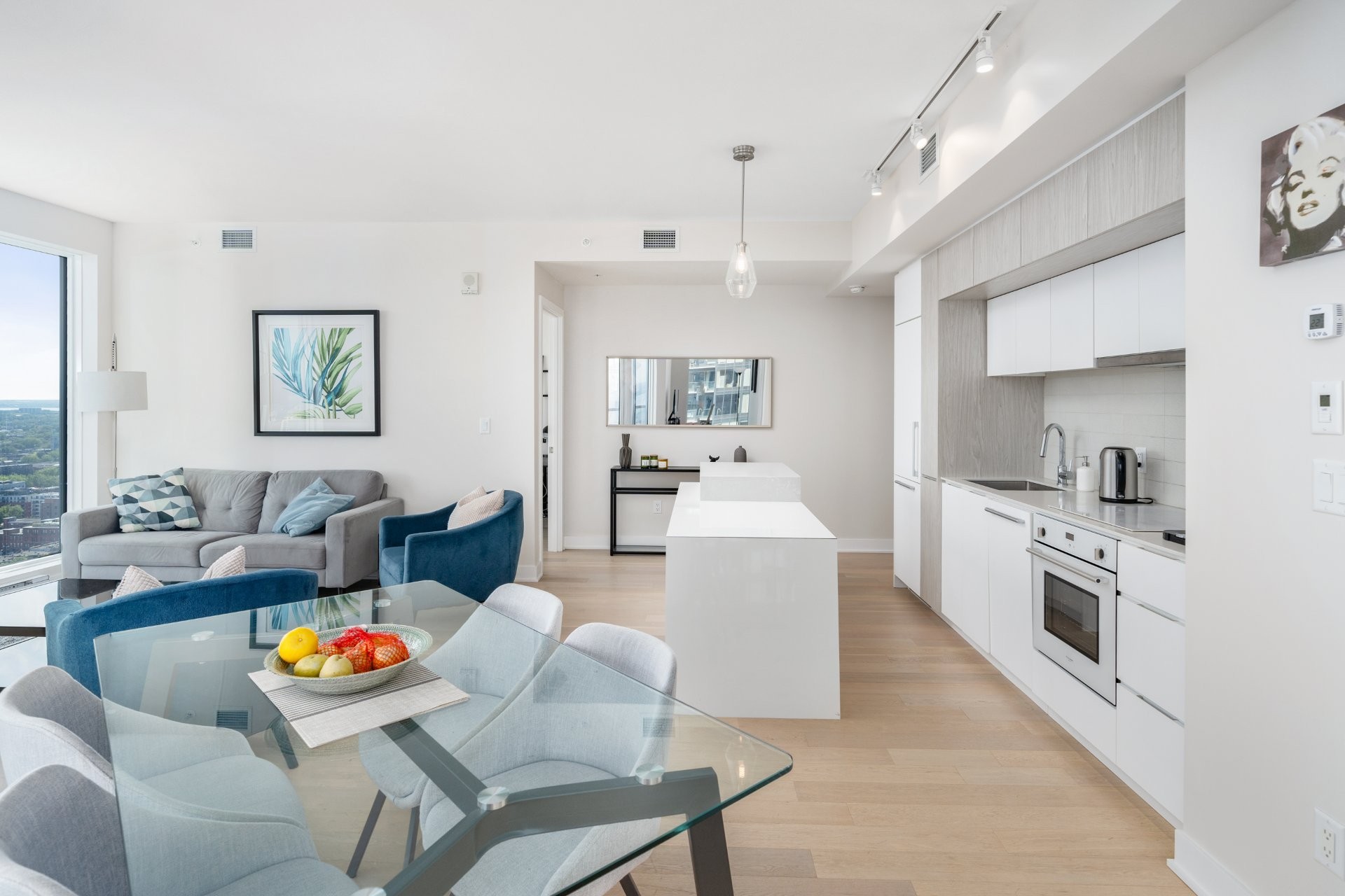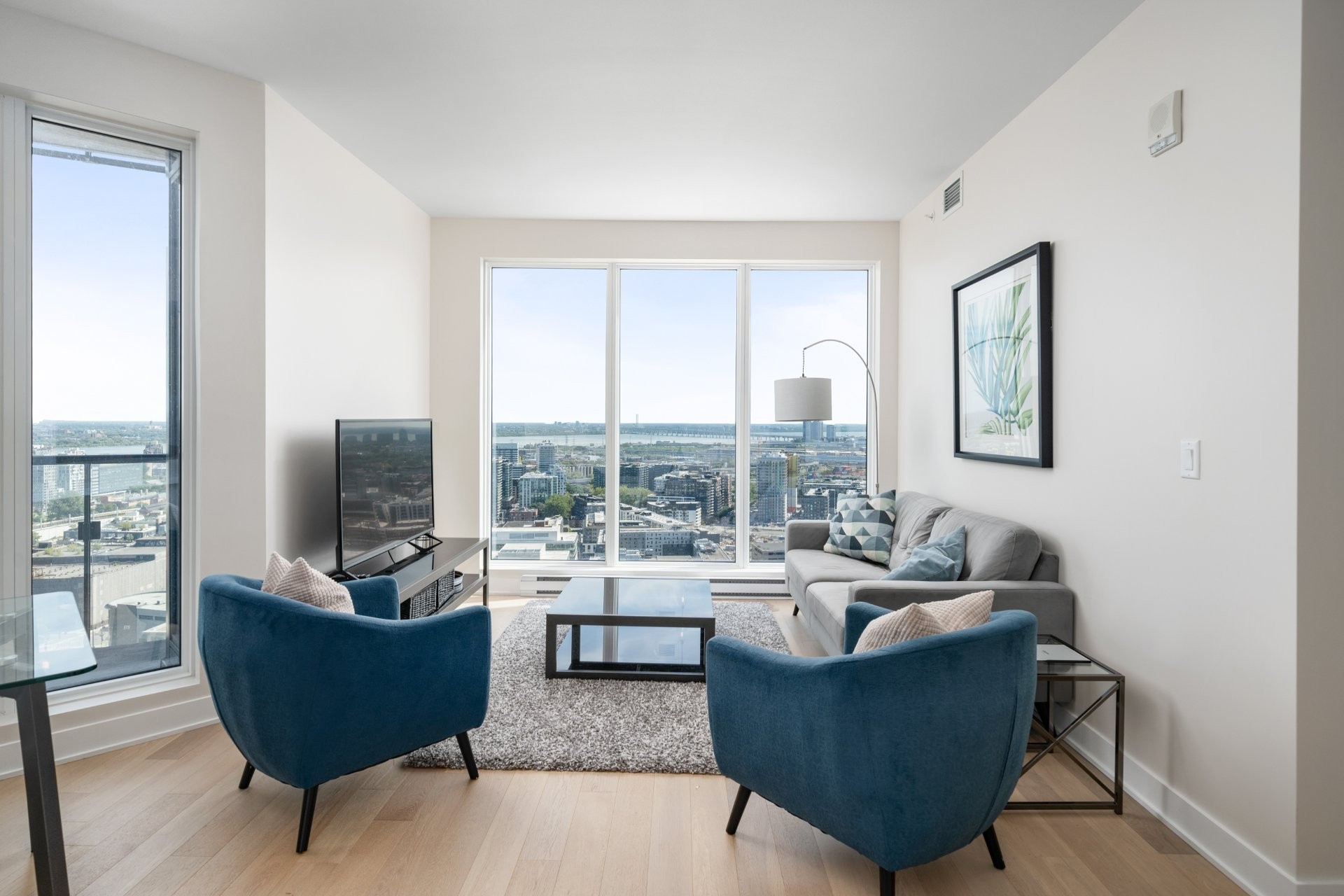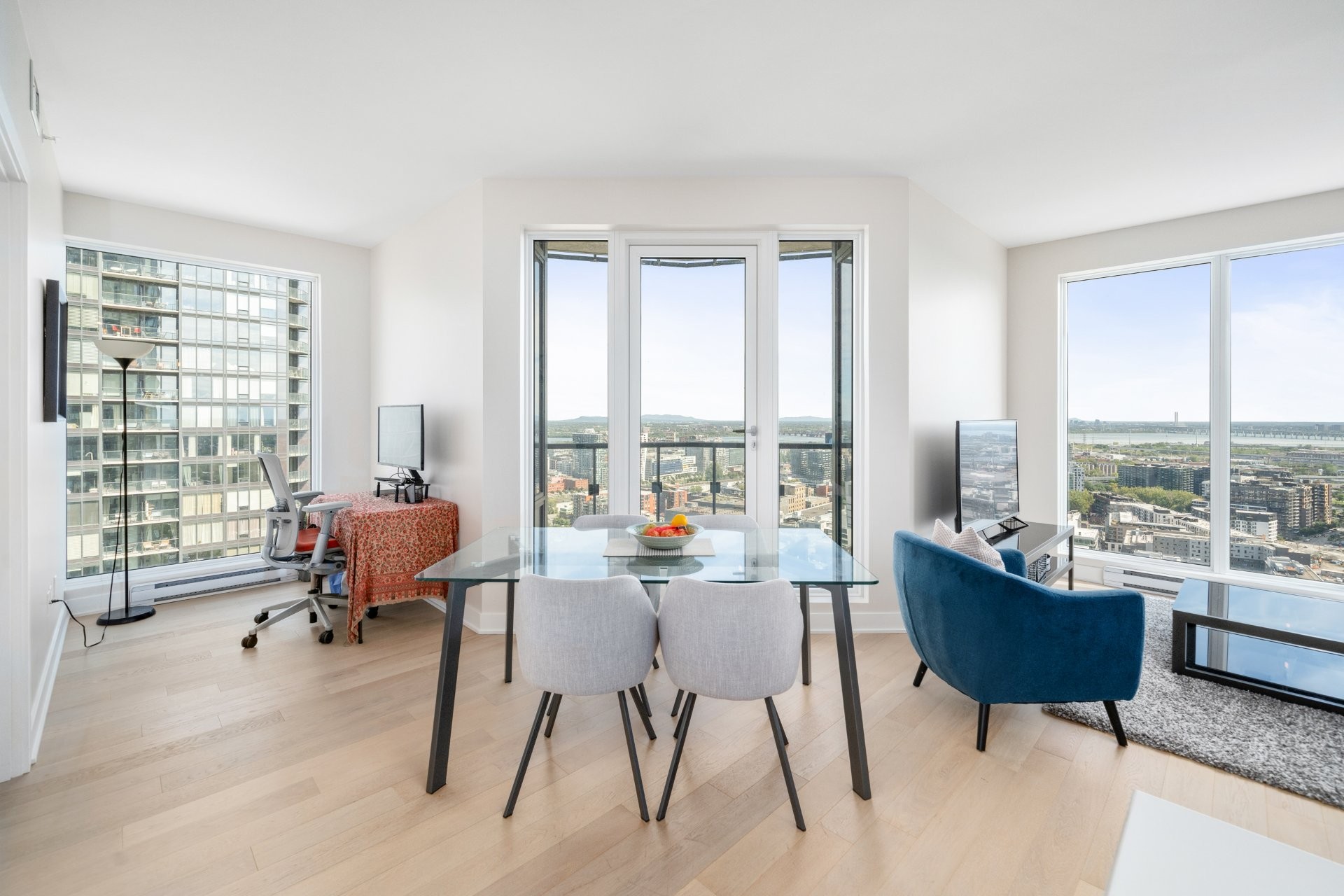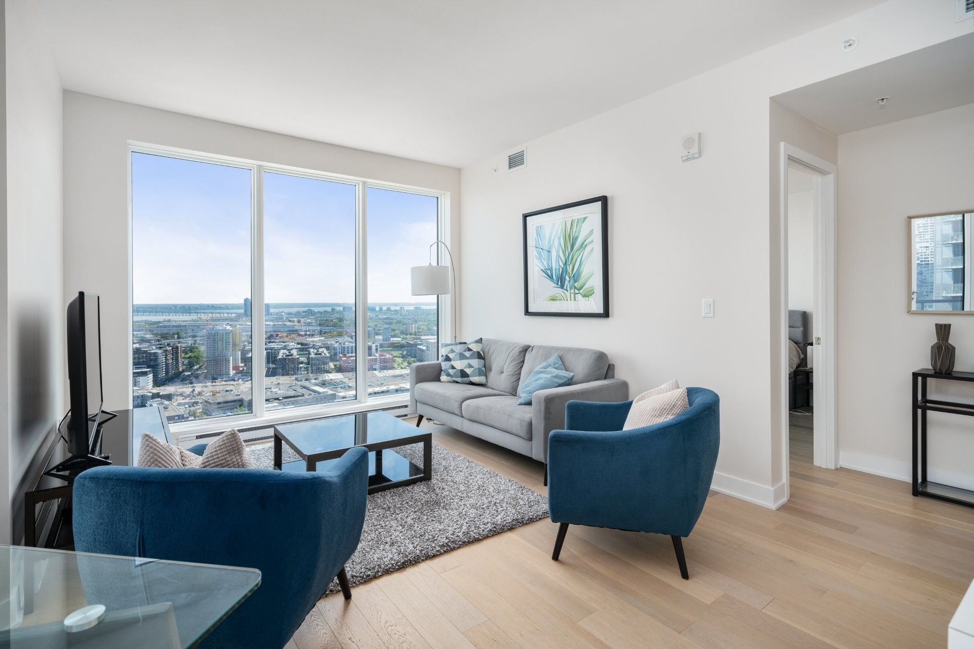 Unité de coin au 34e étage de la prestigieuse Tour des Canadiens, Phase 3. Cet appartement de luxe entièrement meublé offre une vue panoramique sur le fleuve, la ville et la montagne. Clé en main, avec des finitions haut de gamme, 2 grandes chambres avec walk-in et salle de bain, espace bureau aménagé, et cuisine équipée. Accès à la piscine intérieure, gym, sauna, spa, Skylounge. Sécurité 24h/24, accès au réseau RESO et aux stations de métro Lucien-L'Allier et Bonaventure. Non-fumeurs, animaux non permis. Possibilité de louer pour moins de 12 mois à un loyer plus élevé.