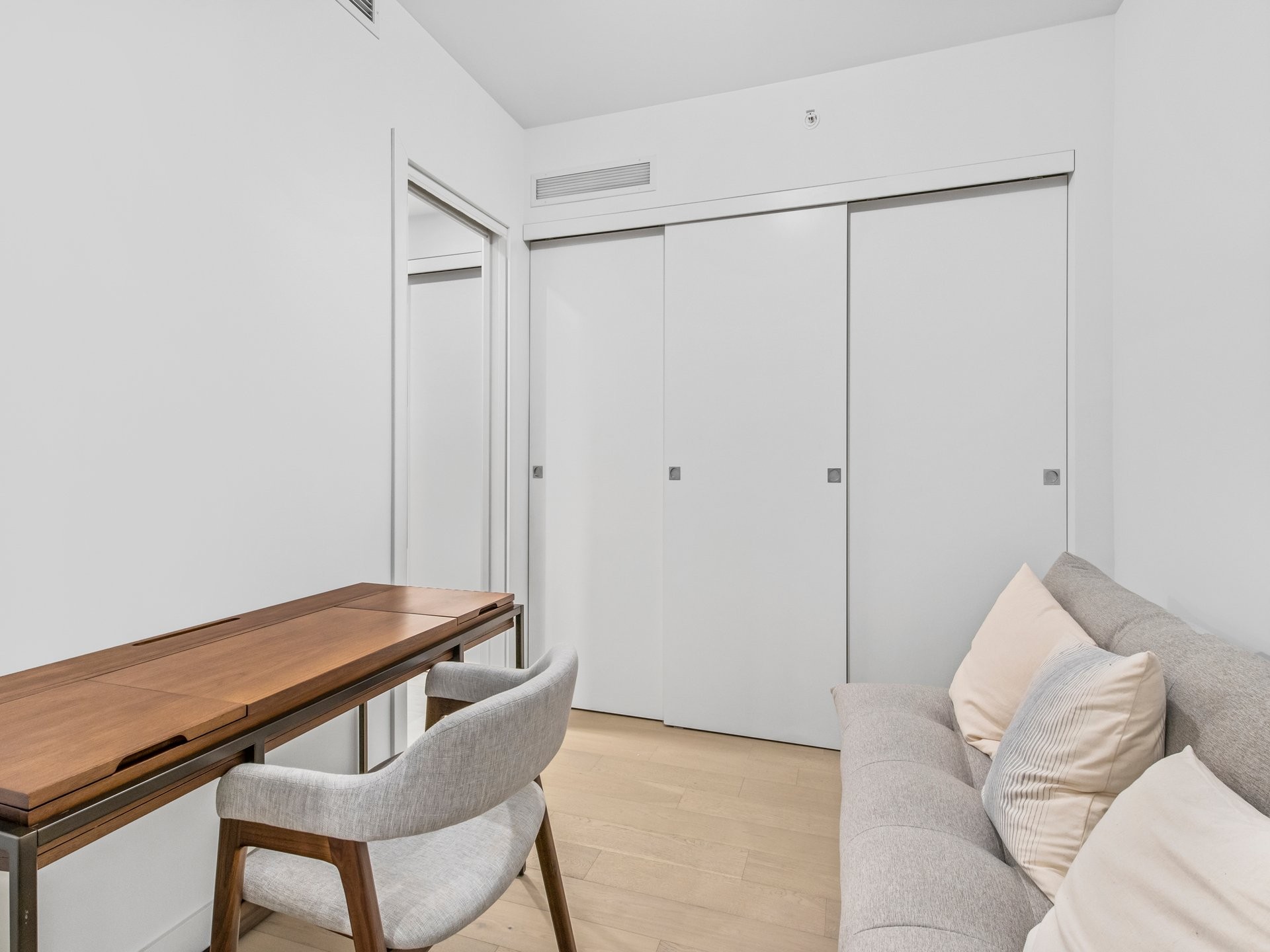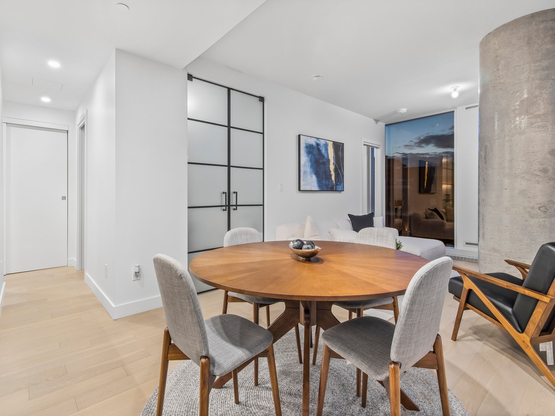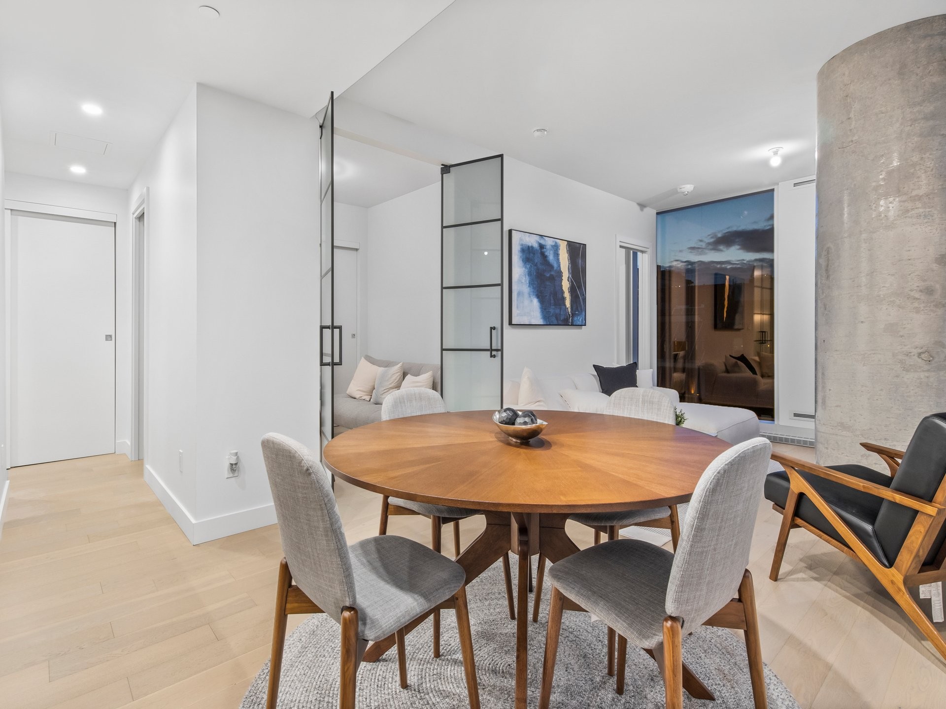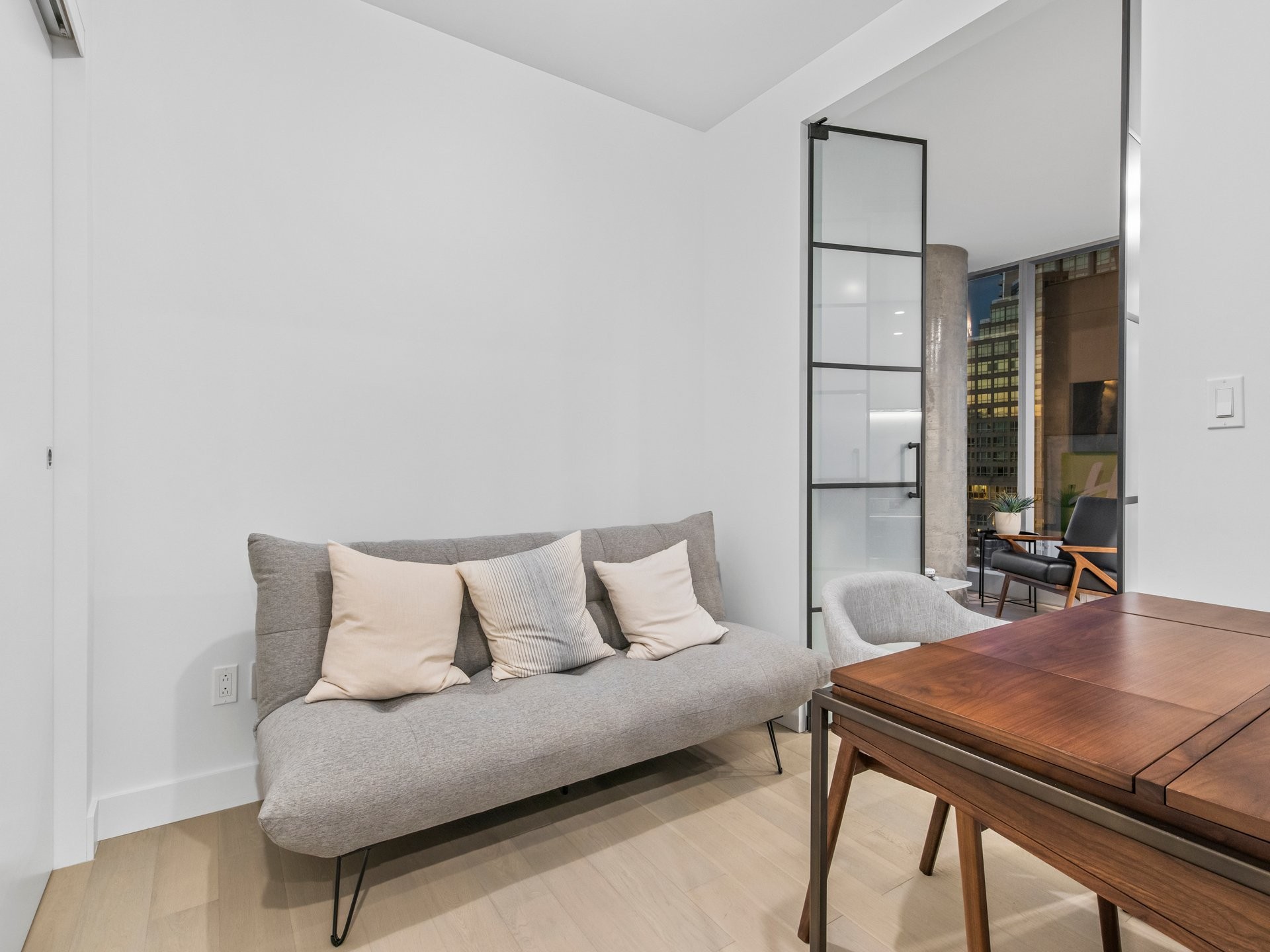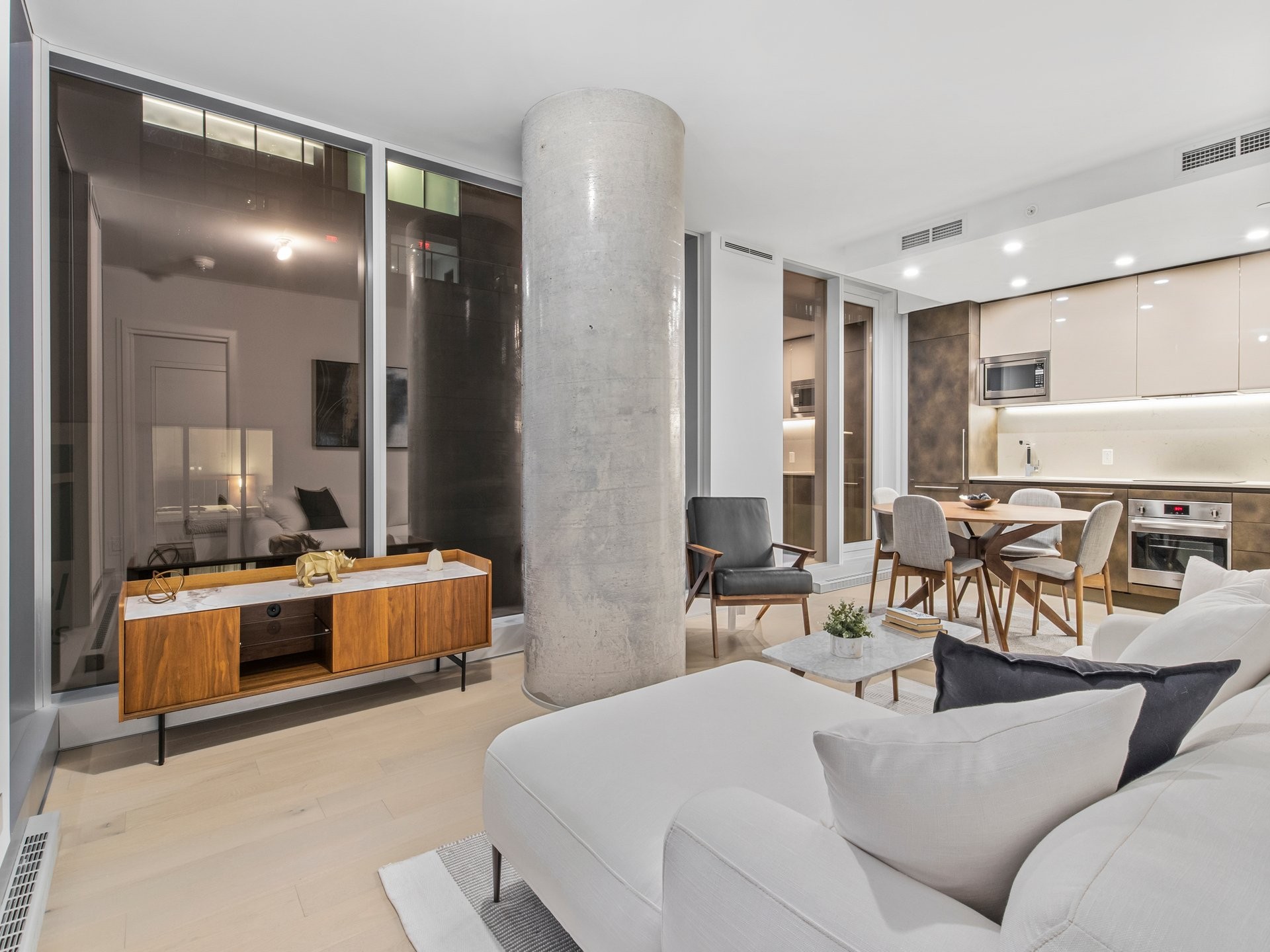 Unité de coin partiellement meublé moderne au YUL avec 2 chambres, 1 salle de bain et espace lumineux à aire ouverte. Fenêtres pleine hauteu...