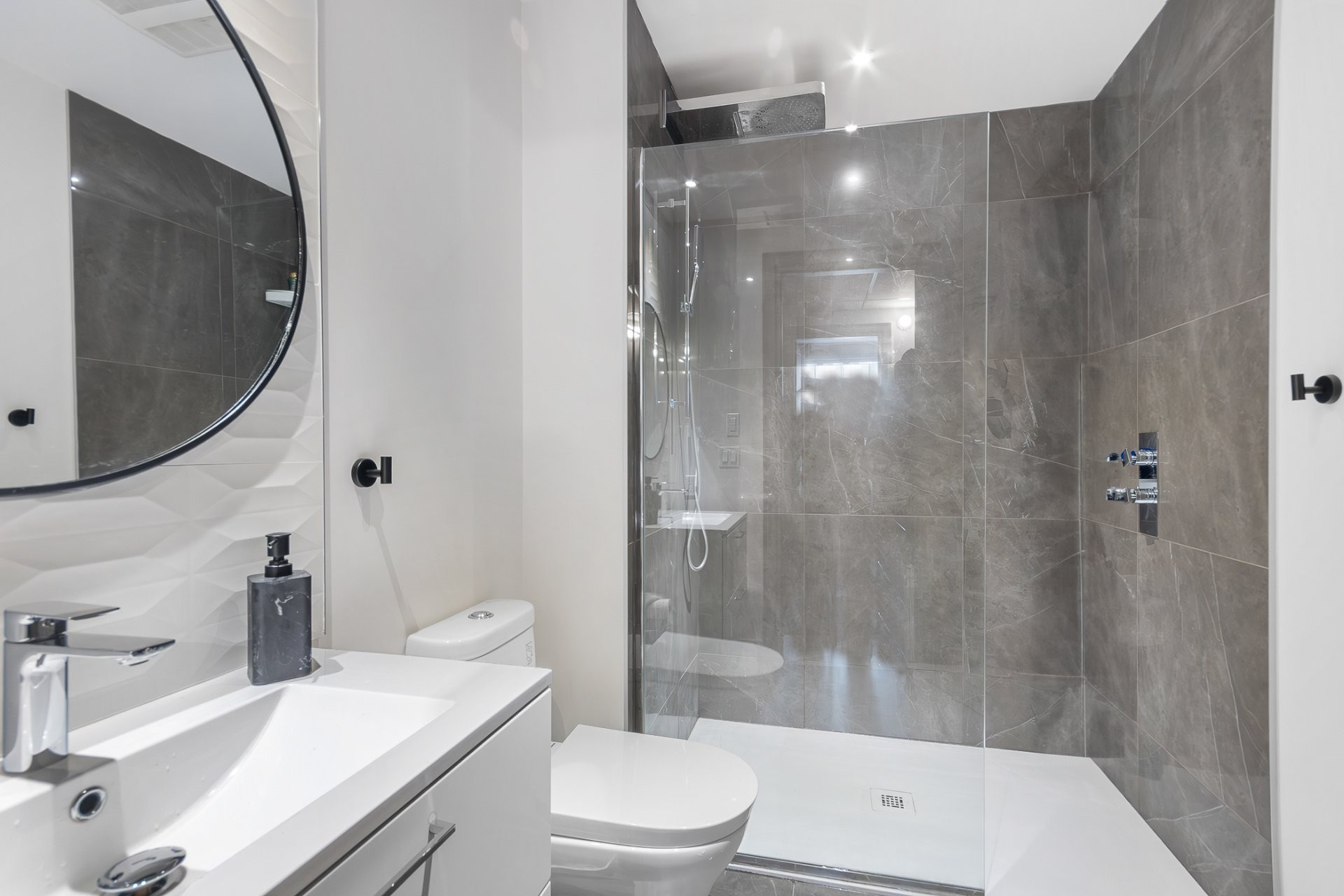 - Les deux salles de bains comprennent un dosseret en céramique, une finition vernie sur les deux meubles-lavabos et l'ajout de céramique dans la salle de bains principale, avec une tête de douche à effet de pluie