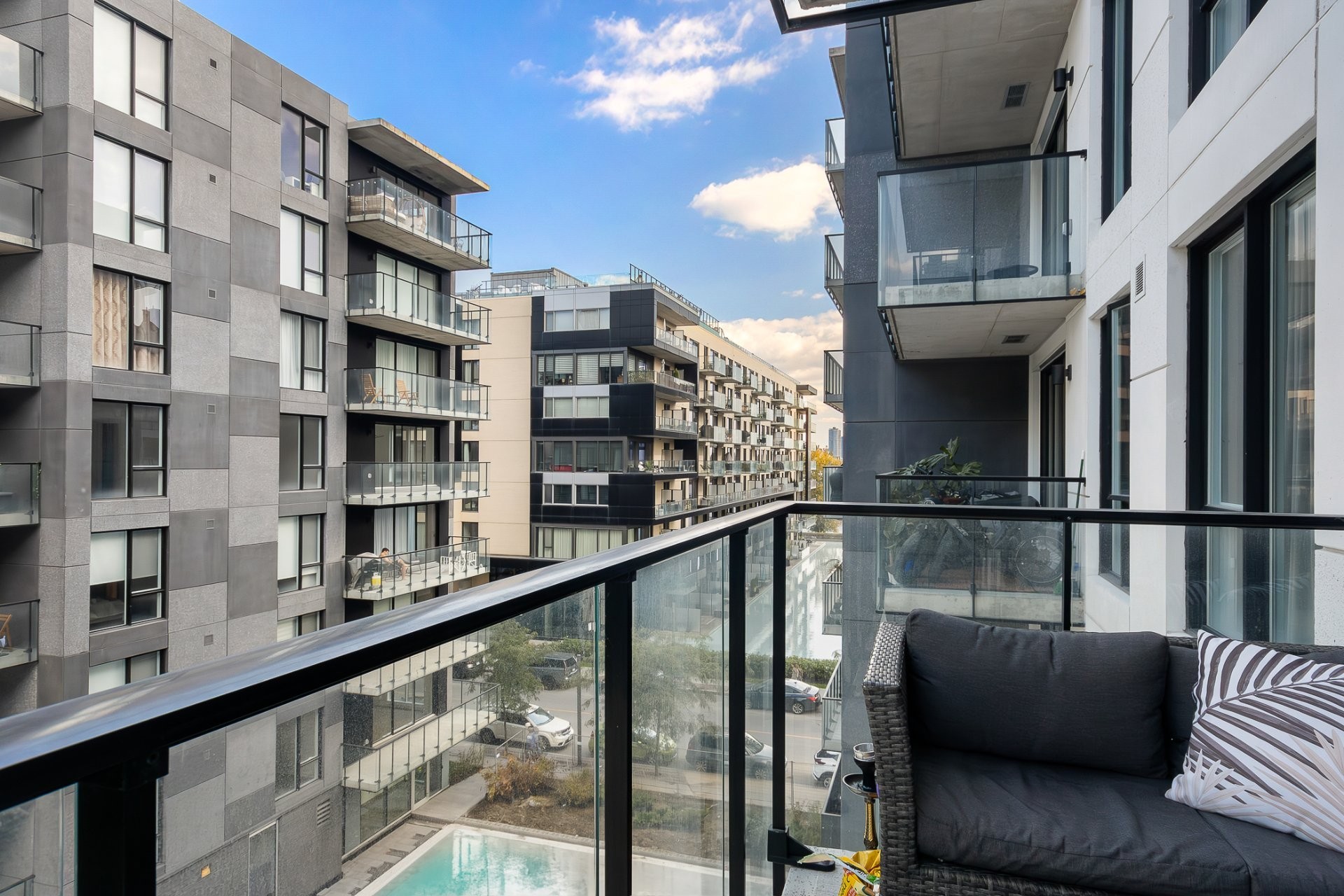 - Grand balcon (6ft x 12ft) donnant sur la cour intérieure, qui contient le bassin d'eau et offre une vue sur l'horizon de la ville et le canal