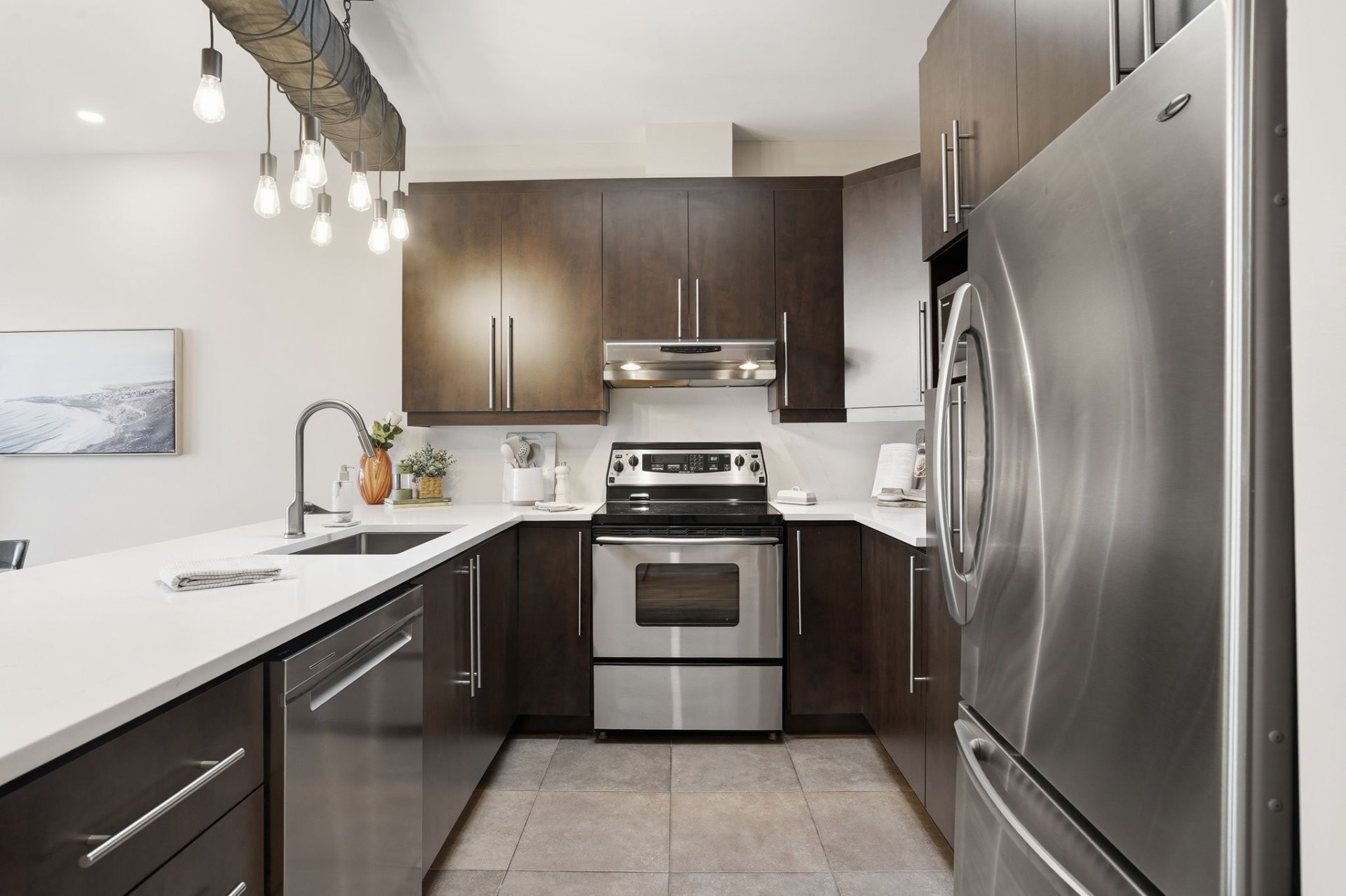 Cette unité au dernier étage se distingue par ses plafonds de 9 pieds et ses deux puits de lumière qui apportent une abondante lumière naturelle. Le salon propose une aire ouverte qui s'harmonise parfaitement avec la salle à manger. Des comptoirs en quartz sont installés partout dans le condo, autant dans la cuisine que dans les salles de bain, offrant une finition élégante et uniforme. La cuisine comprend des armoires de qualité et une disposition pratique pour le quotidien.