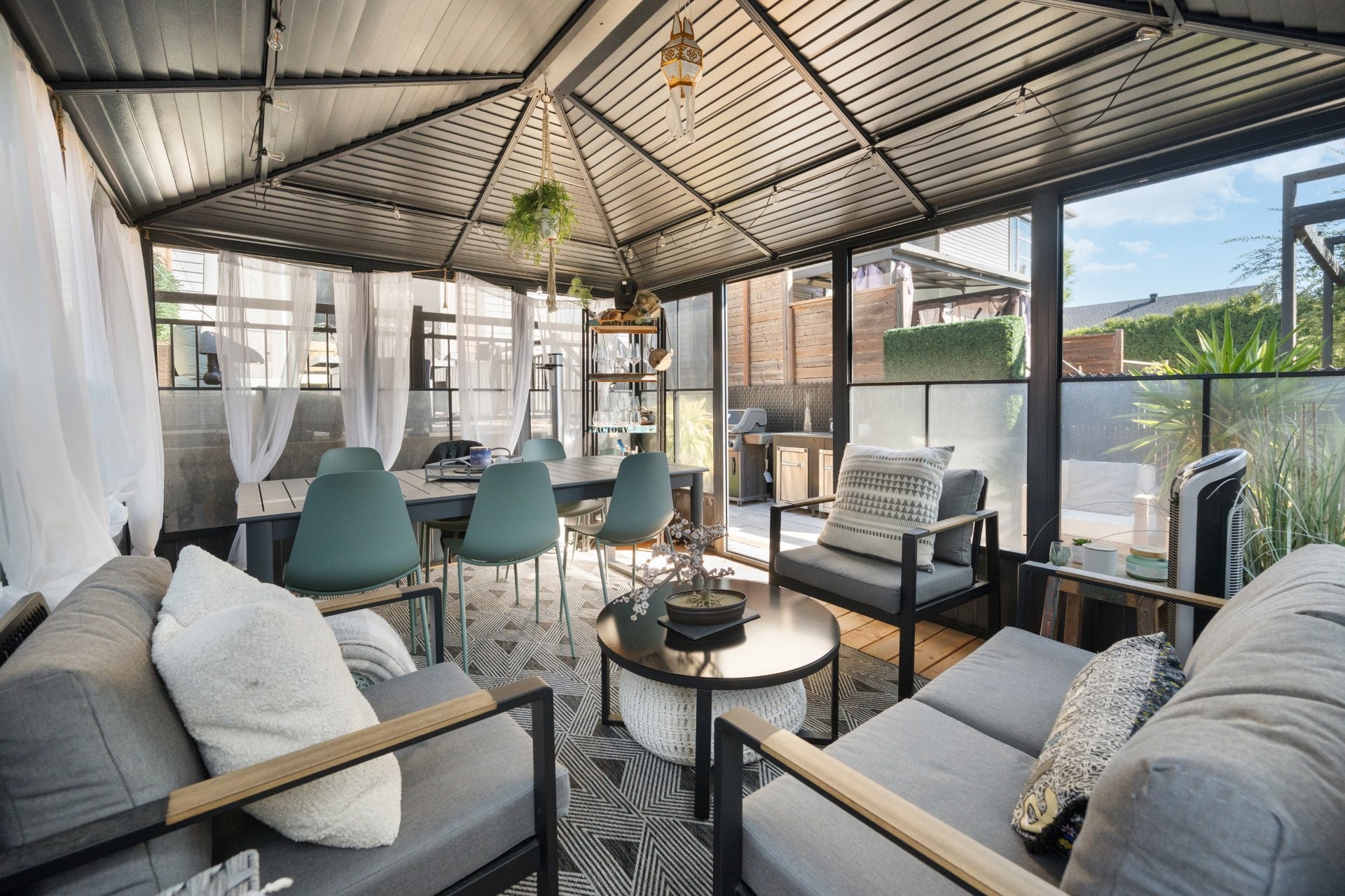Pôles, rideaux transparents au sous-sol et à l'étage, rails et stores sur mesure, Lave-vaisselle, Luminaires, Foyers électriques dans la chambre principale et le salon, Gazebo extérieur, Balayeuse centrale